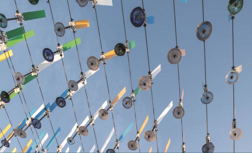 Architect Thom White of Norfolk’s WPA has designed a 12-sided wooden structure resembling a 4-tiered birthday cake. Art glass embellishments representing the animals of the Chinese zodiac and the constellations of the western zodiac will catch the light of the sun and sparkle like sugar in the distance. Plywood panels line each faceted tier and have perforations which recall cake icing embellishments while letting wind pass through. Flexible LED light strips are draped along the top of each level, adding to the icing motif. A propane-fueled “poofer” on the top-most tier will provide flame effects that will fire off at least once per hour at night.