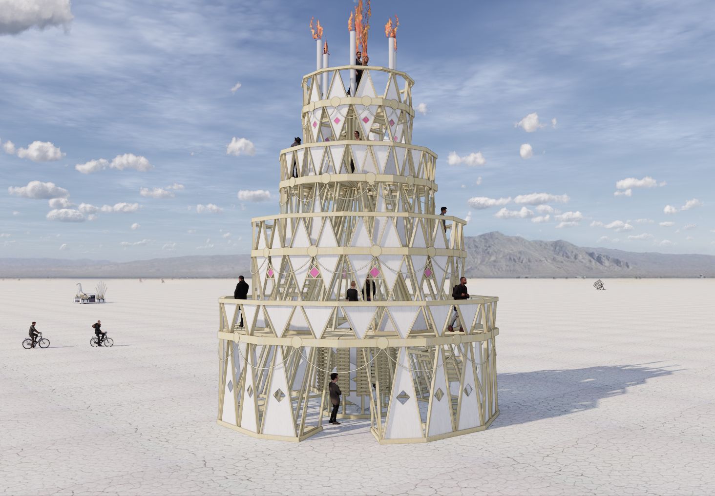 “Our mission has evolved since work began over a year ago. At first, the Cake was thought of primarily as a place to gather, play, and observe Burning Man’s Black Rock City. Then, as the work progressed and construction began, we realized the piece is a singular work of art with vast potential for embedded meaning. MEGA CAKE facilitates a journey through the distinct moments that people encounter along the arc of one’s lifetime.”