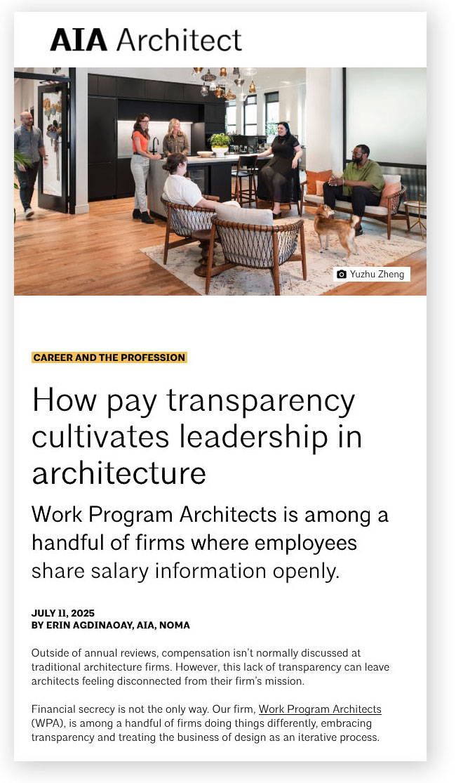How architects engage with their work changes when they’re given access to the full financial picture. At Work Program Architects, it has resulted in more trust, more clarity, and more shared ownership. In a new essay for the American Institute of Architects, Associate Principal Erin Agdinaoay describes how WPA’s open-books policy has shaped not only her own leadership journey but also the firm’s culture as a whole. She writes: