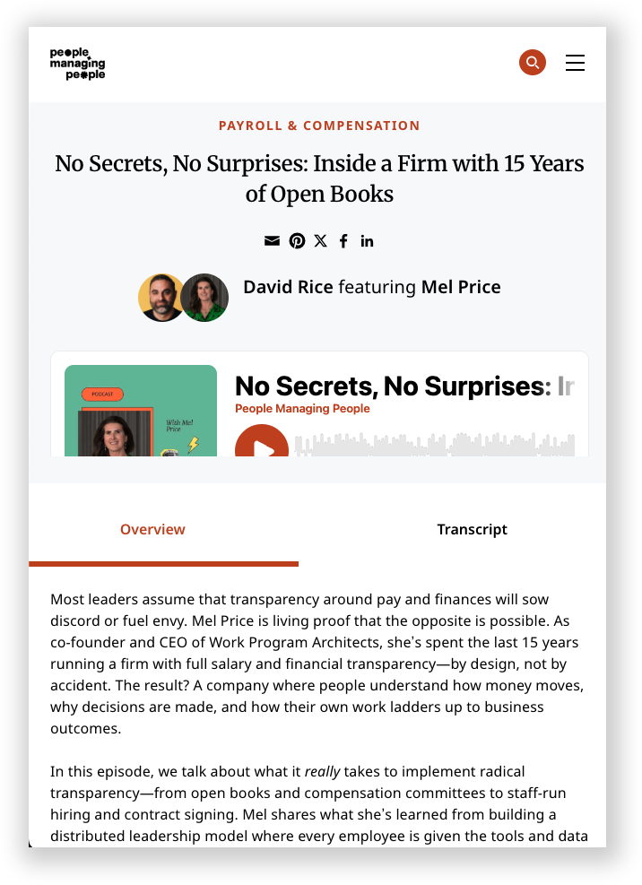 Listen to the entire conversation on the People Managing People website. The episode is also available on Apple, Spotify, YouTube or your favorite podcast platform.