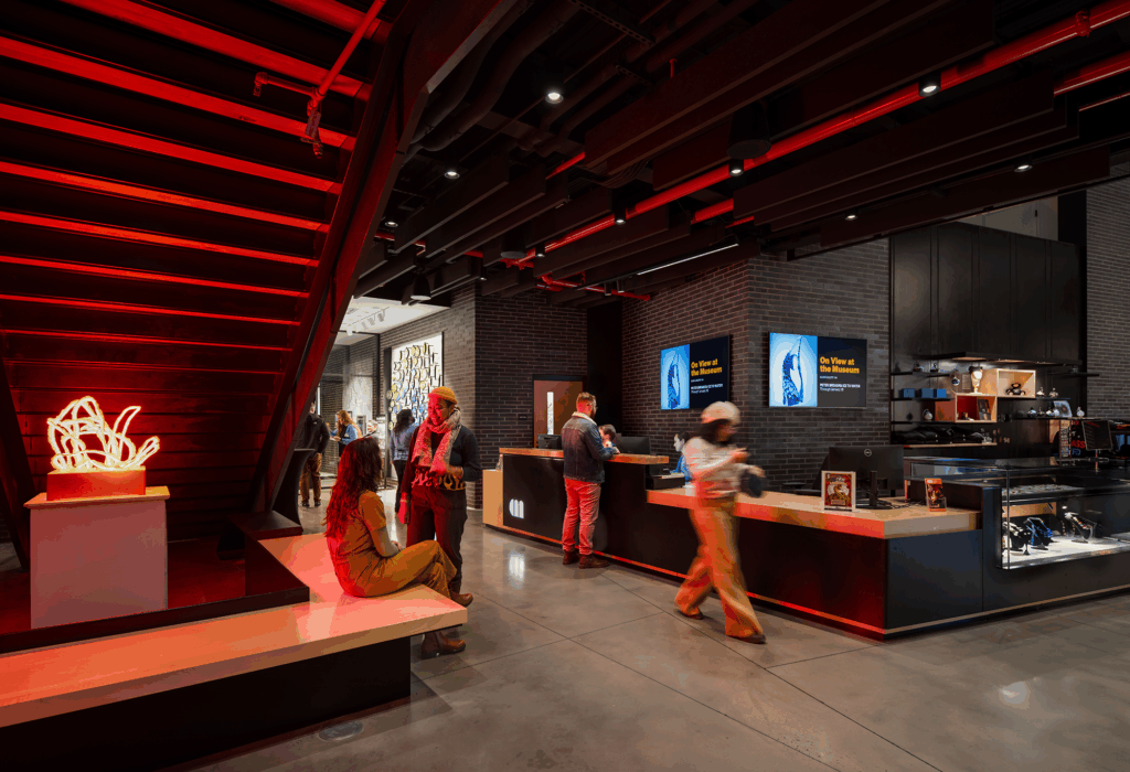 Constructed from dark brick and light terracotta, the two-story building is elevated on a planted terrace to address site-level flooding. Its entrance is angled toward the main Chrysler building across the street, a subtle alignment that Lewis describes as a “genuflection” toward the museum, quoting Crawshaw. Inside, the central feature is a black-box theater hot shop with seating for 200, designed for both production and public demonstration.
