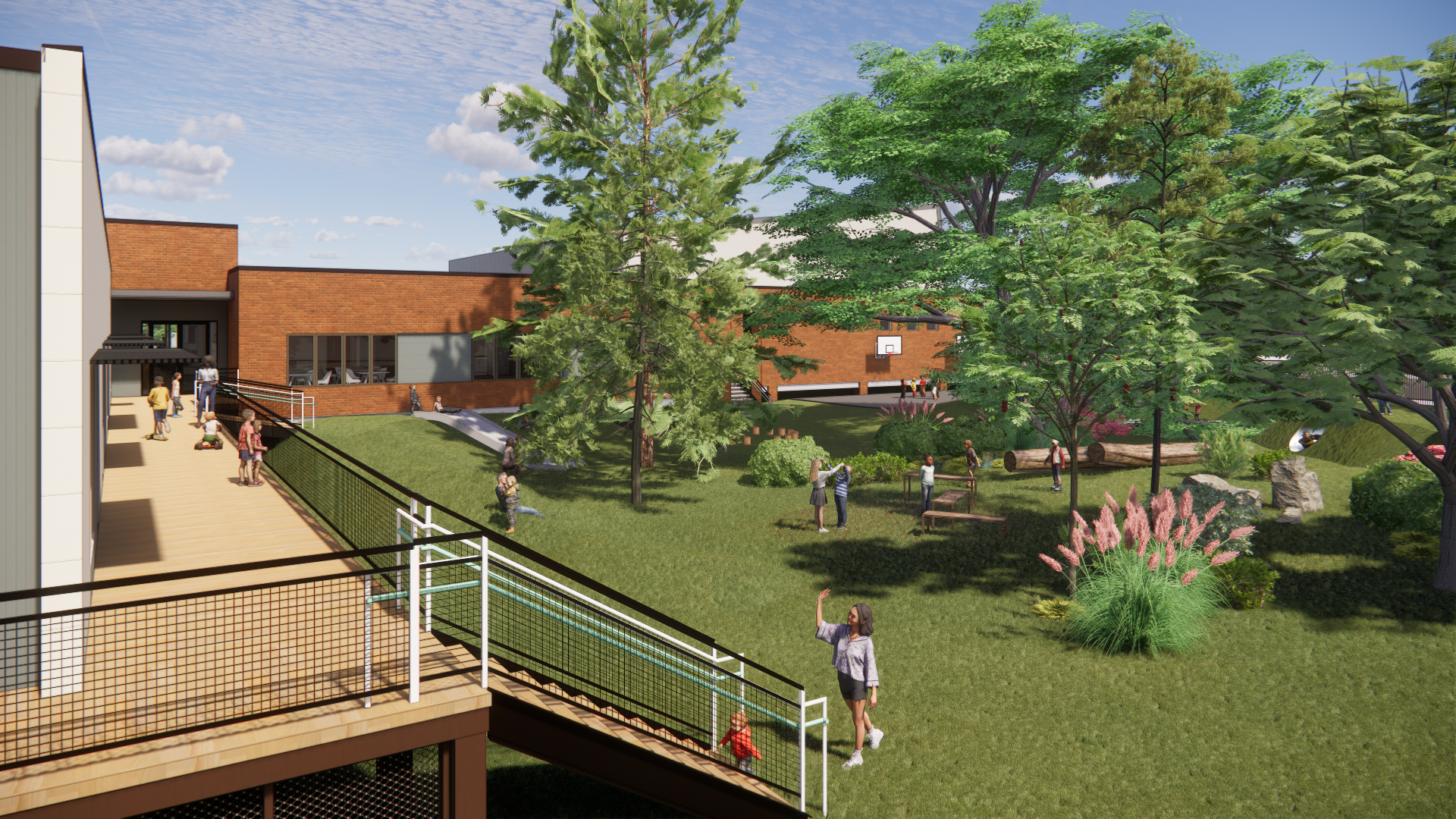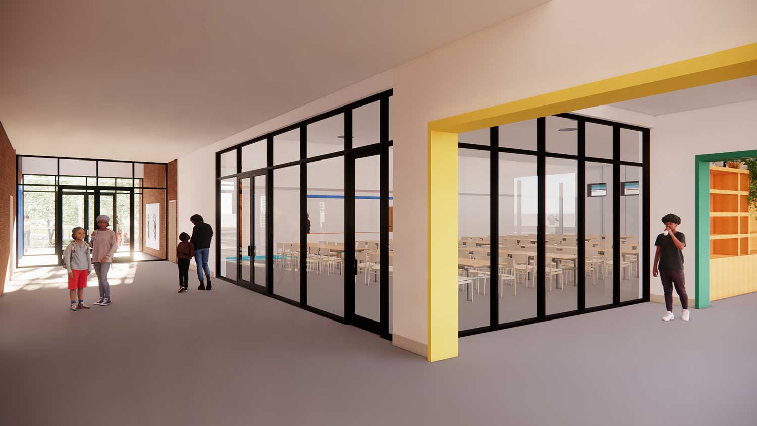 Highlights of the new facility include dedicated areas for upper and lower schools, a library, a full-size gymnasium, a kitchen and cafetorium, reception and administrative offices, health service facilities, spaces for seniors and civic gatherings, two-story porches, and an outdoor swimming pool. A private courtyard will embrace an arbor of mature trees, and the site will be integrated into the 26-acre Blue Greenway resilience park, designed to protect the neighborhood from flooding.