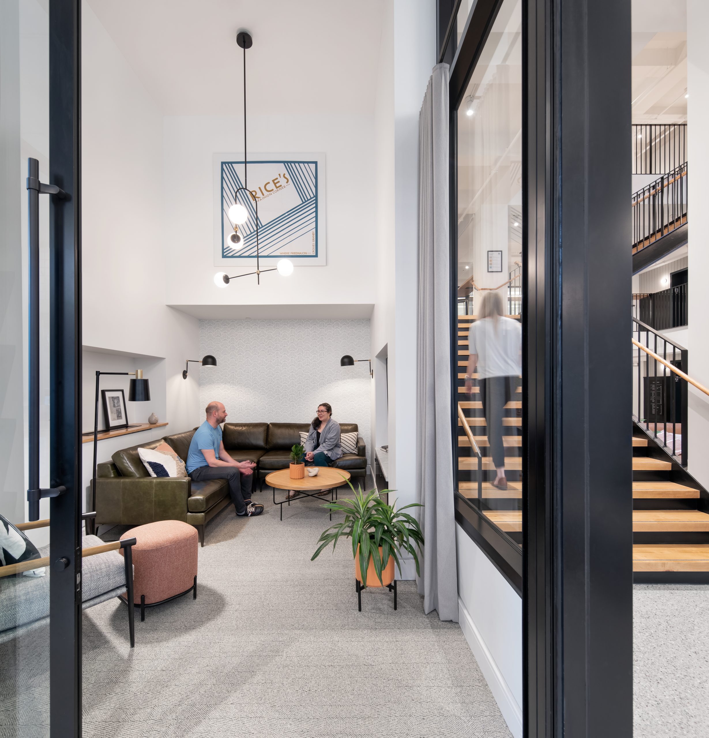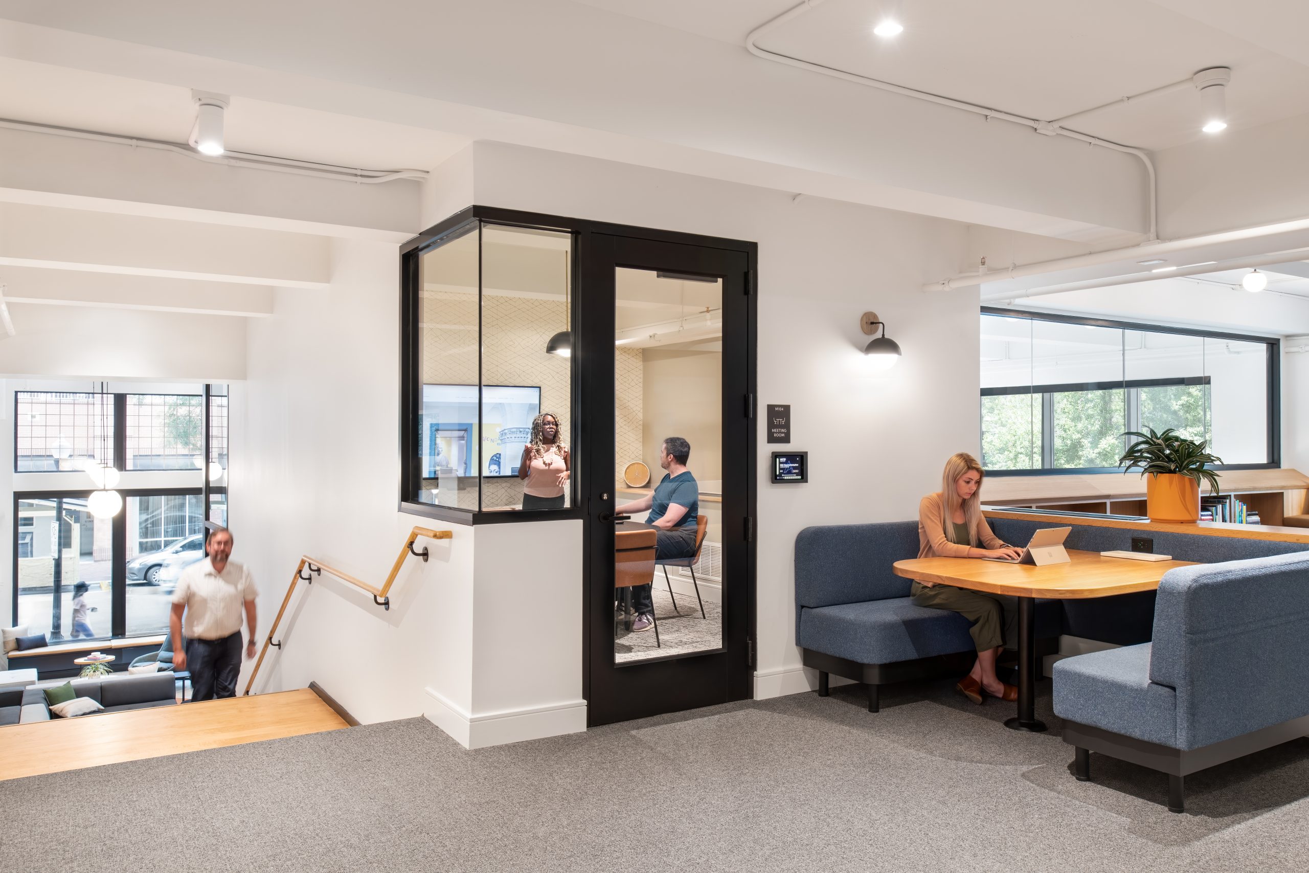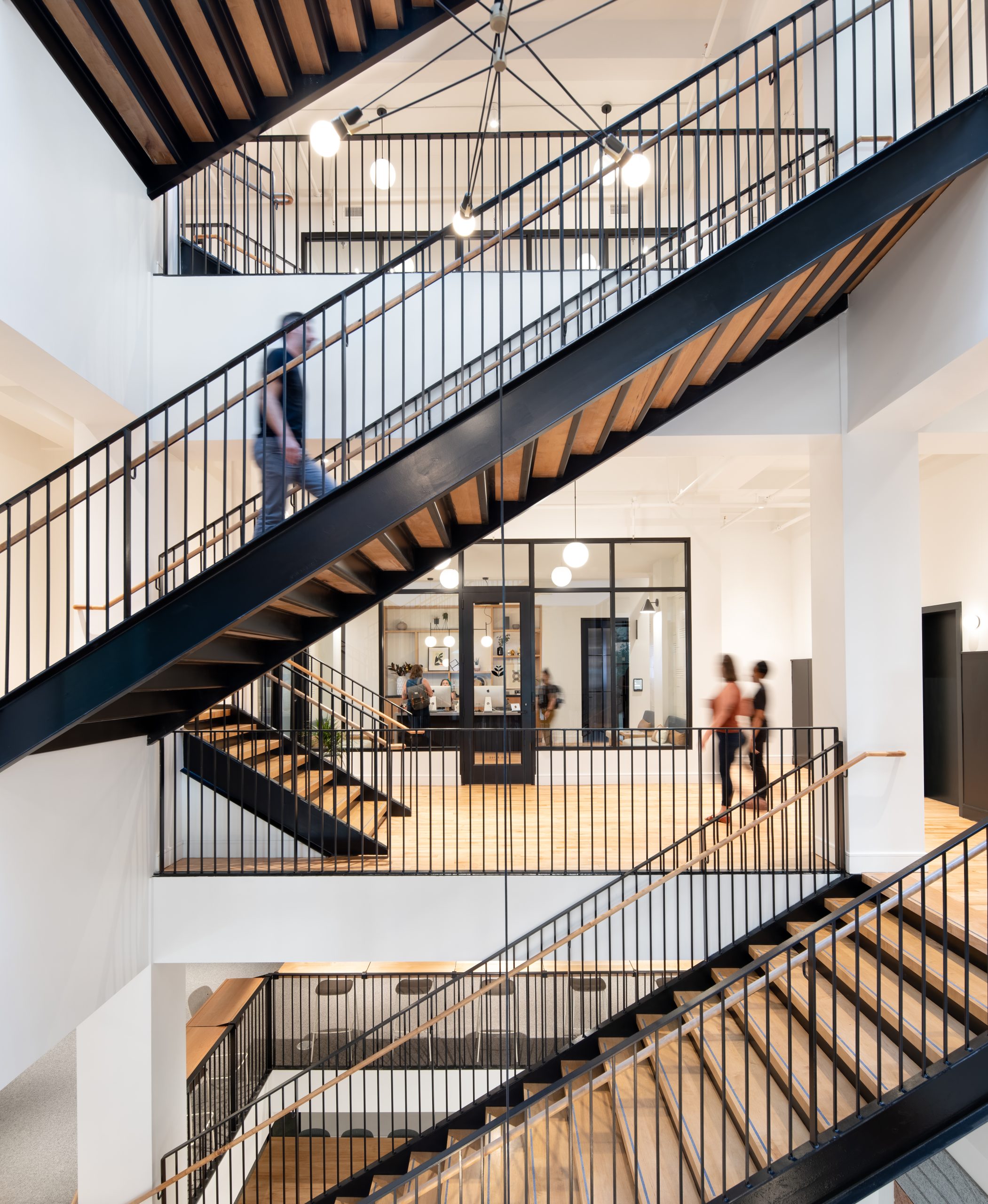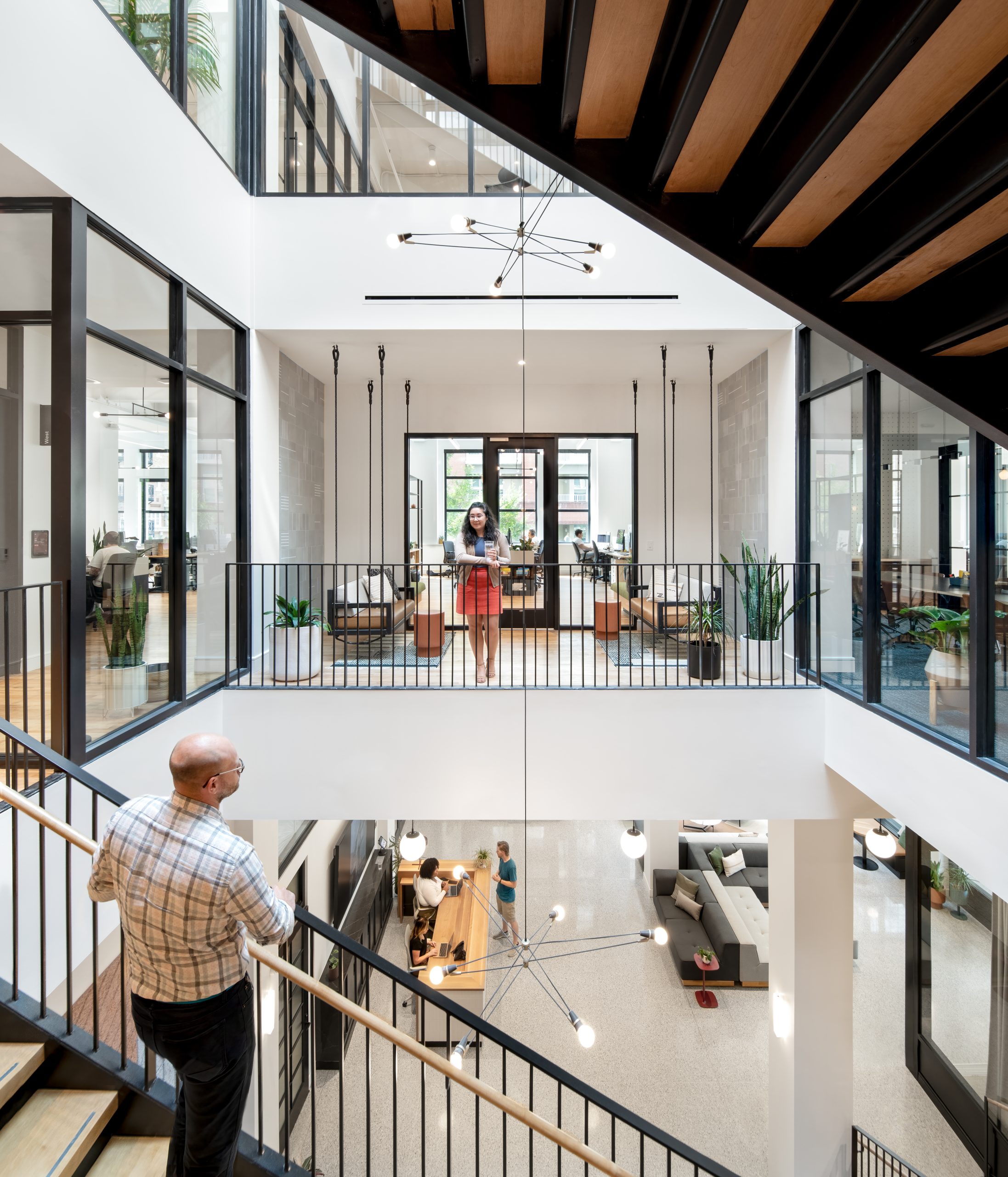 GROW occupies the second floor, which includes a “front porch” with swings extending over the mezzanine. The third floor features larger suites for teams of 15–30 people, a library, a recording studio, and WPA’s 4,600 sf studio. The fifth-floor penthouse is a newly constructed space designed for large gatherings, with a fully operable north façade that opens onto an outdoor roof deck. Throughout the building, generously furnished landings encourage spontaneous “collisions” between tenants as they move up and down the iconic atrium stair.