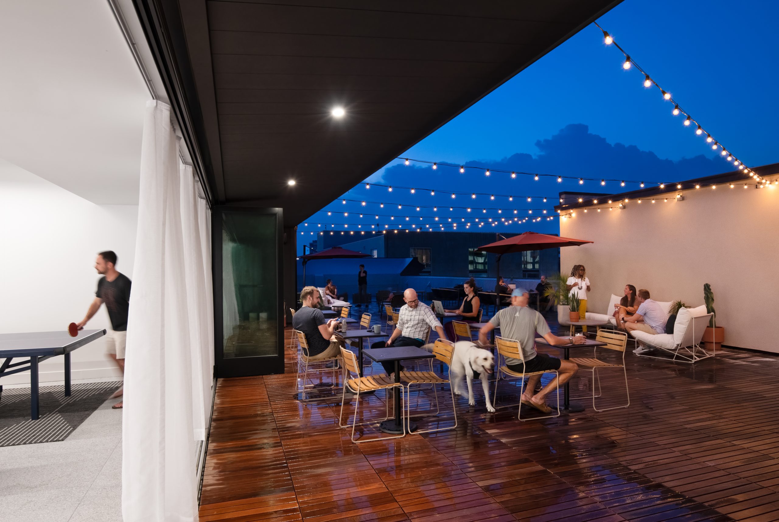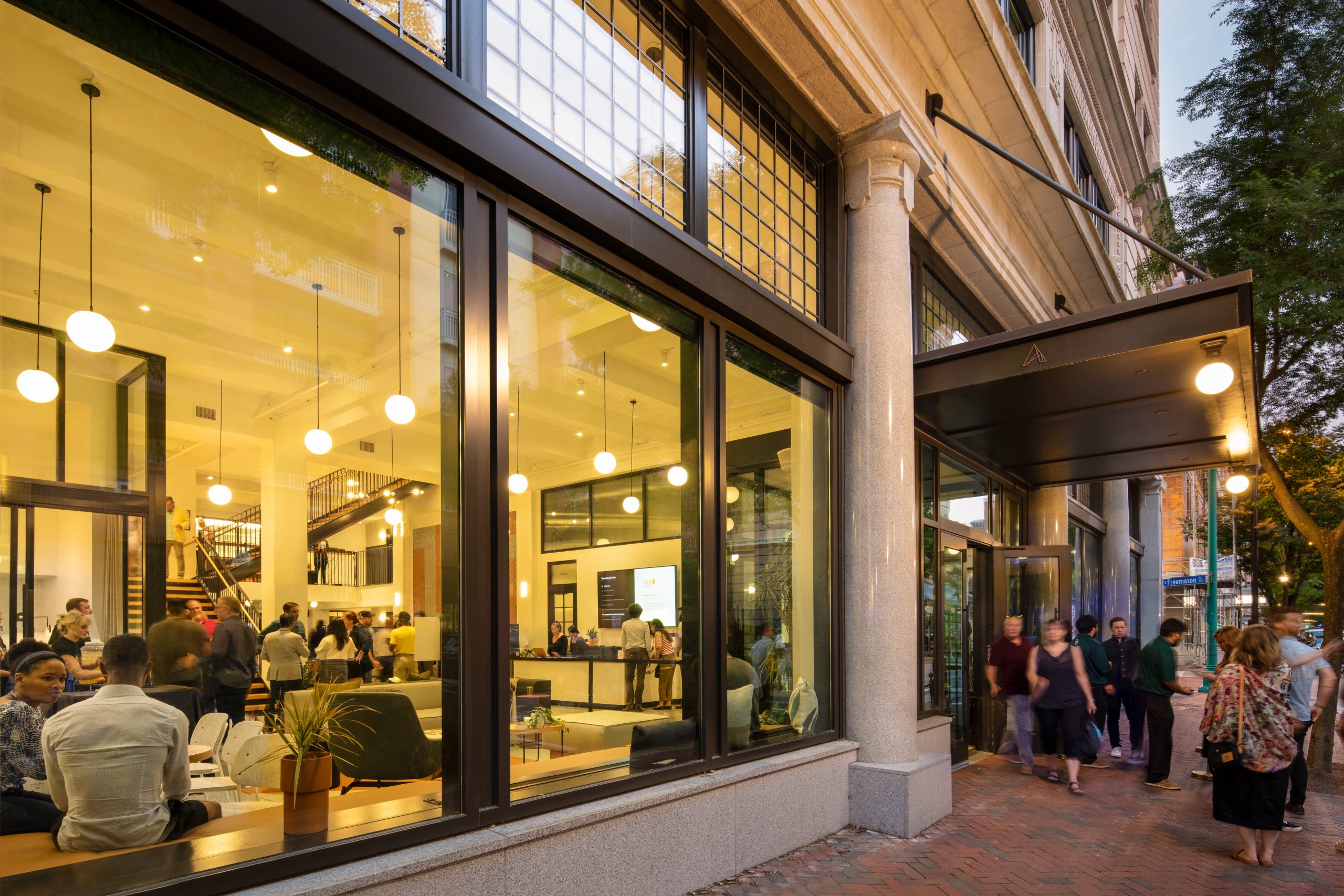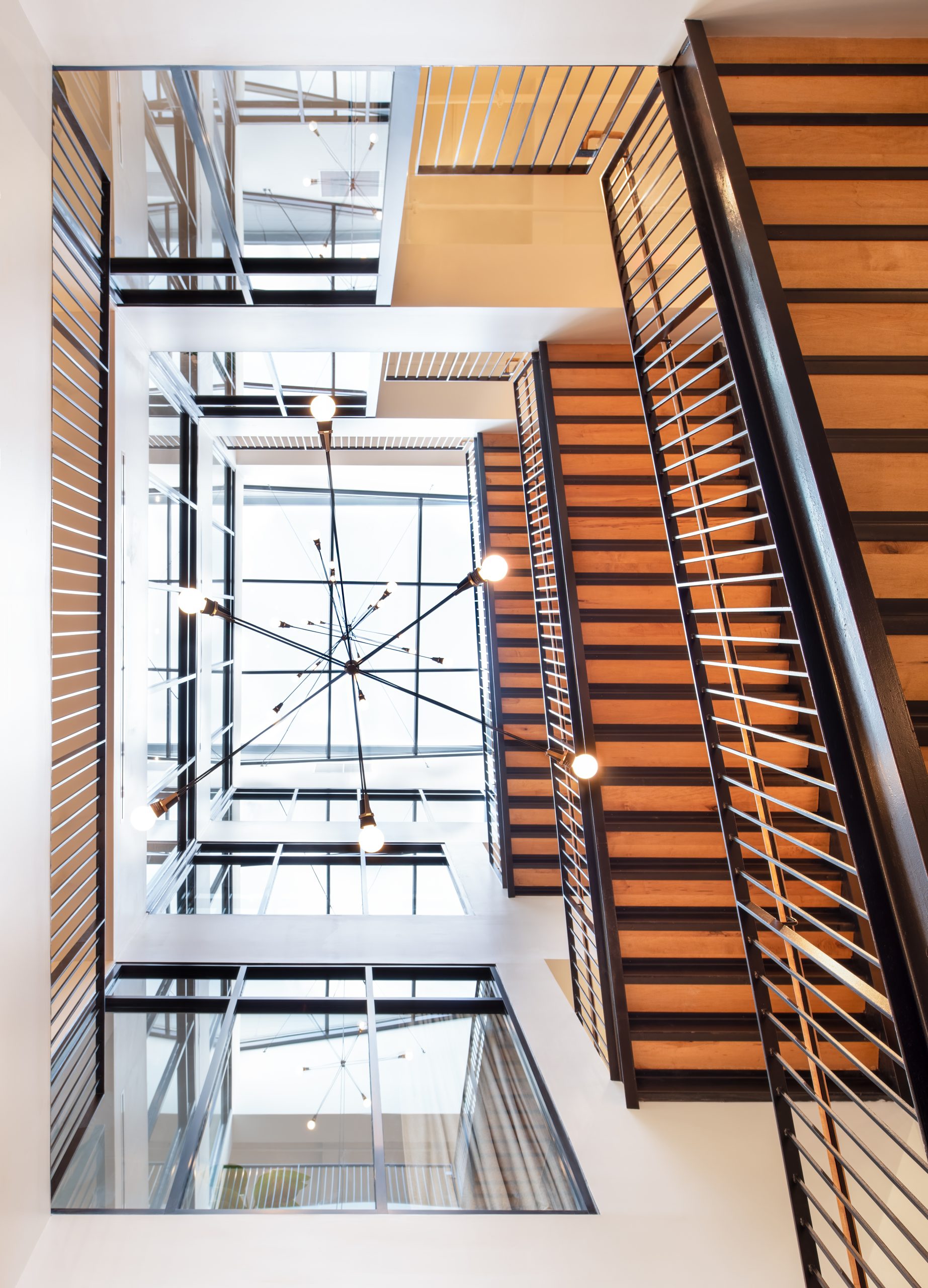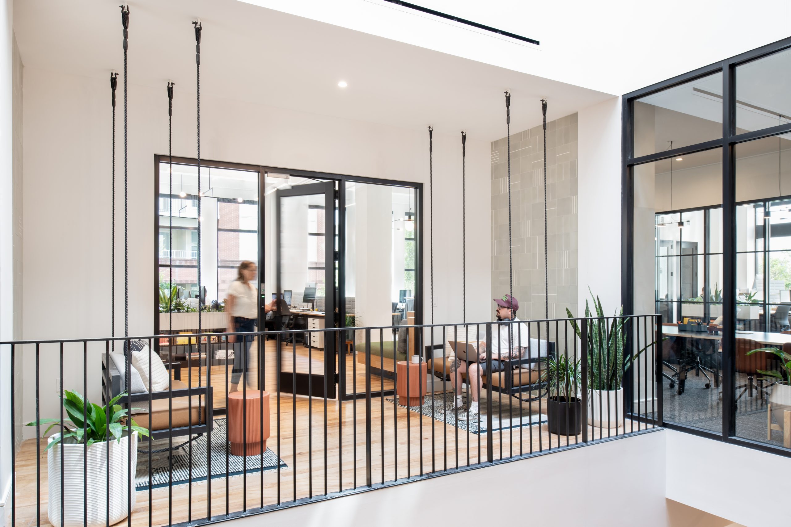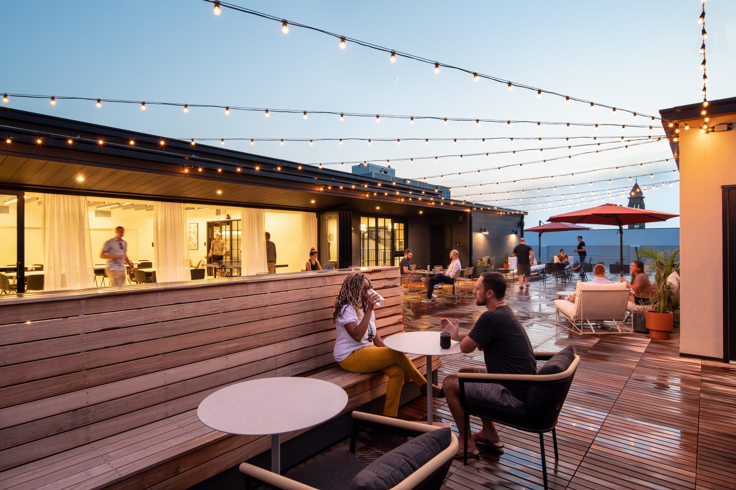 GROW occupies the second floor, which includes a “front porch” with swings extending over the mezzanine. The third floor features larger suites for teams of 15–30 people, a library, a recording studio, and WPA’s 4,600 sf studio. The fifth-floor penthouse is a newly constructed space designed for large gatherings, with a fully operable north façade that opens onto an outdoor roof deck. Throughout the building, generously furnished landings encourage spontaneous “collisions” between tenants as they move up and down the iconic atrium stair.