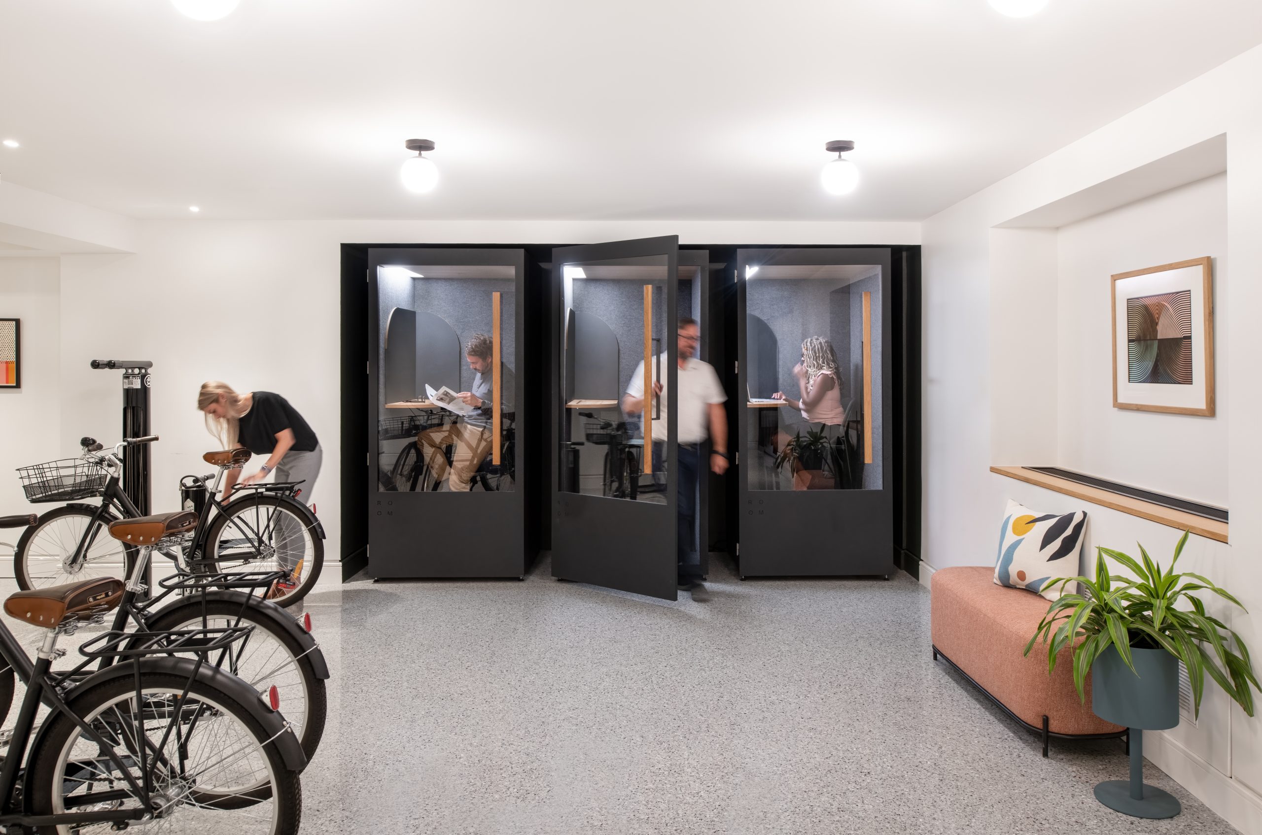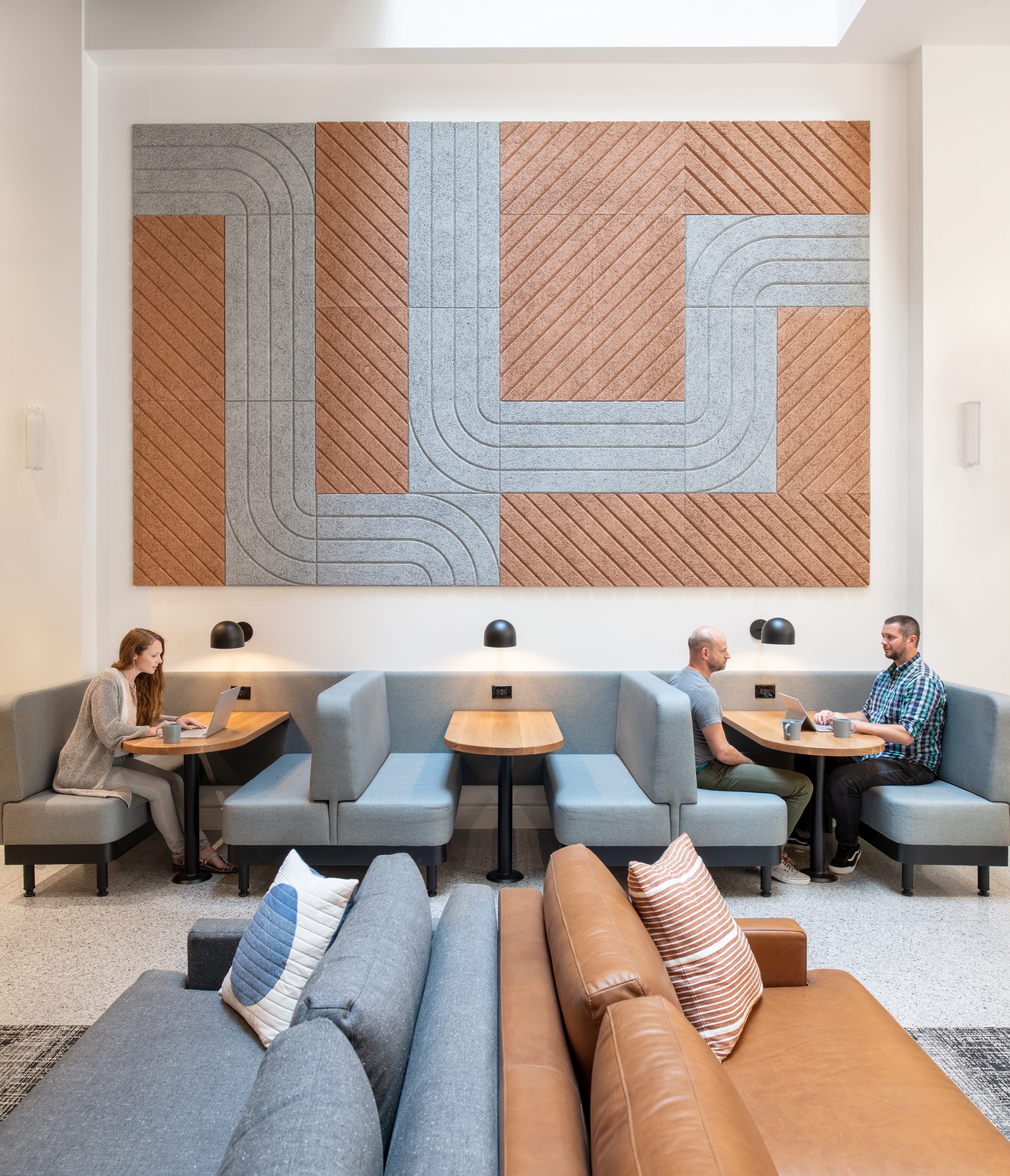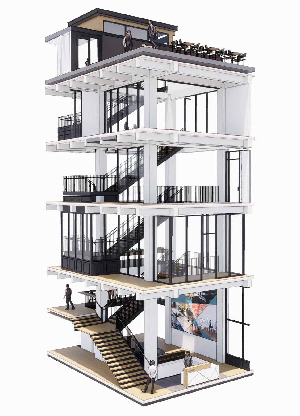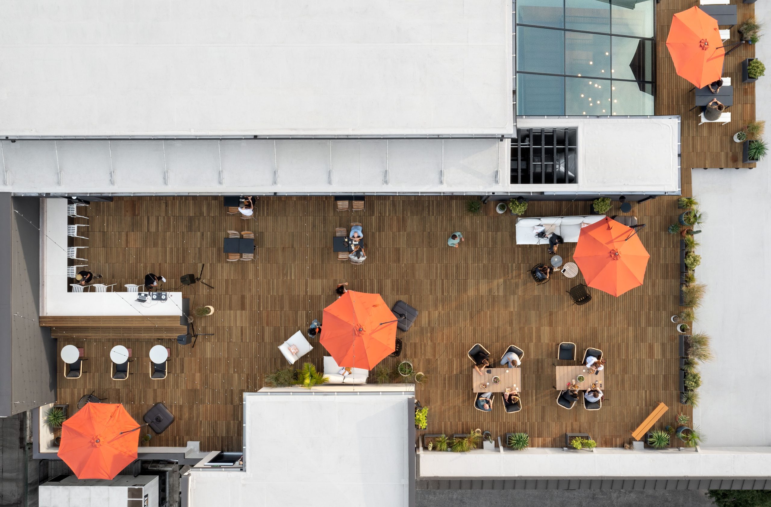 GROW occupies the second floor, which includes a “front porch” with swings extending over the mezzanine. The third floor features larger suites for teams of 15–30 people, a library, a recording studio, and WPA’s 4,600 sf studio. The fifth-floor penthouse is a newly constructed space designed for large gatherings, with a fully operable north façade that opens onto an outdoor roof deck. Throughout the building, generously furnished landings encourage spontaneous “collisions” between tenants as they move up and down the iconic atrium stair.