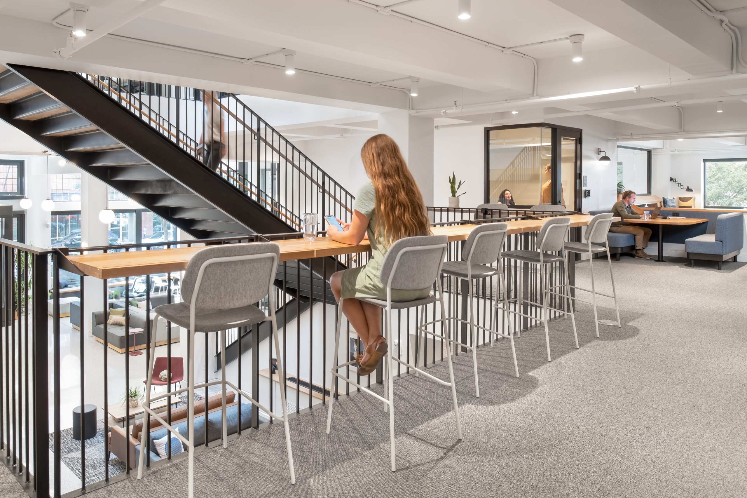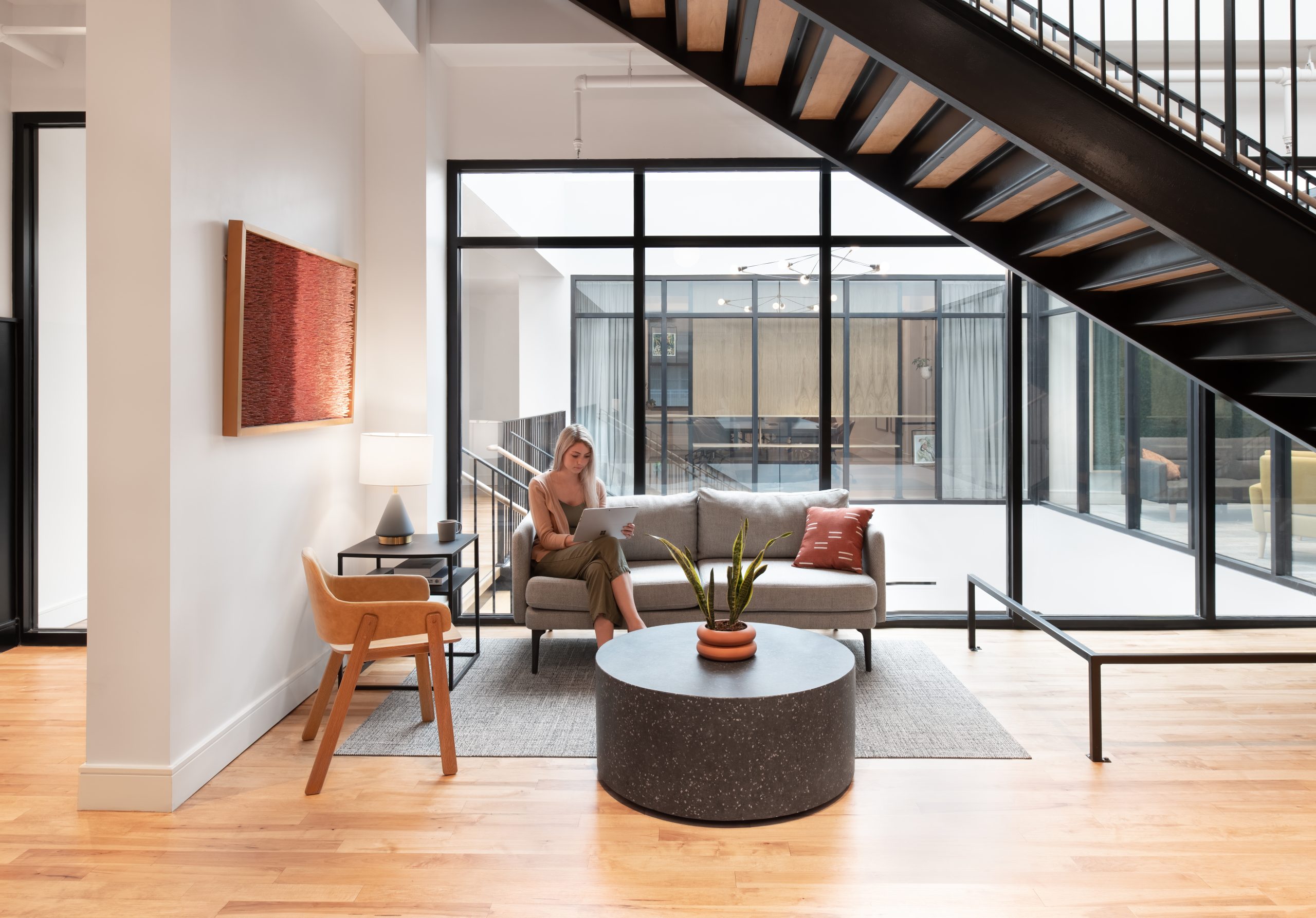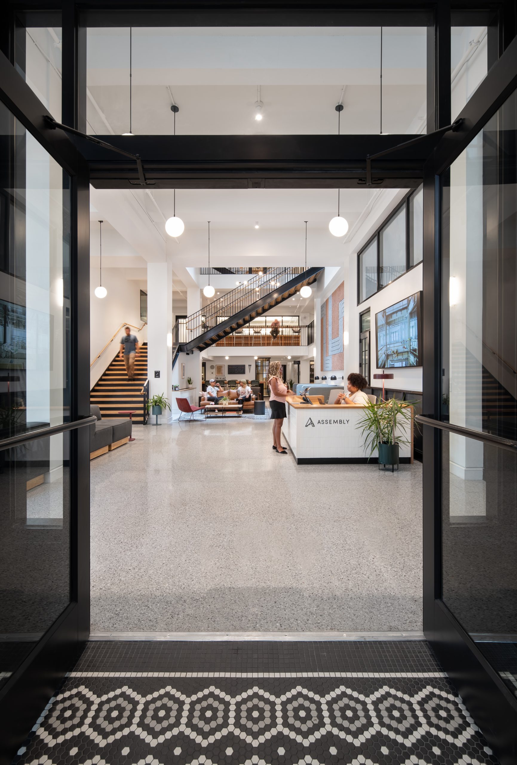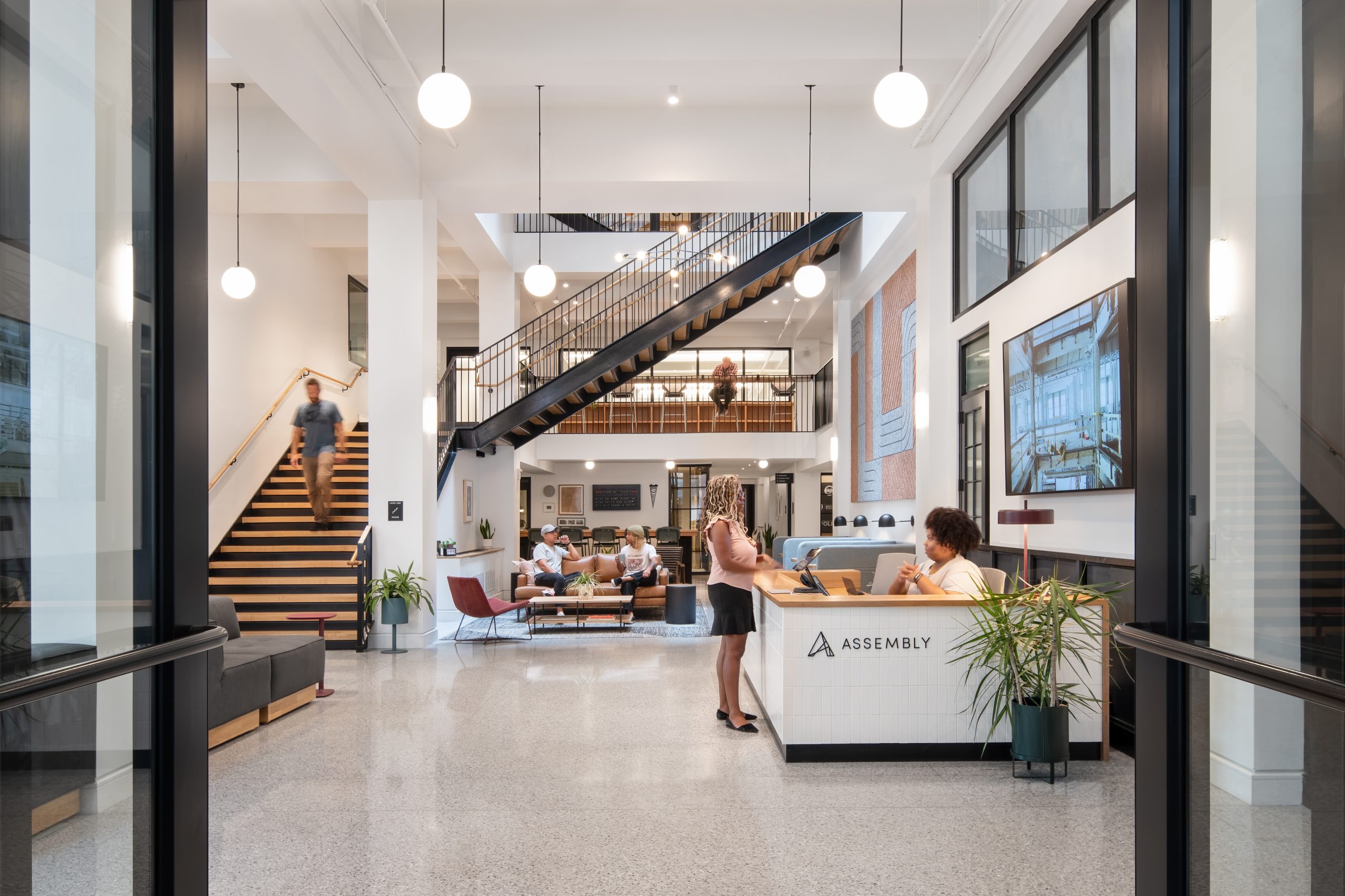 Assembly offers over 15,000 sf of shared amenities. A central atrium — formerly occupied by a historic elevator — connects the floors, rooftop deck, and penthouse, while gathering spaces and casual work areas foster collaboration. Additional shared spaces include an event venue, a large reservable conference room, a mother’s room, a wellness space, a recording studio, a game room, and bike share and storage facilities. These features enhance the shared experience for Assembly’s residents.