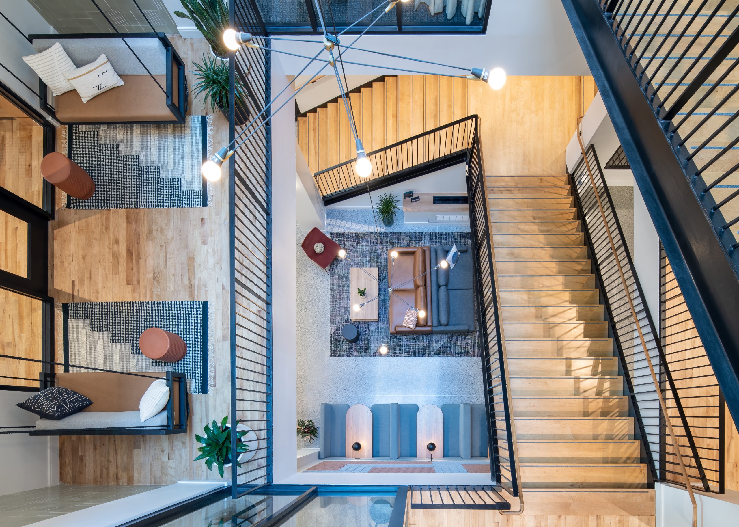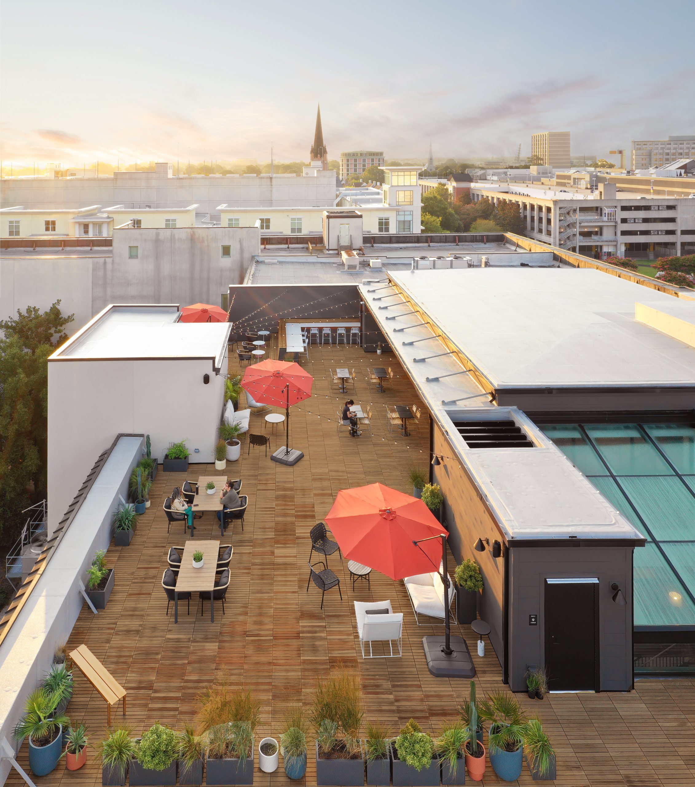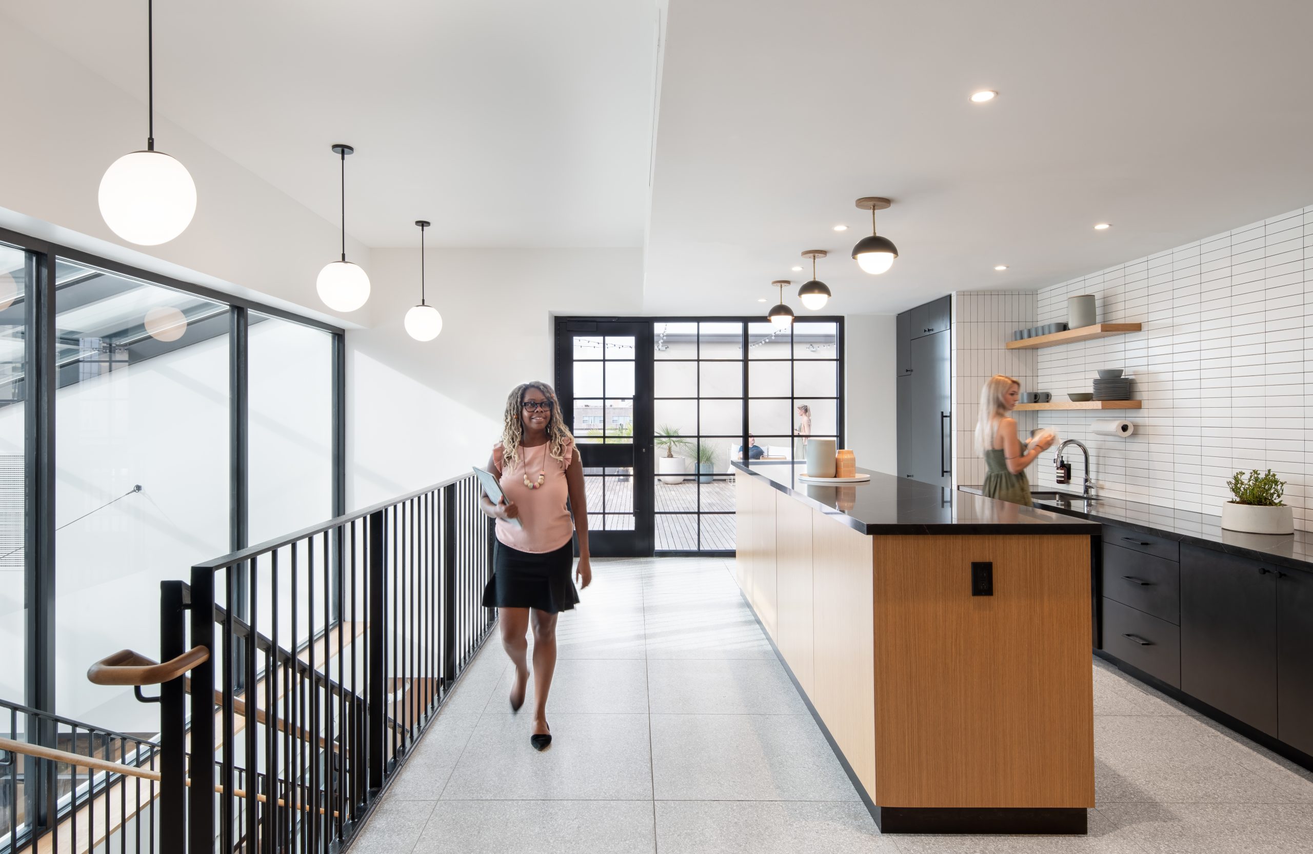Assembly offers over 15,000 sf of shared amenities. A central atrium — formerly occupied by a historic elevator — connects the floors, rooftop deck, and penthouse, while gathering spaces and casual work areas foster collaboration. Additional shared spaces include an event venue, a large reservable conference room, a mother’s room, a wellness space, a recording studio, a game room, and bike share and storage facilities. These features enhance the shared experience for Assembly’s residents.