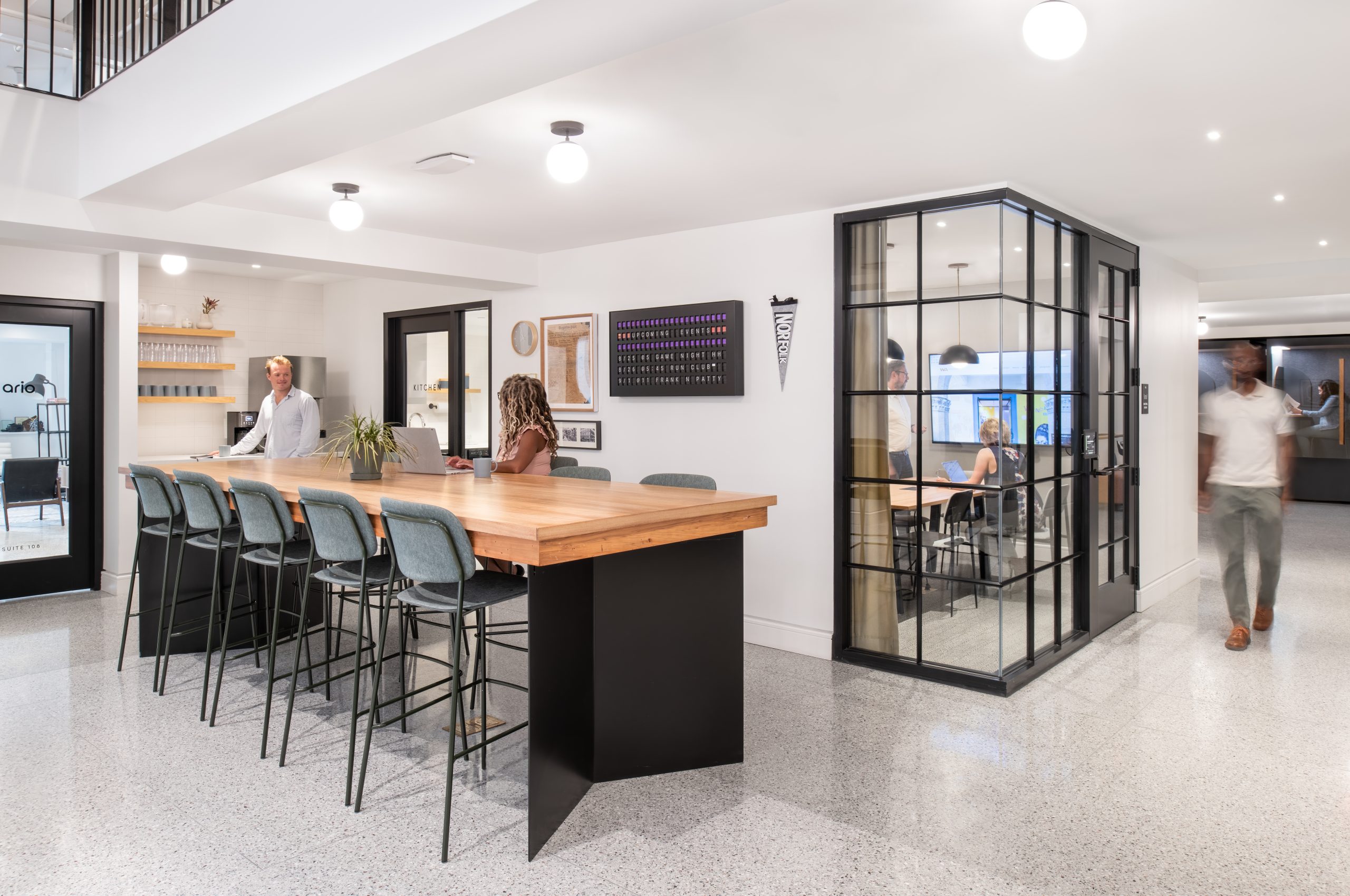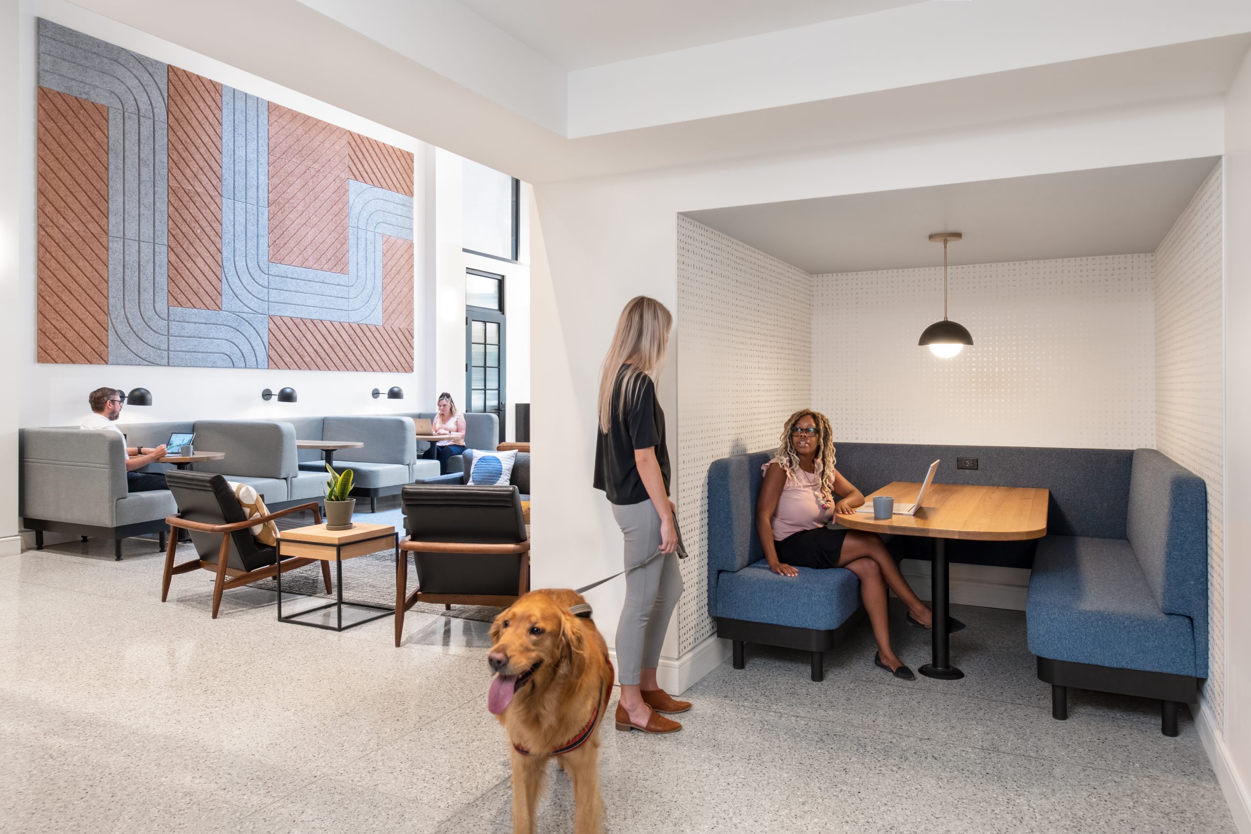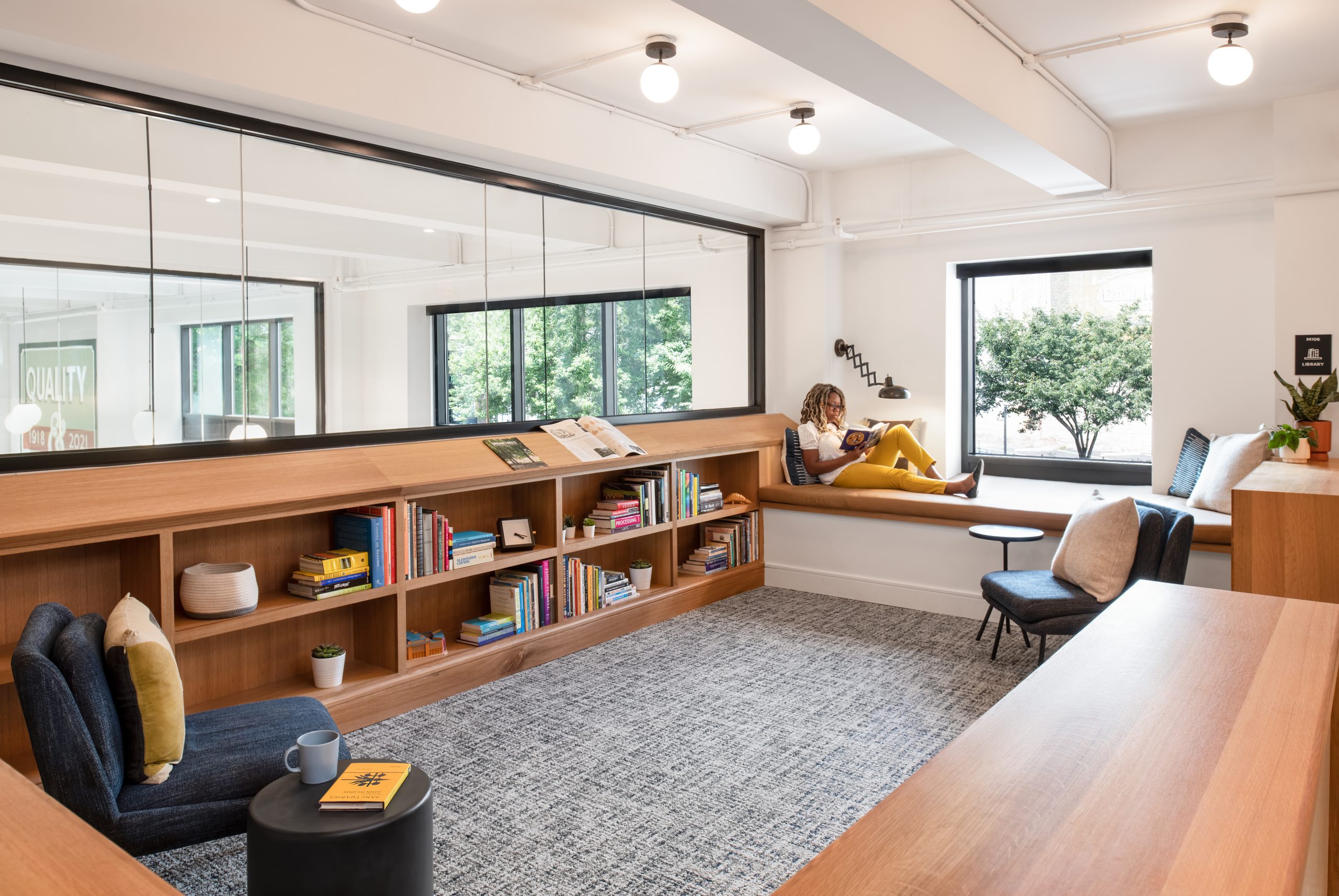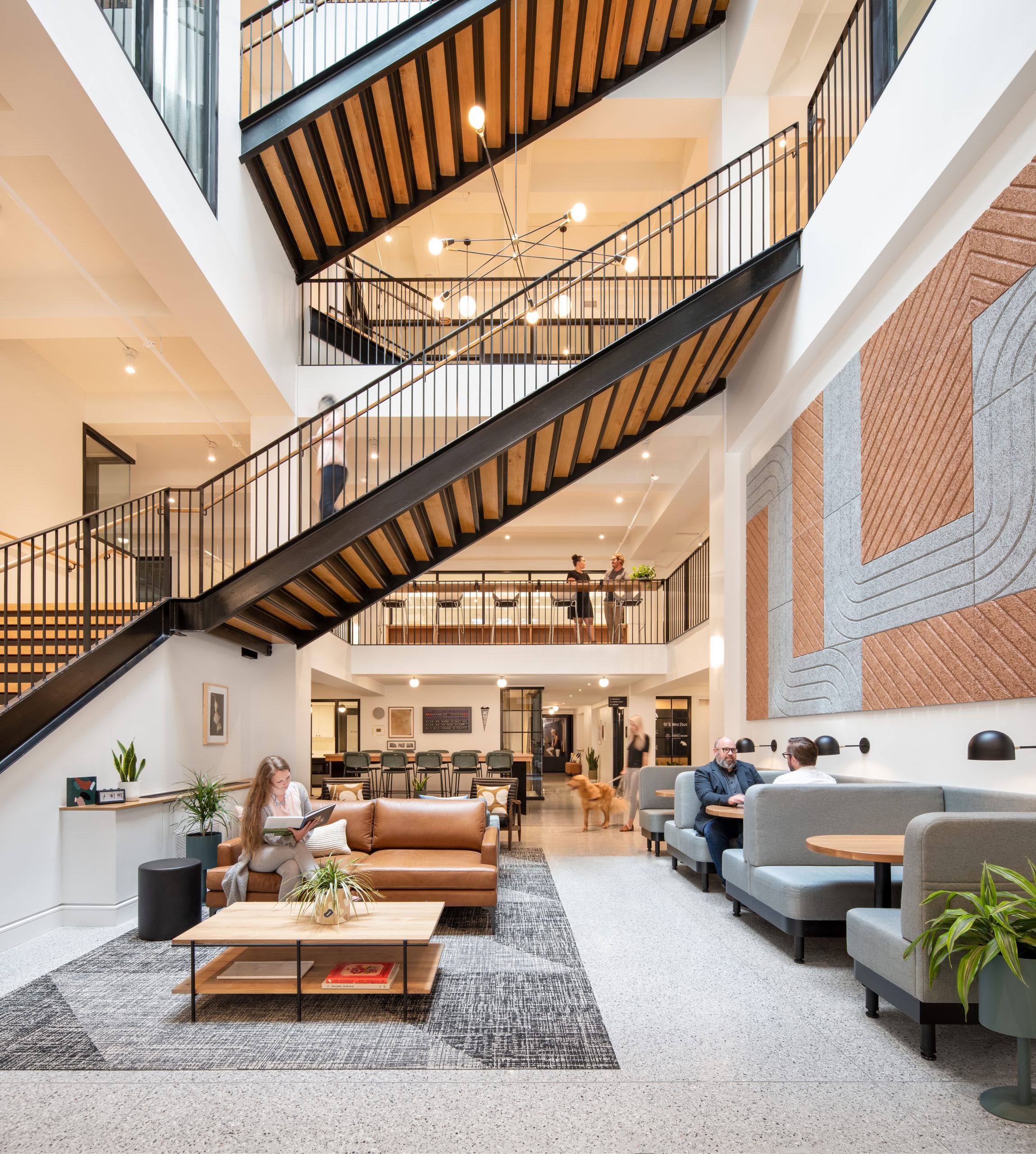 Assembly offers over 15,000 sf of shared amenities. A central atrium — formerly occupied by a historic elevator — connects the floors, rooftop deck, and penthouse, while gathering spaces and casual work areas foster collaboration. Additional shared spaces include an event venue, a large reservable conference room, a mother’s room, a wellness space, a recording studio, a game room, and bike share and storage facilities. These features enhance the shared experience for Assembly’s residents.