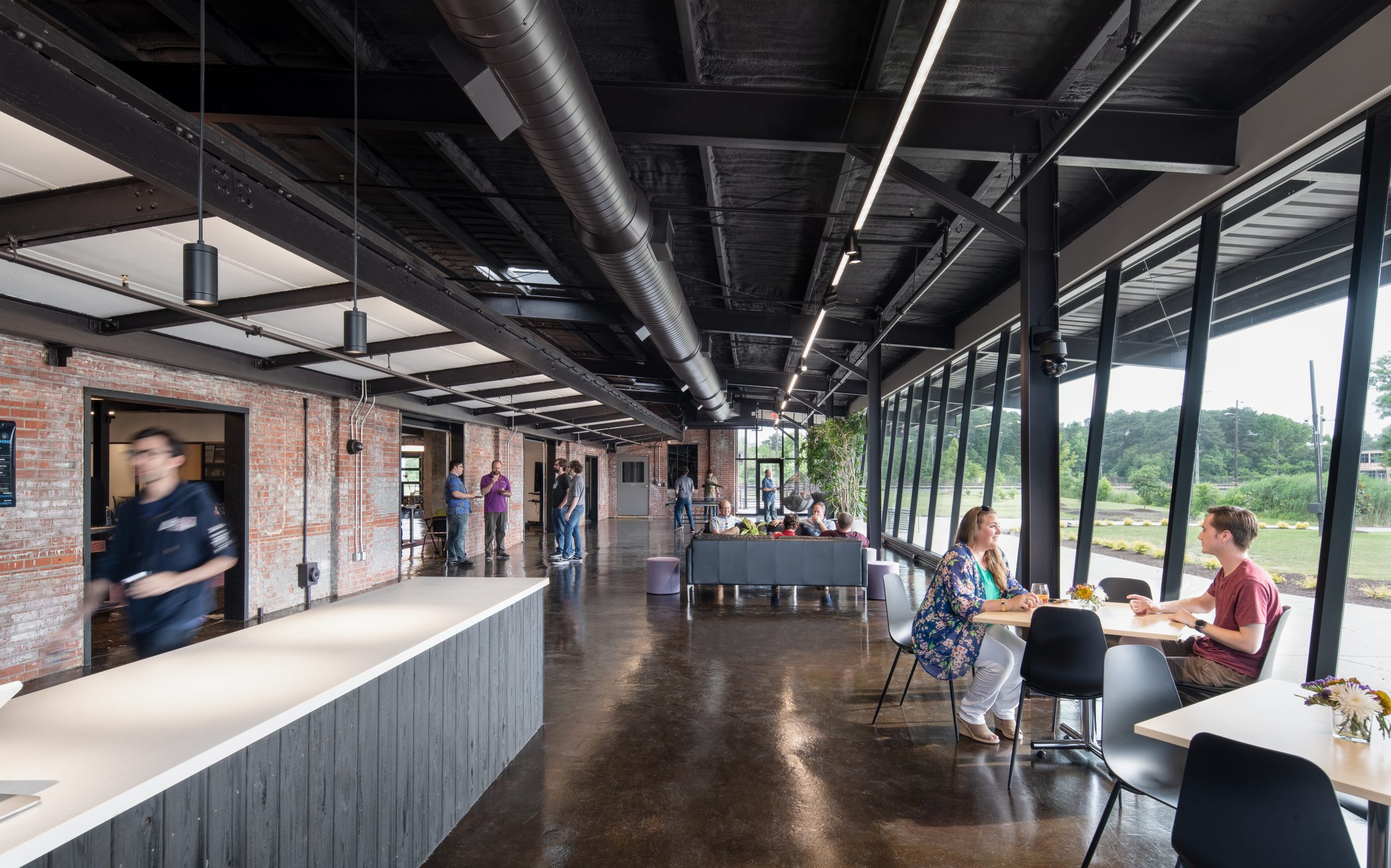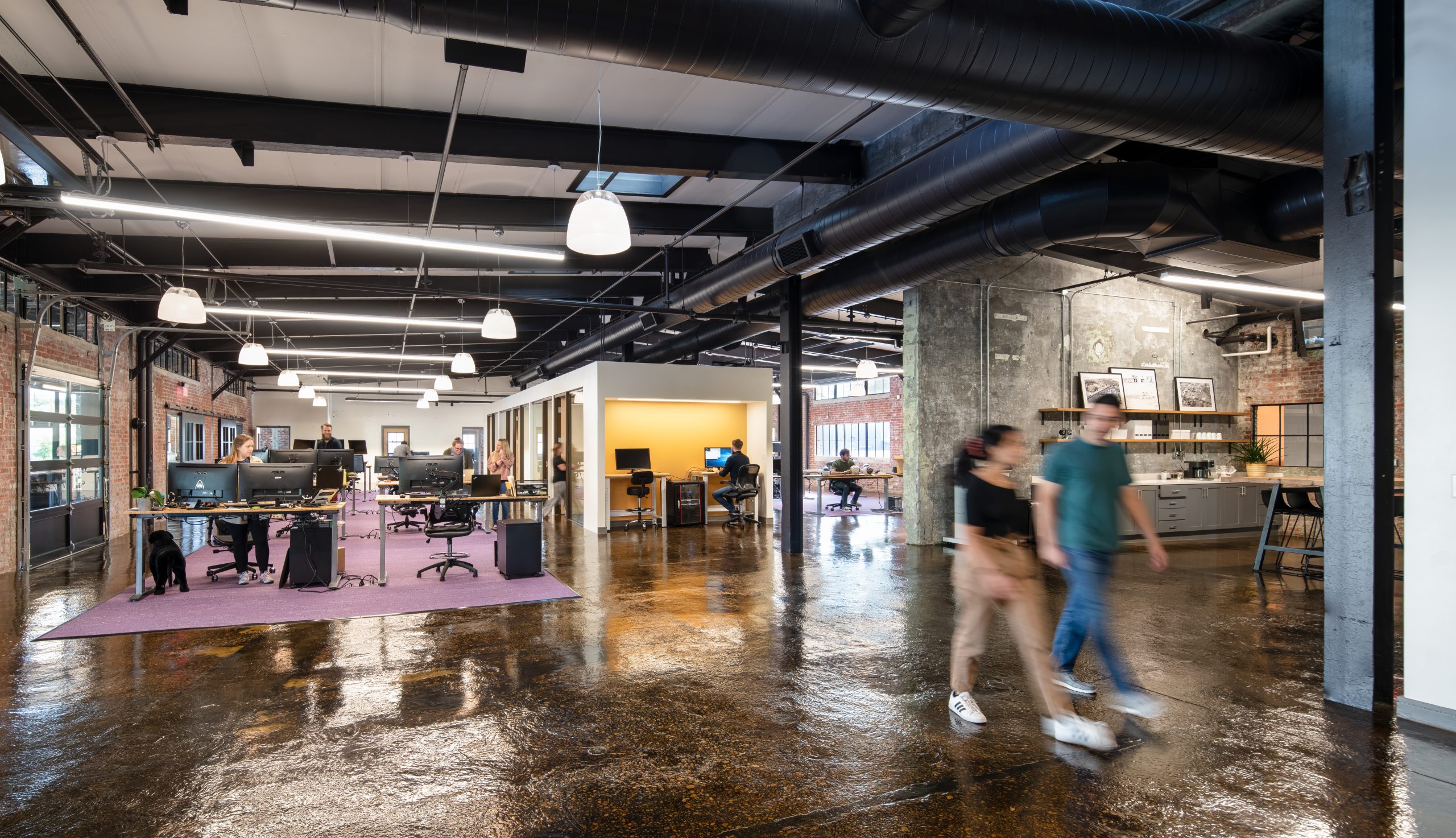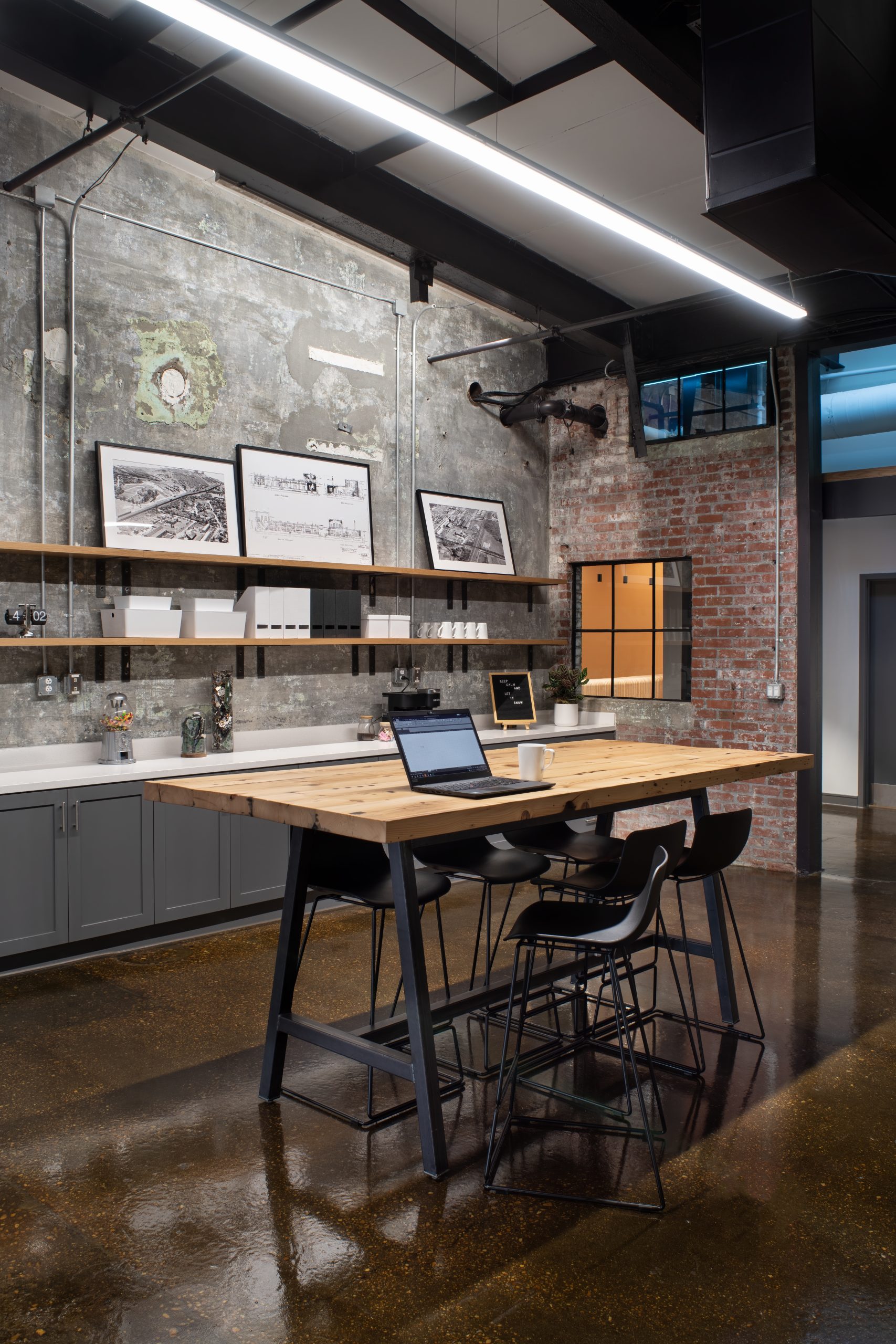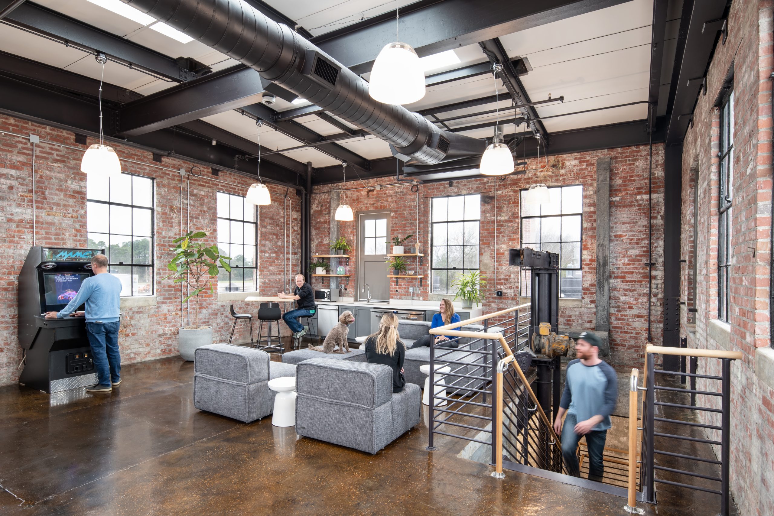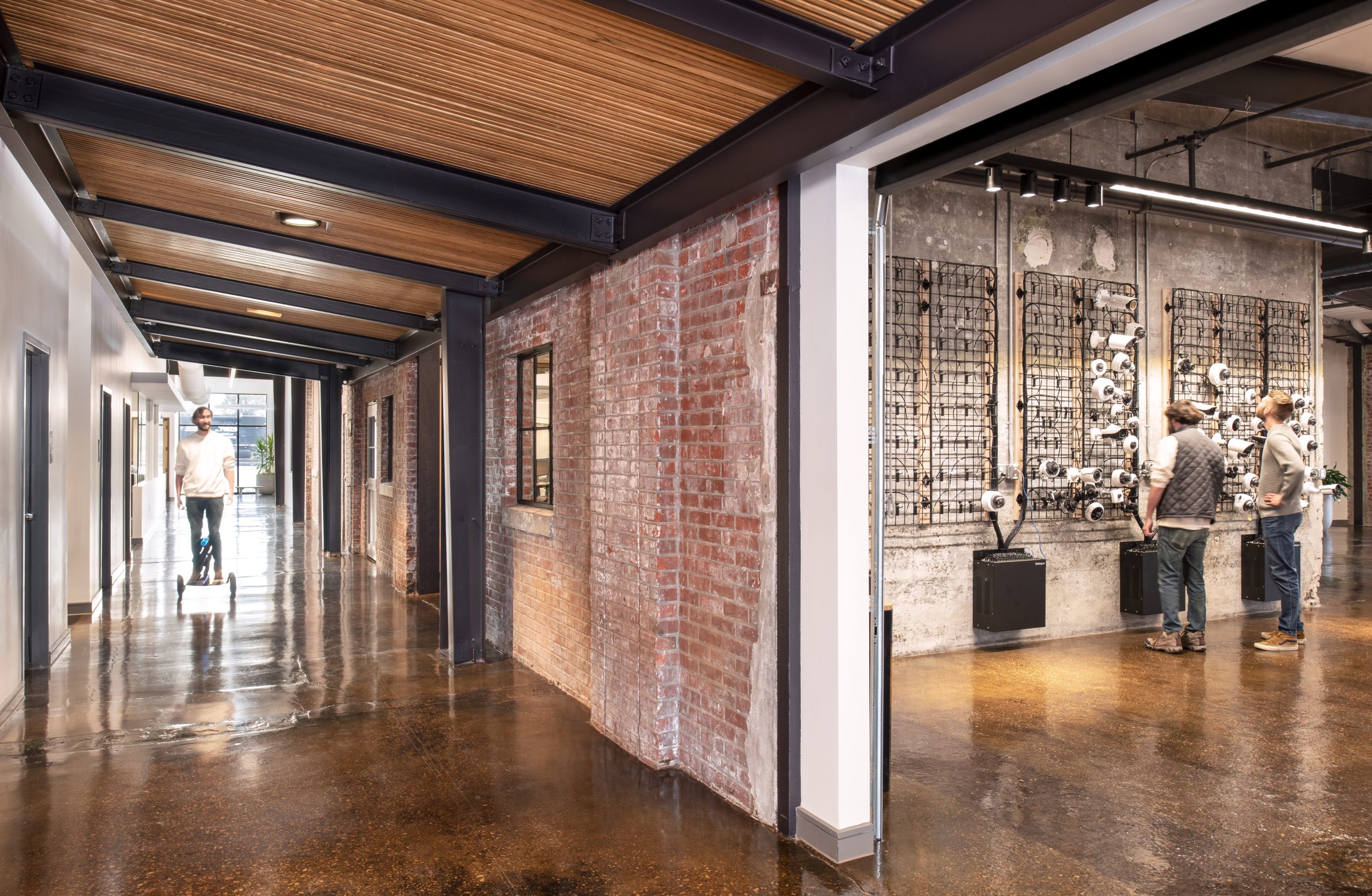 IPConfigure’s knowledge workers are based in the historic portion of the building, while camera assembly takes place in a newer metal addition. An original loading dock canopy welcomes visitors into the building and an “Experience Center” with a coffee shop, where they can see products in use. Skylights and new light fixtures cast a warm glow in the reception area, filtered through new wood slats installed in the steel canopy. A new steel staircase leads up to the original tower—once a testing ground for acetylene gas, now transformed into a break room and lounge.