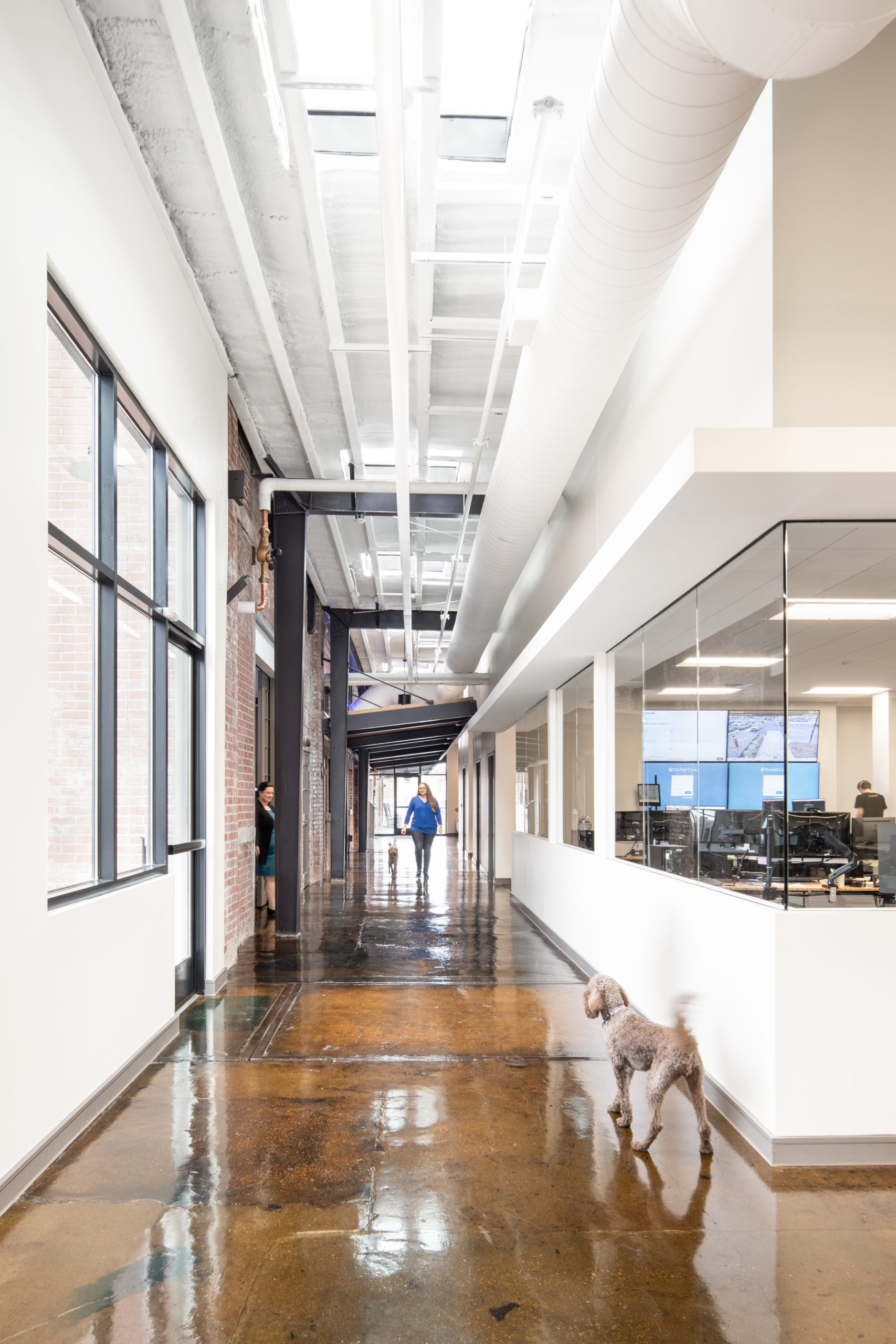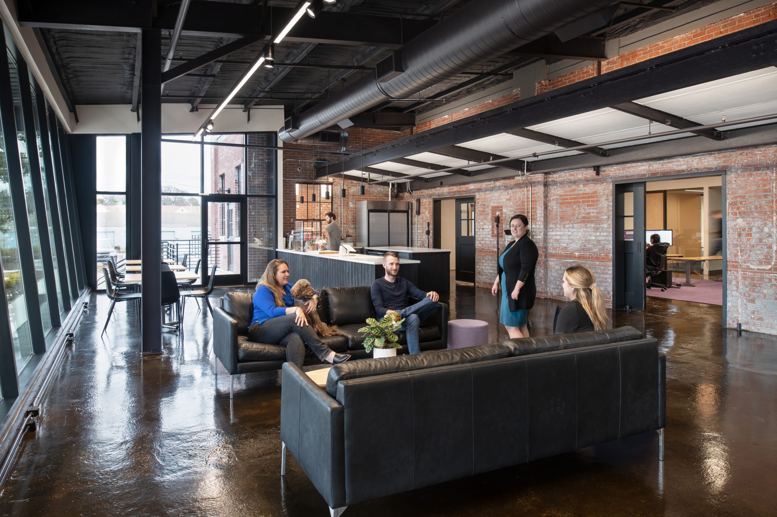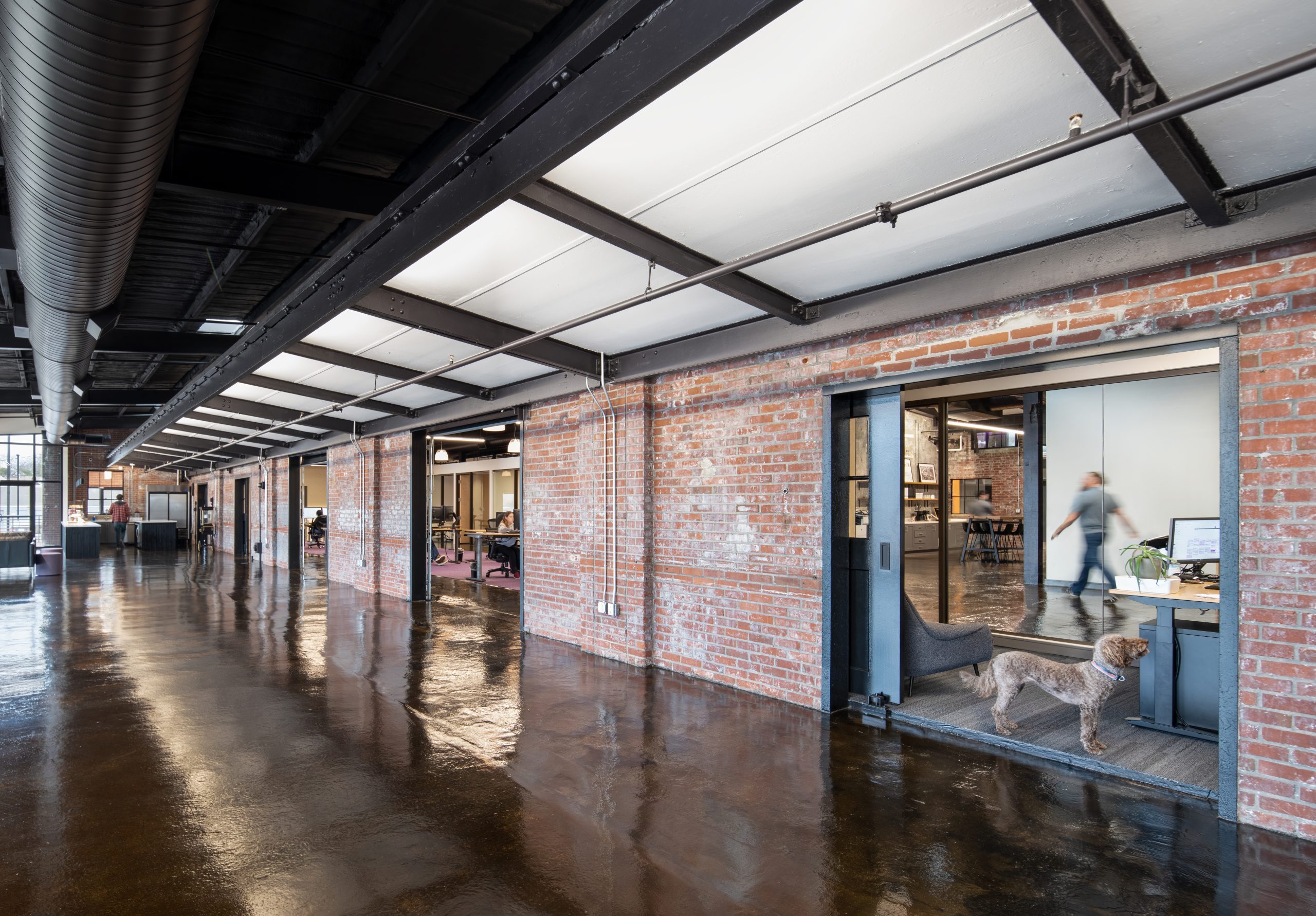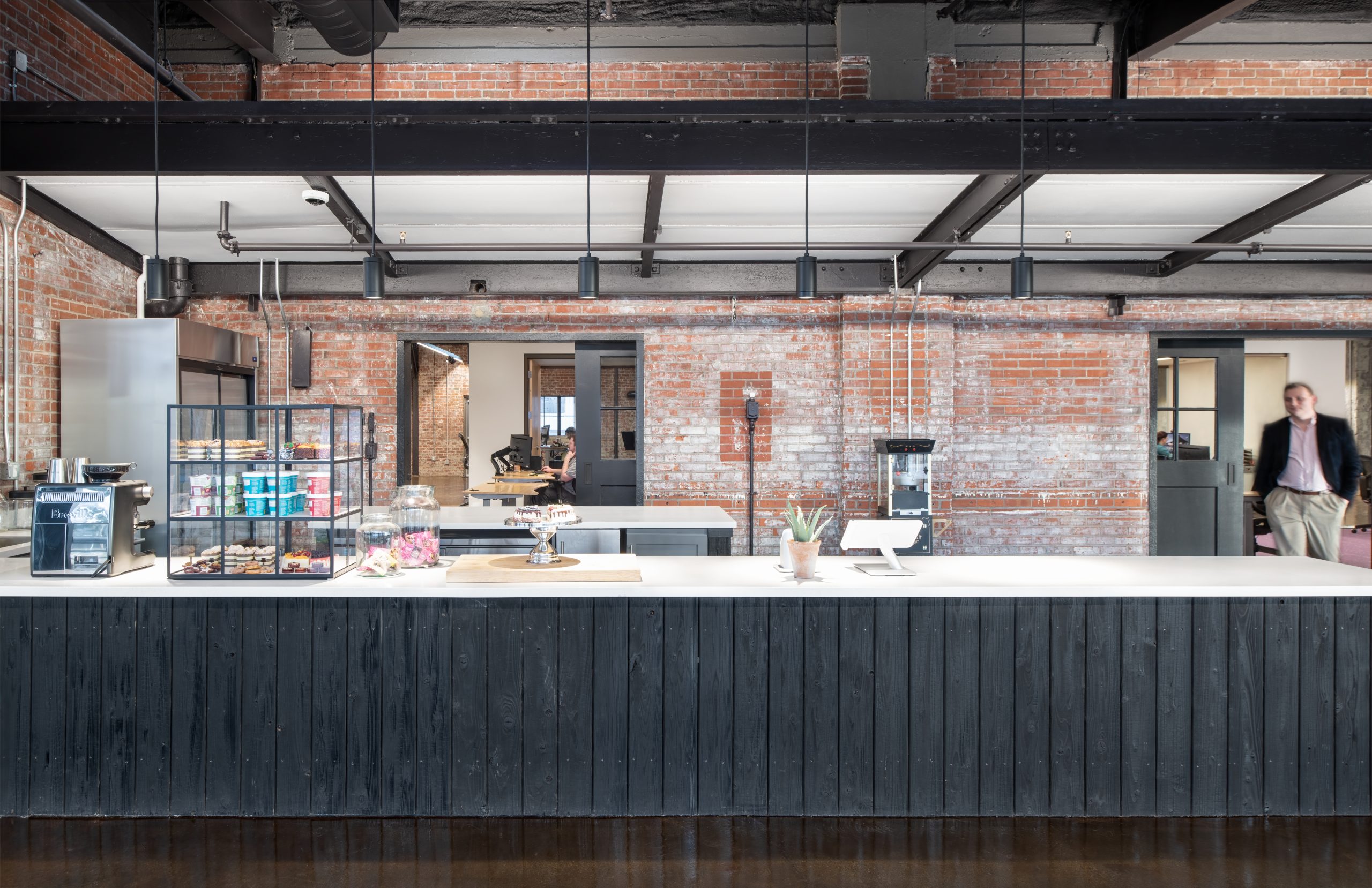 IPConfigure’s knowledge workers are based in the historic portion of the building, while camera assembly takes place in a newer metal addition. An original loading dock canopy welcomes visitors into the building and an “Experience Center” with a coffee shop, where they can see products in use. Skylights and new light fixtures cast a warm glow in the reception area, filtered through new wood slats installed in the steel canopy. A new steel staircase leads up to the original tower—once a testing ground for acetylene gas, now transformed into a break room and lounge.