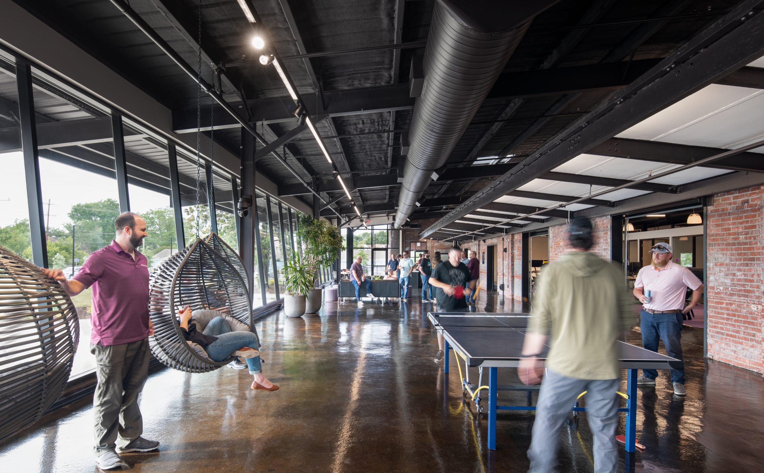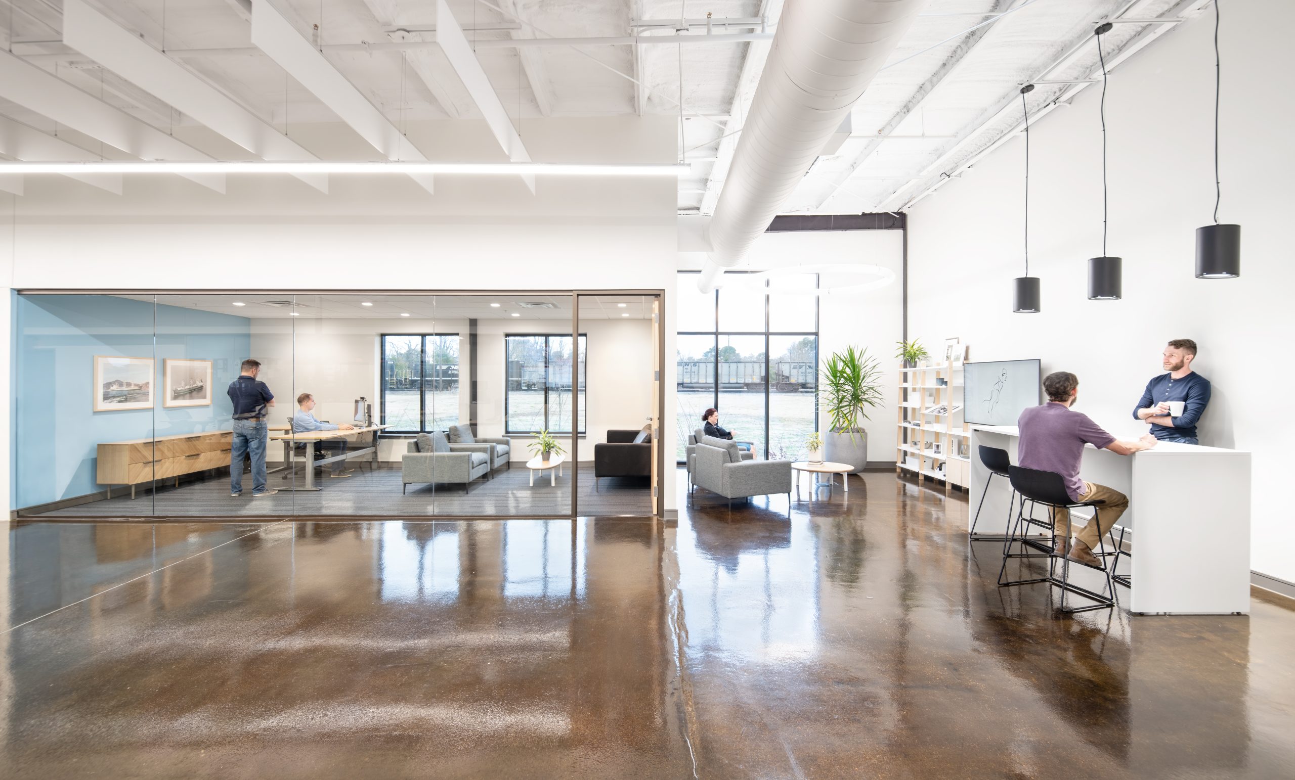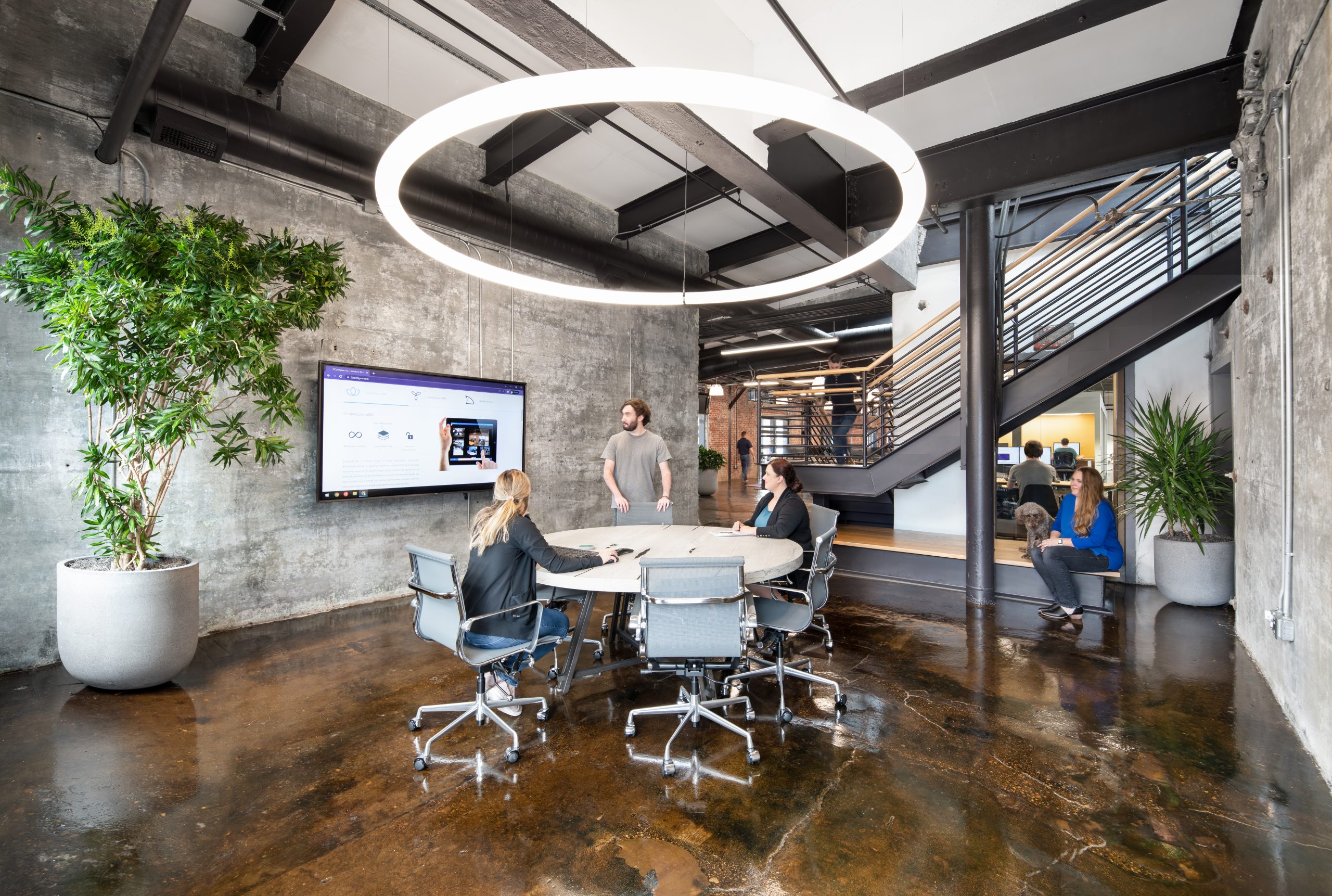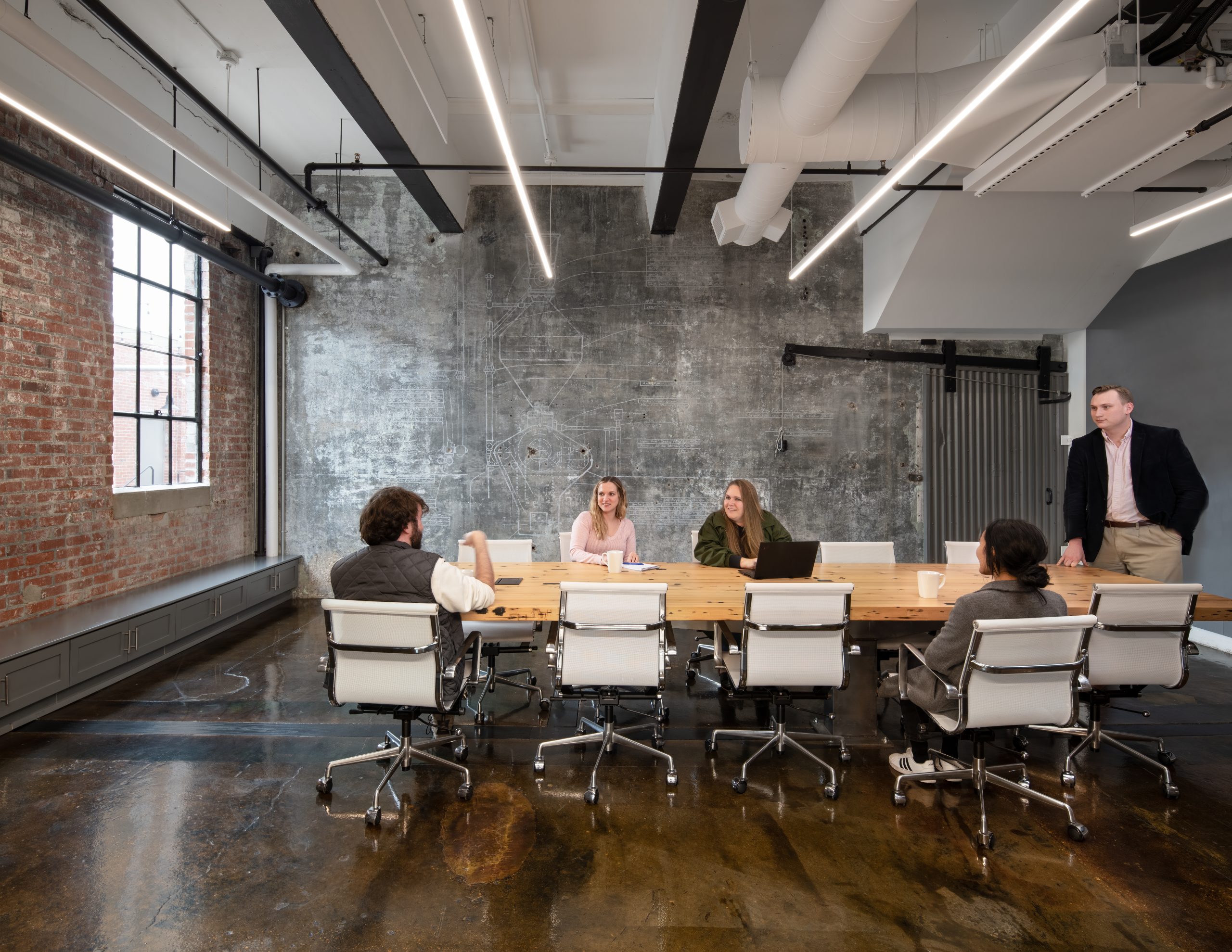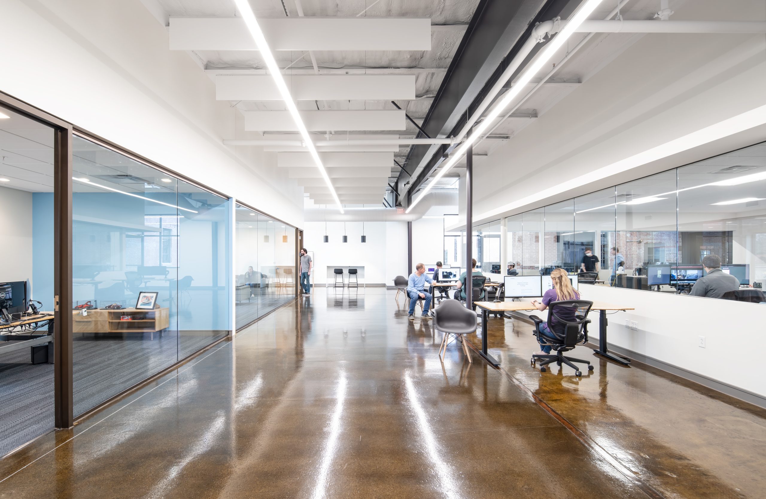 IPConfigure’s knowledge workers are based in the historic portion of the building, while camera assembly takes place in a newer metal addition. An original loading dock canopy welcomes visitors into the building and an “Experience Center” with a coffee shop, where they can see products in use. Skylights and new light fixtures cast a warm glow in the reception area, filtered through new wood slats installed in the steel canopy. A new steel staircase leads up to the original tower—once a testing ground for acetylene gas, now transformed into a break room and lounge.