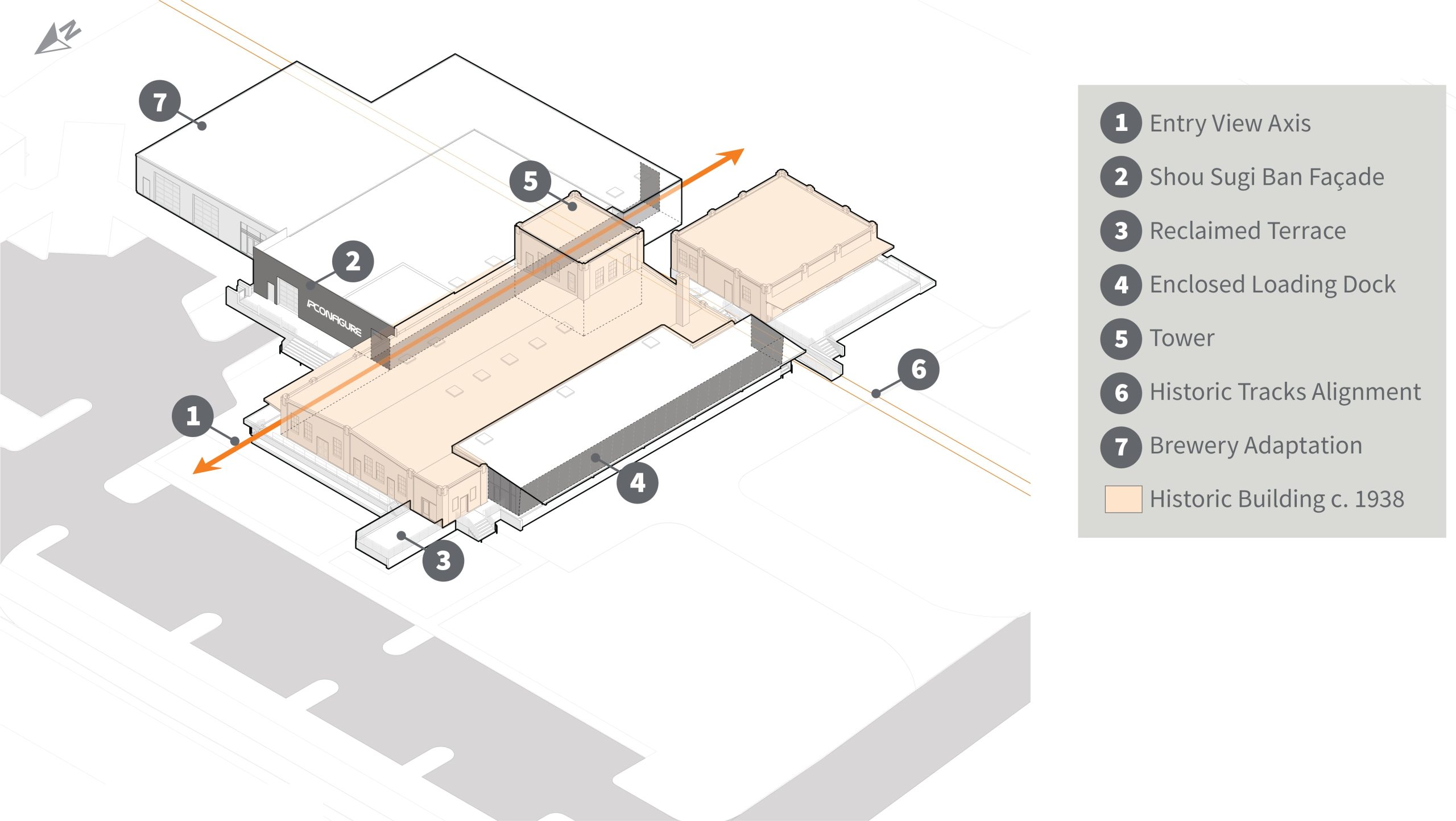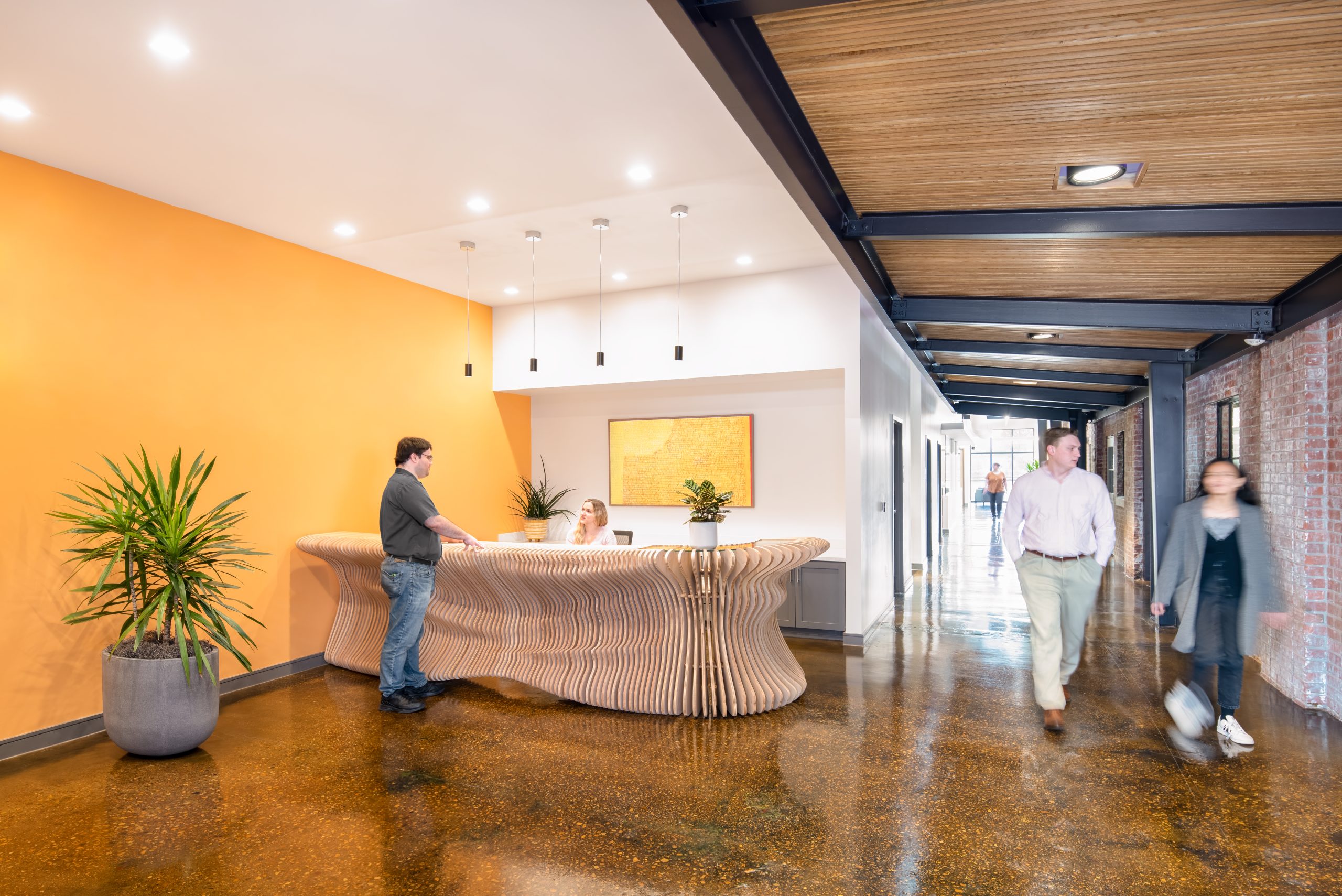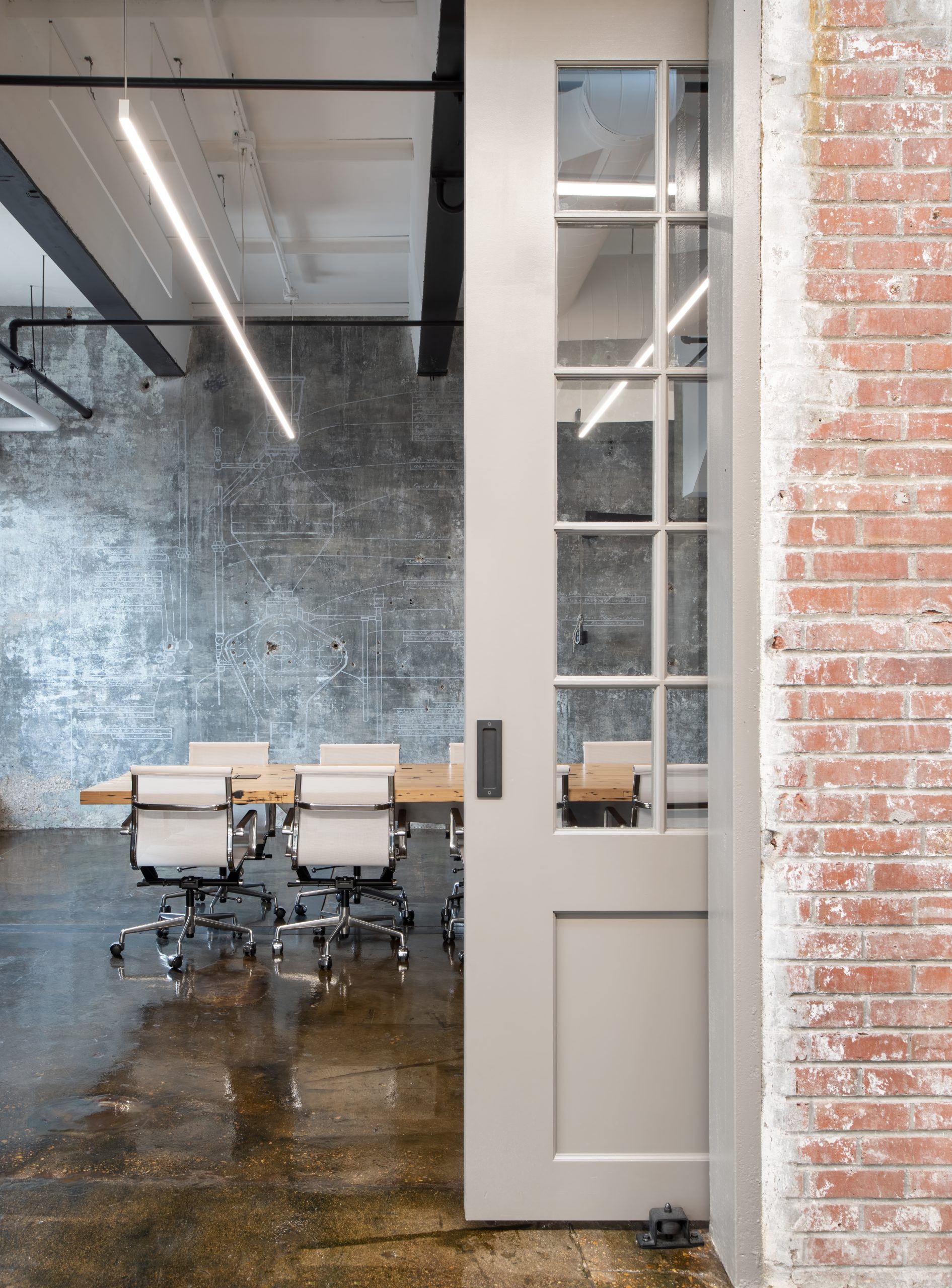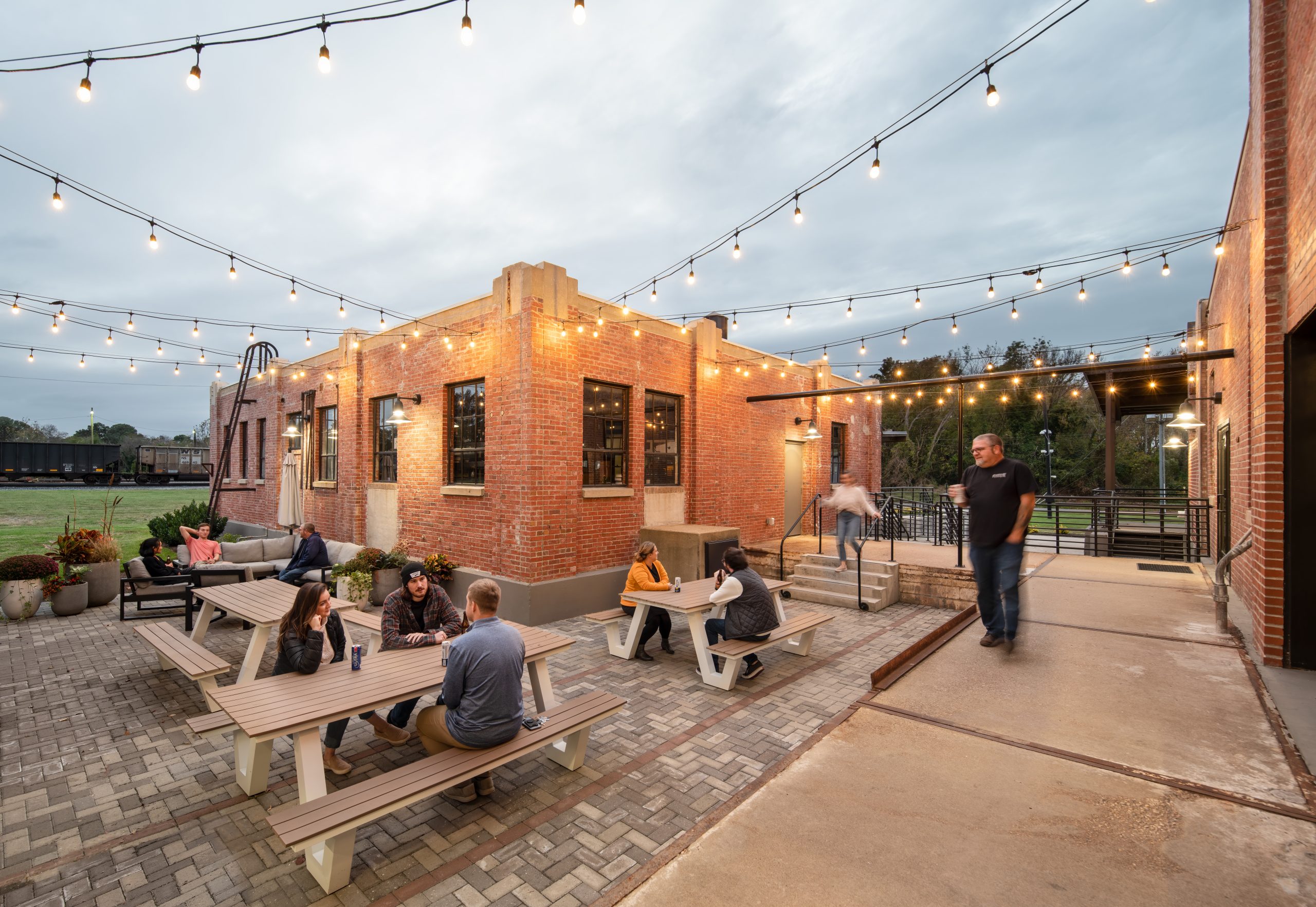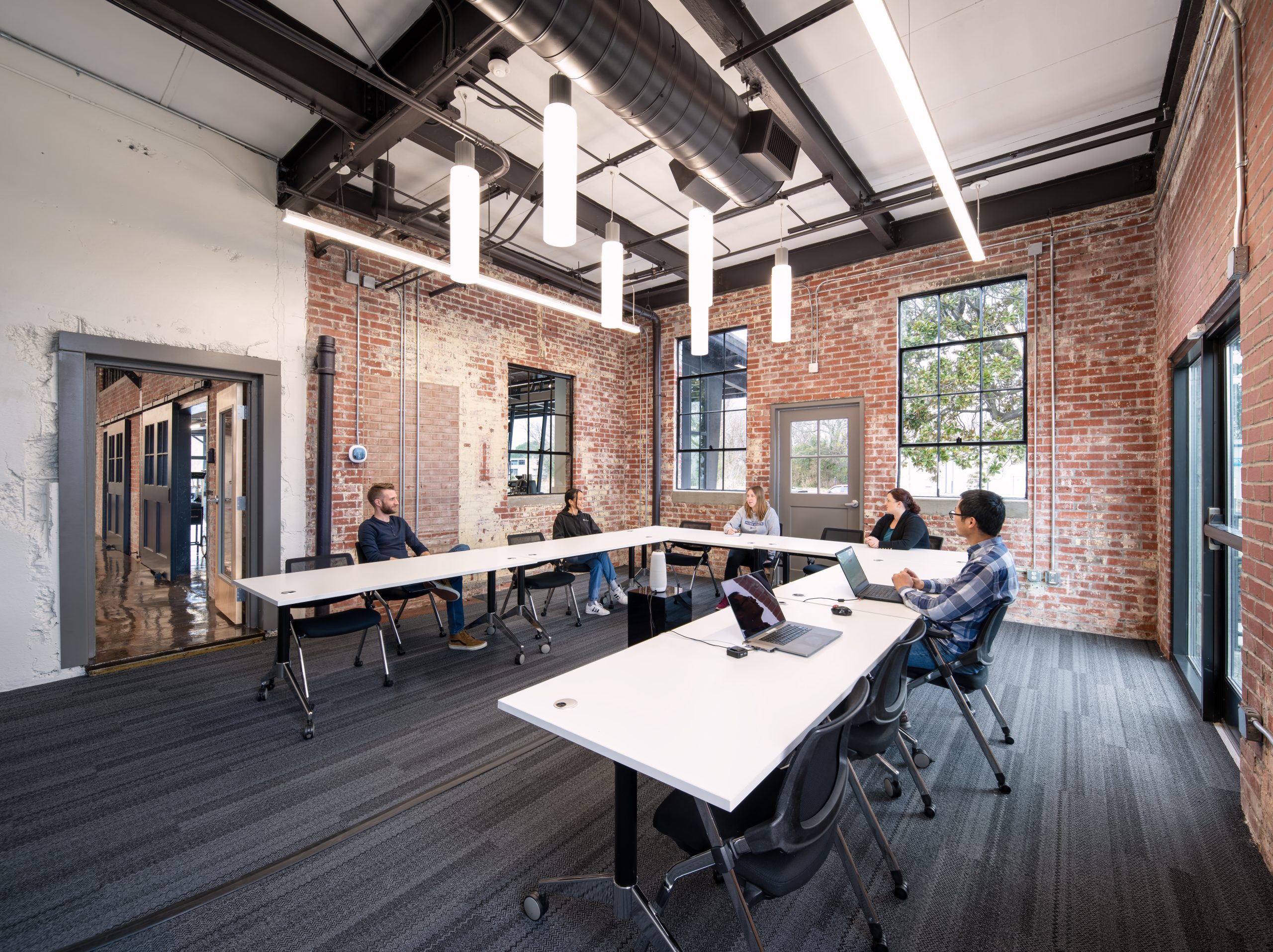 IPConfigure’s knowledge workers are based in the historic portion of the building, while camera assembly takes place in a newer metal addition. An original loading dock canopy welcomes visitors into the building and an “Experience Center” with a coffee shop, where they can see products in use. Skylights and new light fixtures cast a warm glow in the reception area, filtered through new wood slats installed in the steel canopy. A new steel staircase leads up to the original tower—once a testing ground for acetylene gas, now transformed into a break room and lounge.