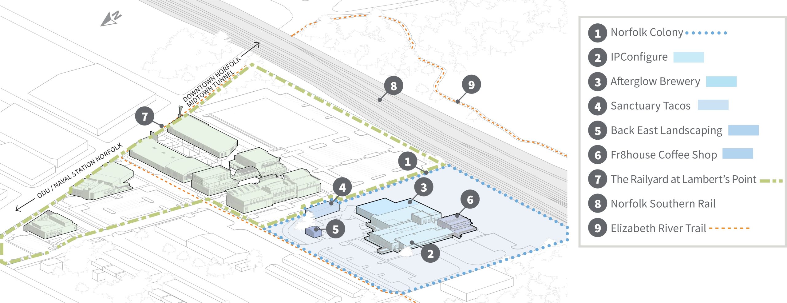 IPConfigure has occupied part of the building for its headquarters while reserving the remaining space for complementary tenants focused on technology and placemaking. The broader development, Norfolk Colony, seeks multiple tenants to activate the building’s outdoor space and contribute to revitalization efforts in the Lambert’s Point neighborhood.