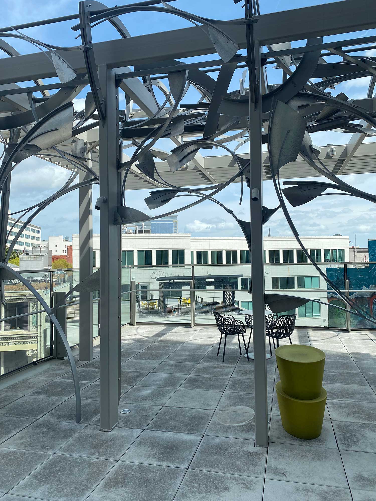 To cap off the project, a new outdoor patio was designed for an area of rooftop at the third floor level, which had not previously been accessible from the building interior. Designed to respond to contextual cues from neighboring buildings, the new patio helps establish Plume Street as a gateway corridor to Downtown from MacArthur Square.