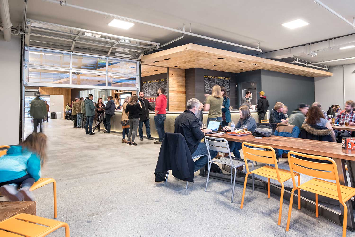 The design solution included a roll-up glass garage door to separate the space when needed, along with a concealed barn door that divides the bar—ensuring both areas have access to taps and space for beertenders to serve.