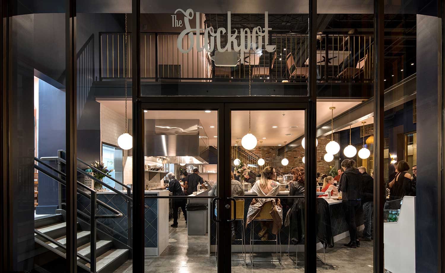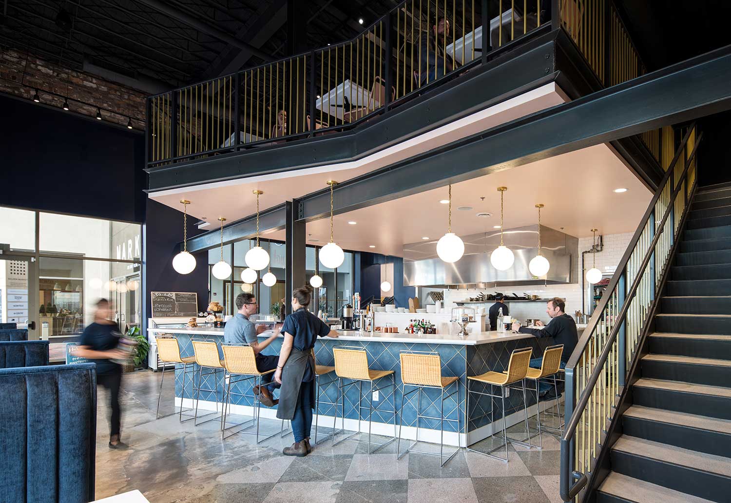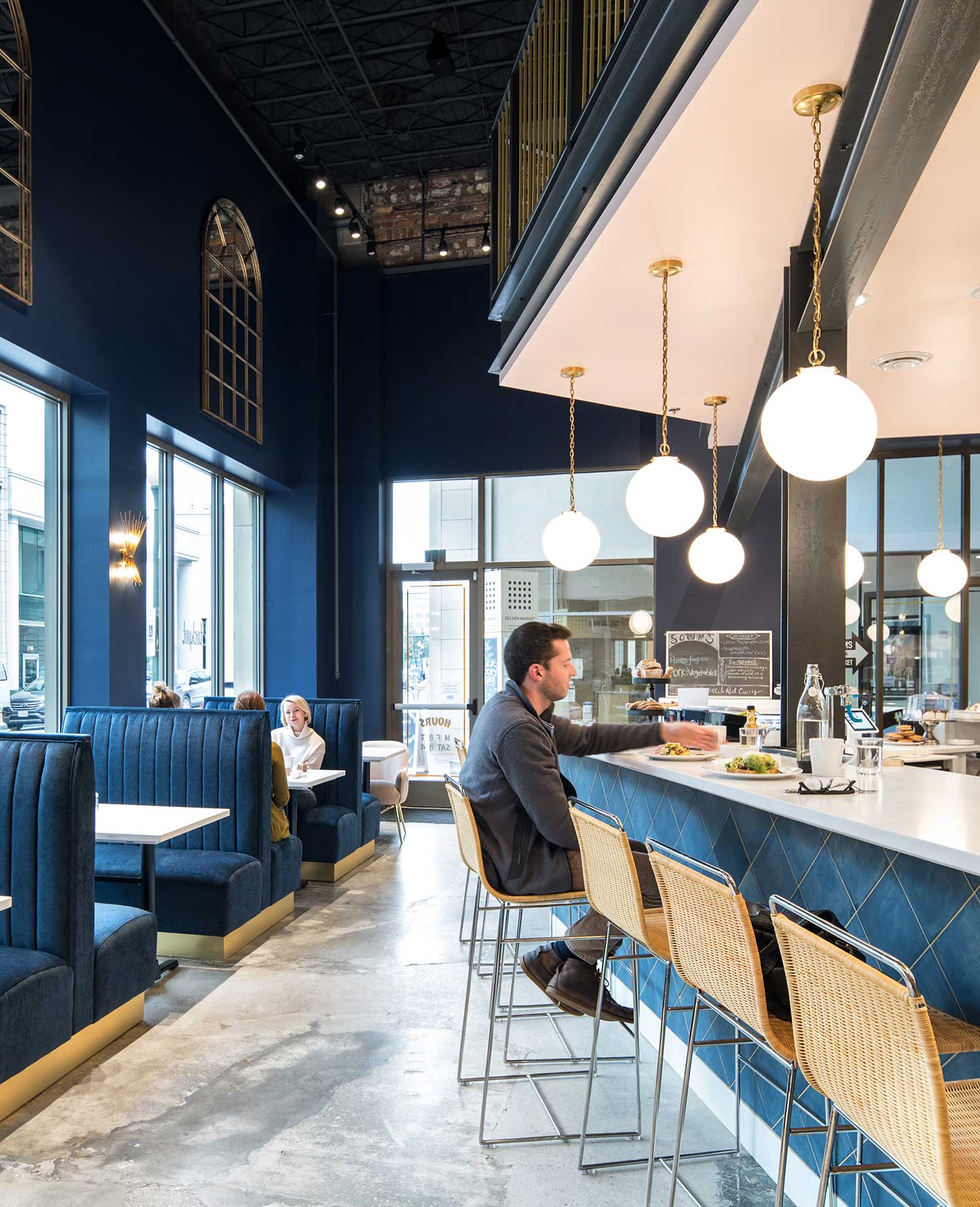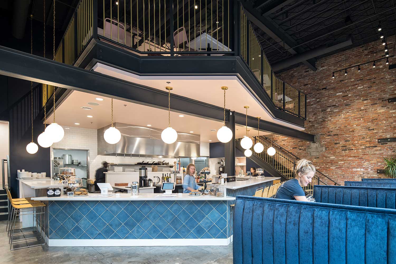 The design centers around an open kitchen, allowing patrons to watch as healthy, fresh, award-winning soups and salads are made. The double-height space has been reinvigorated with a new mezzanine perched above the bar, plush velvet booths, clean subway tile, elegant pendant lights, and handcrafted wrought-iron railings that evoke the 1930s. Exposed brick walls provide a striking backdrop for a custom art installation.