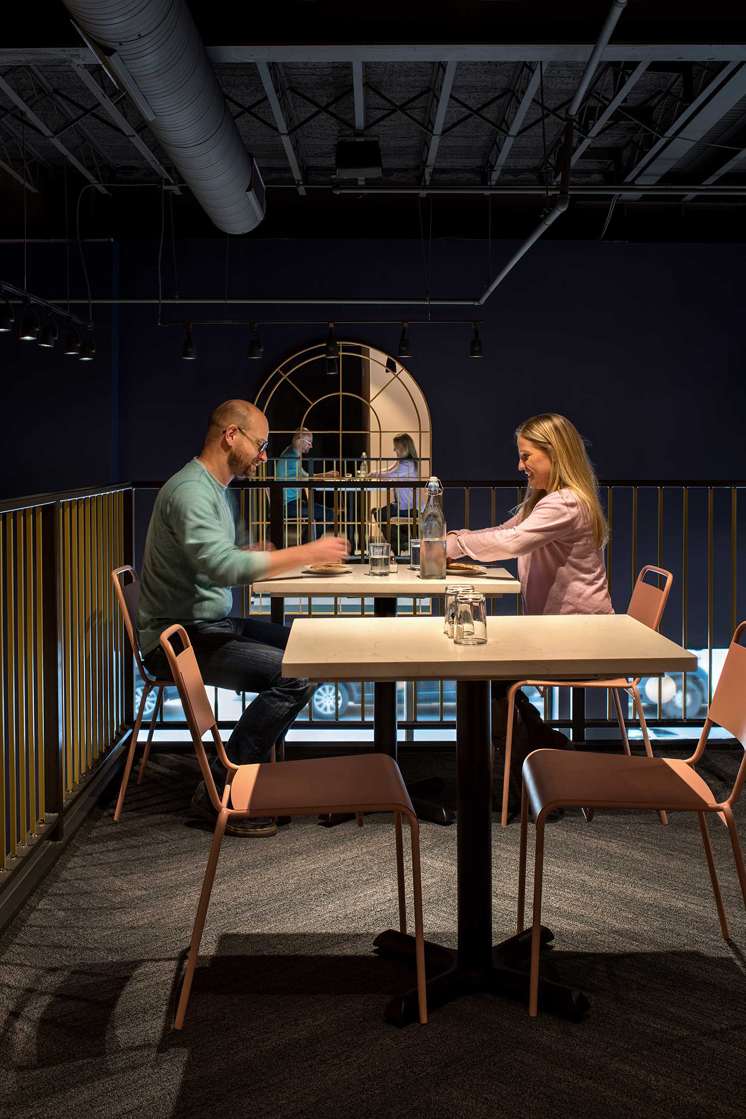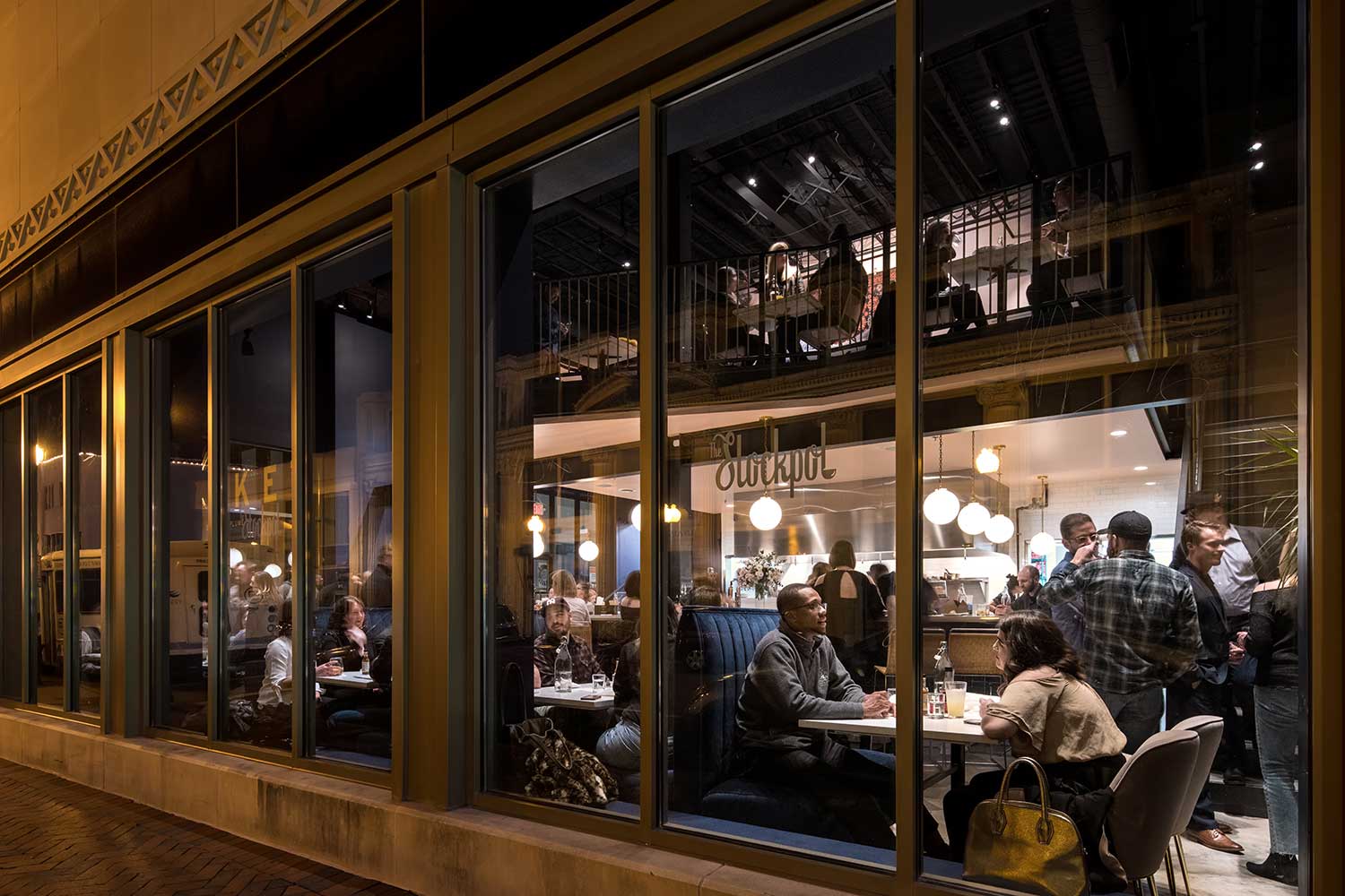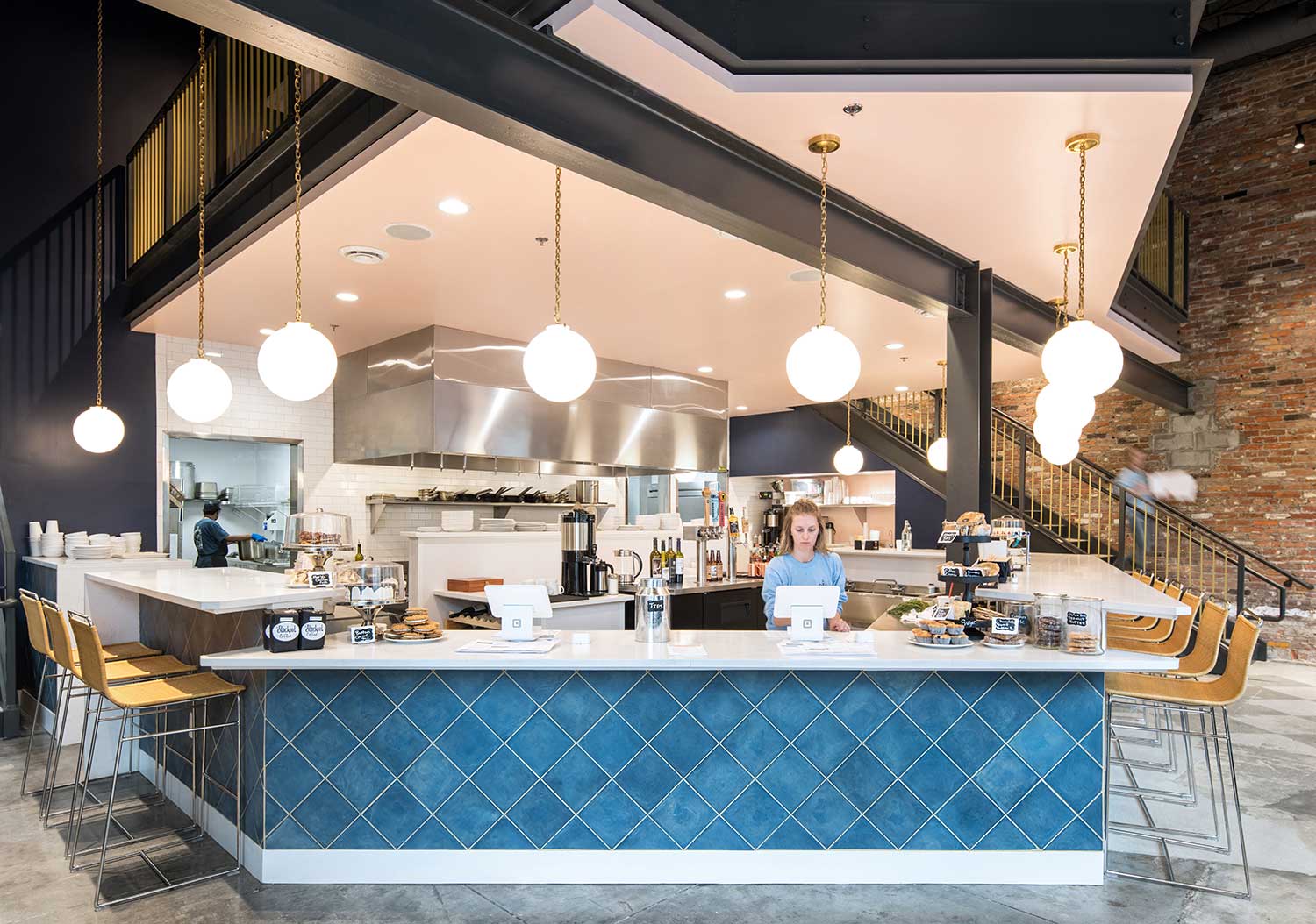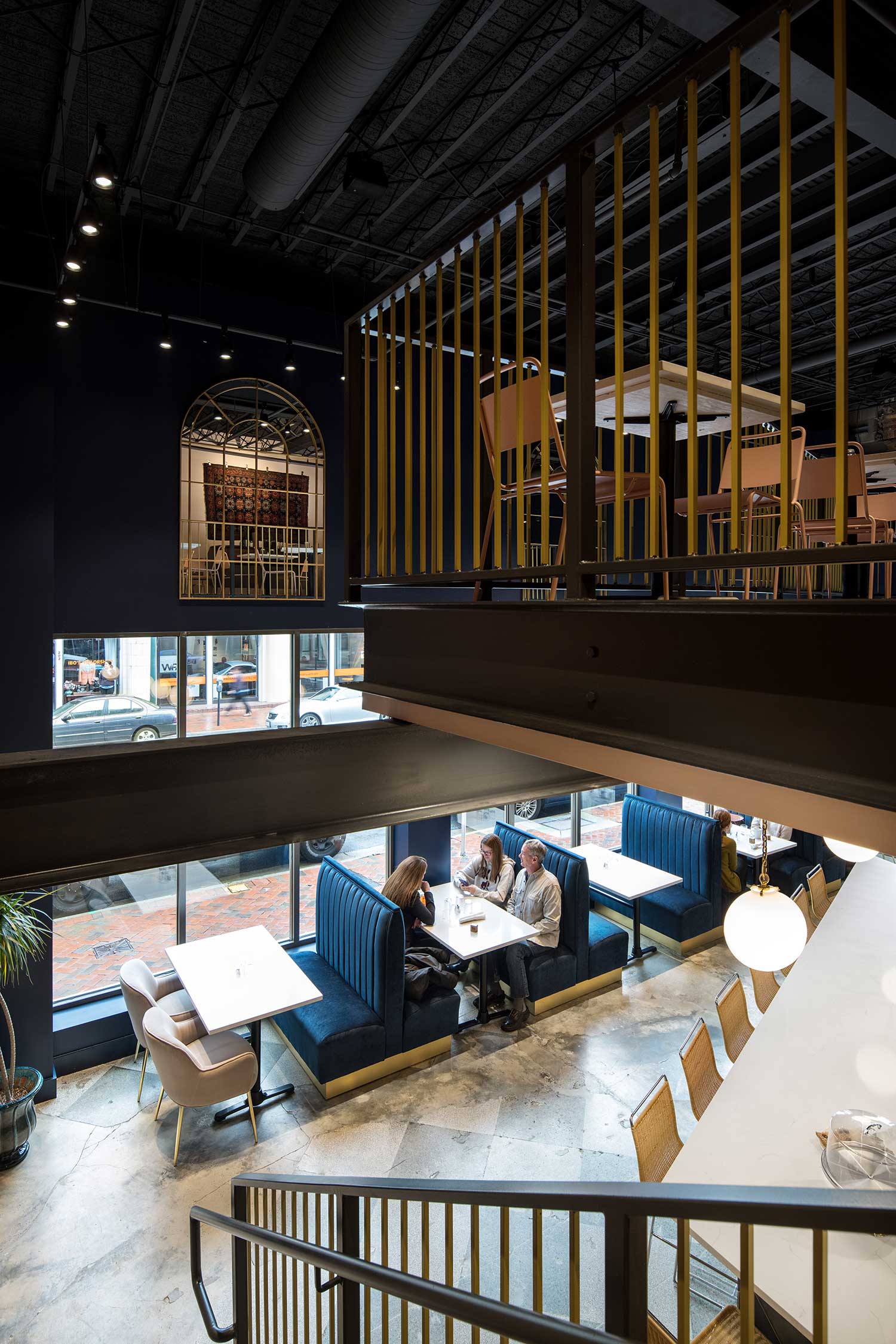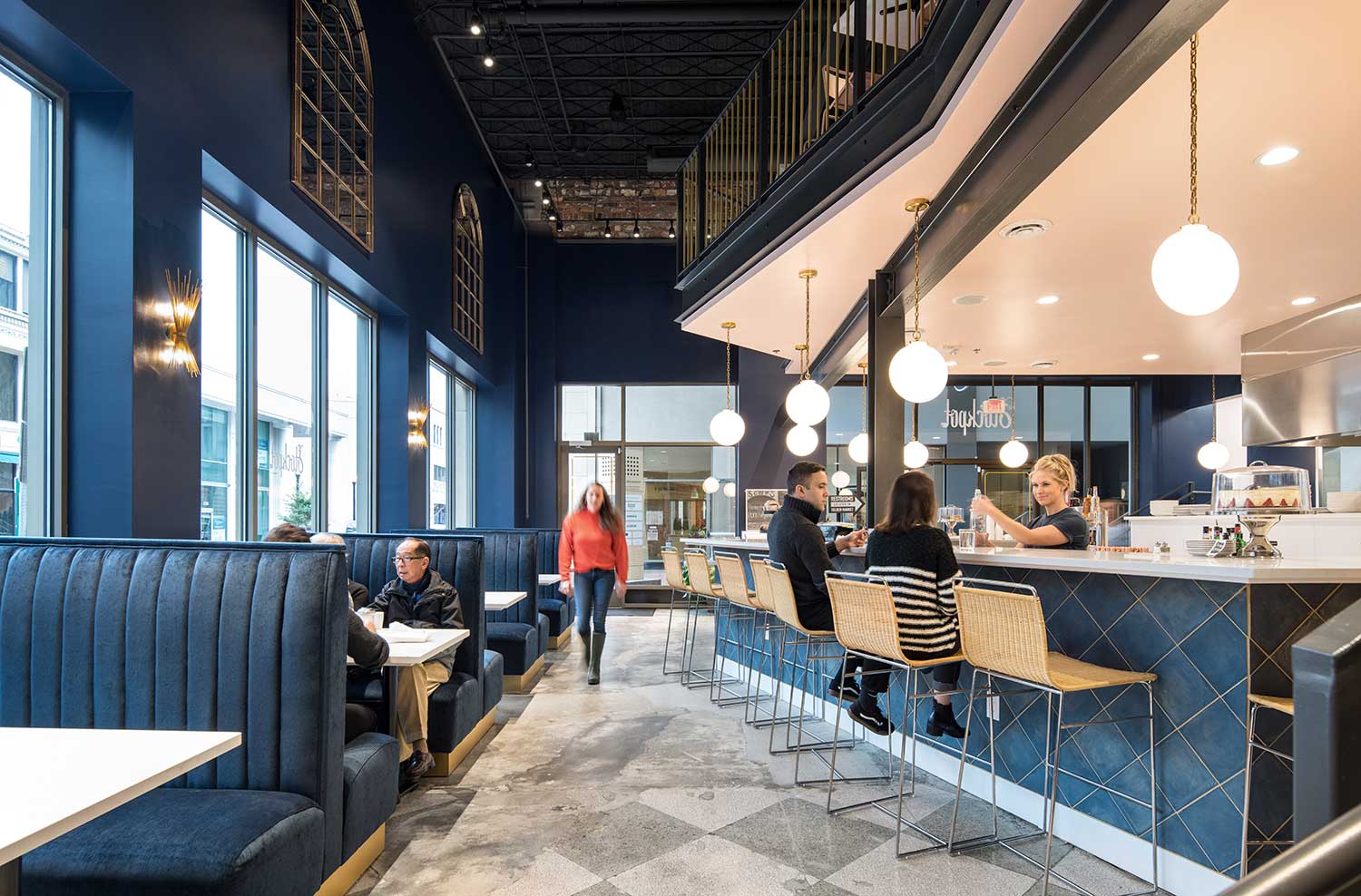 The design centers around an open kitchen, allowing patrons to watch as healthy, fresh, award-winning soups and salads are made. The double-height space has been reinvigorated with a new mezzanine perched above the bar, plush velvet booths, clean subway tile, elegant pendant lights, and handcrafted wrought-iron railings that evoke the 1930s. Exposed brick walls provide a striking backdrop for a custom art installation.