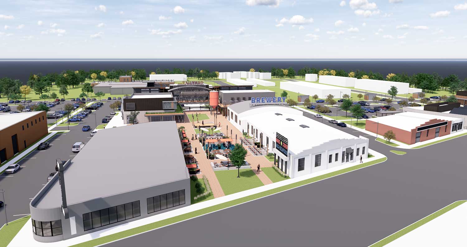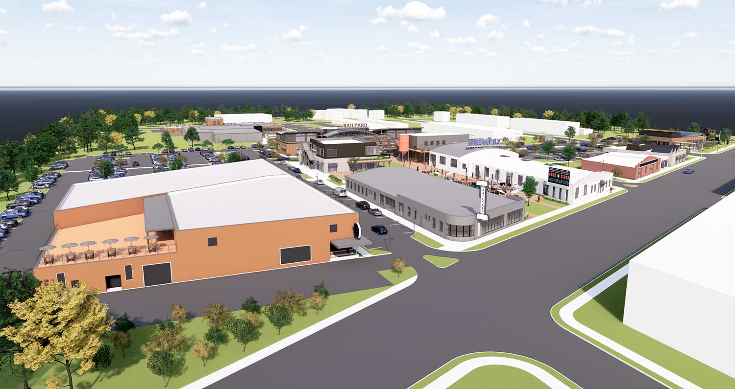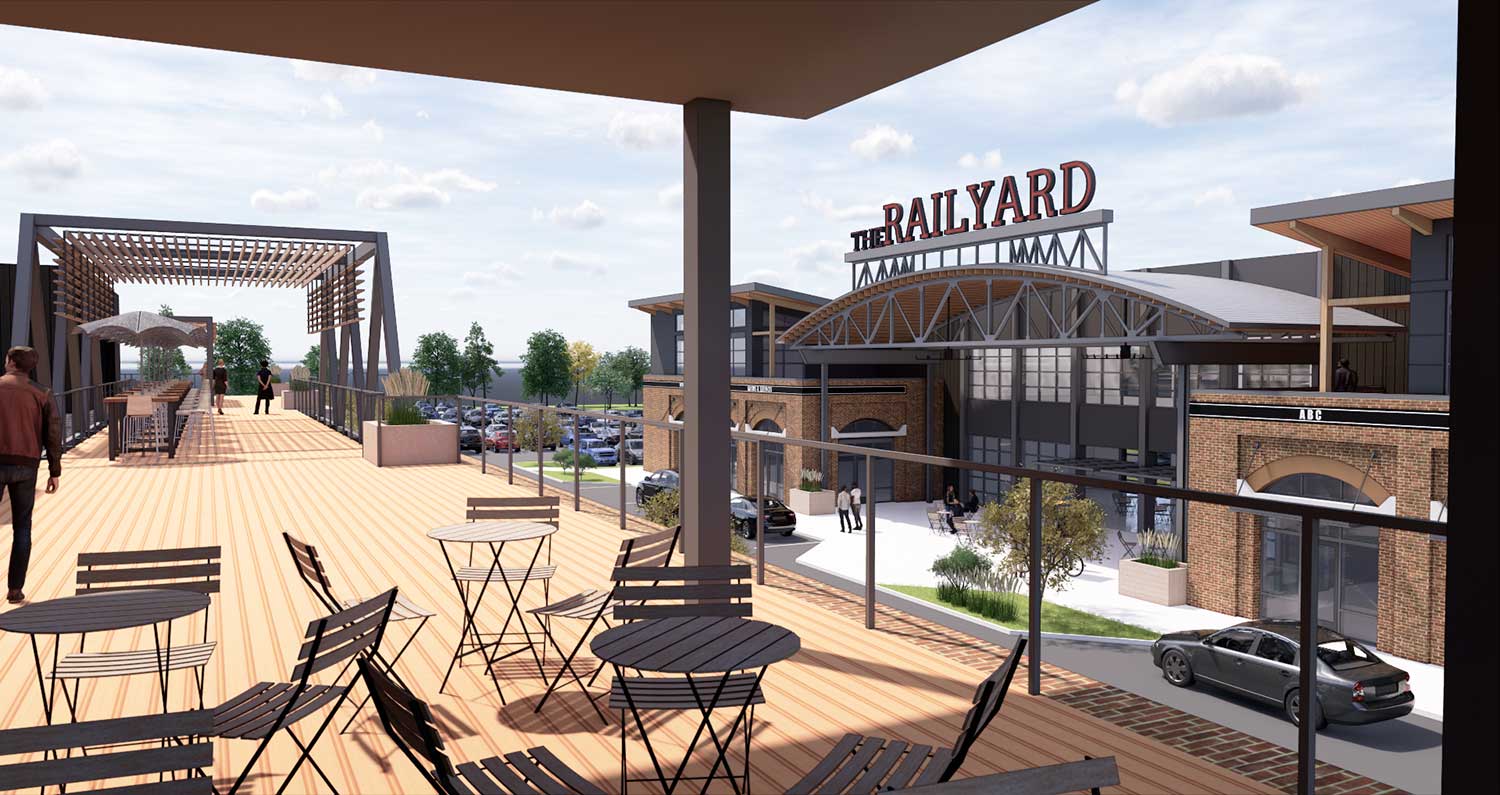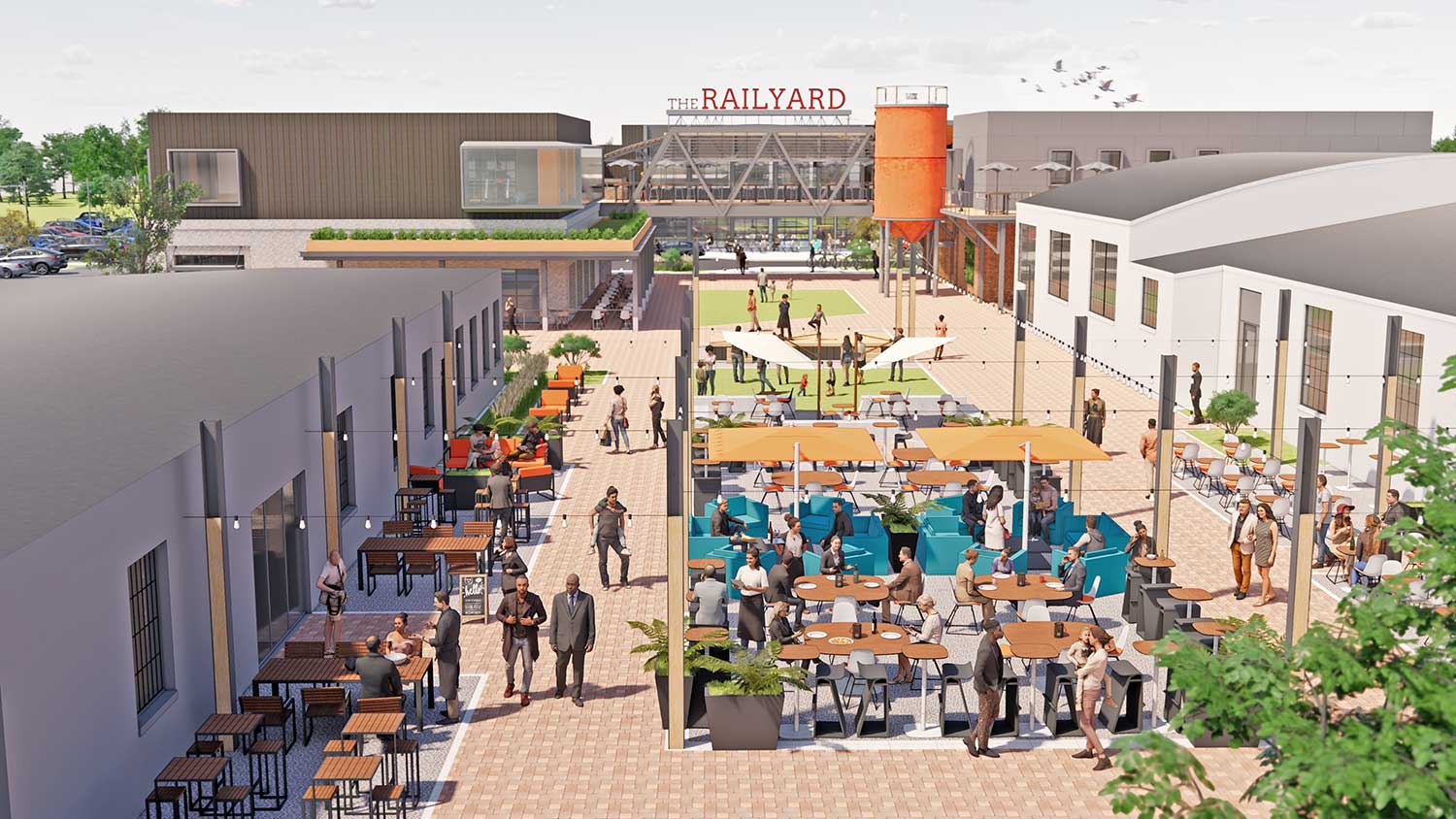 Meredith has long owned four of the five historic buildings on the site, which were constructed between 1920 and 1940. Two previously functioned as mini-storage facilities, while another—the former Hogshire Industries building—had remained vacant since 2010. Now, all these structures have been repurposed alongside five newly constructed buildings between W. 24th and W. 26th Streets. The development includes a diverse mix of retail, office space, casual and fine dining, a brewpub, and fitness and wellness spaces, all centered around an inviting outdoor courtyard. The courtyard features a stage for live events, space for a farmers market, and a historic train engine, serving as the backdrop for “The Railyard at Lambert’s Point” sign at the north end of the project.