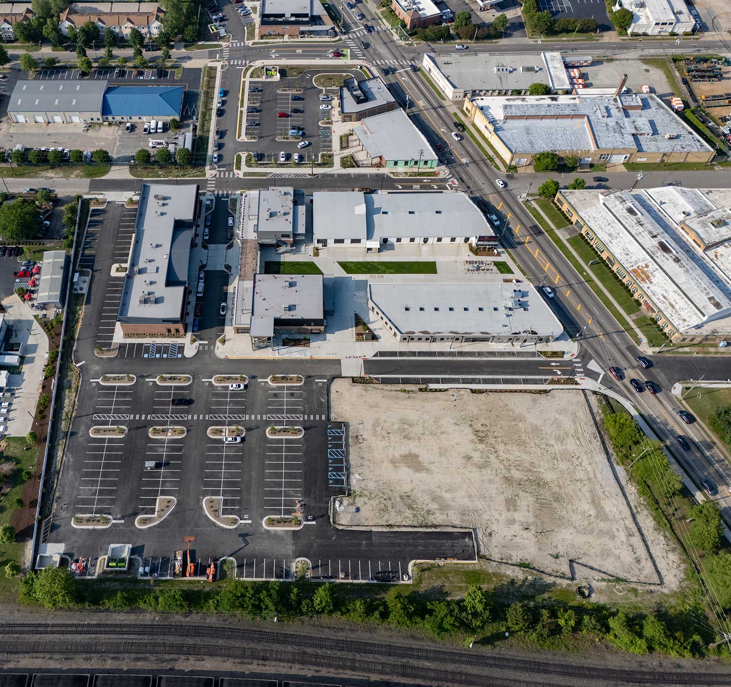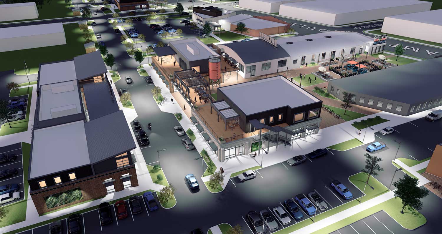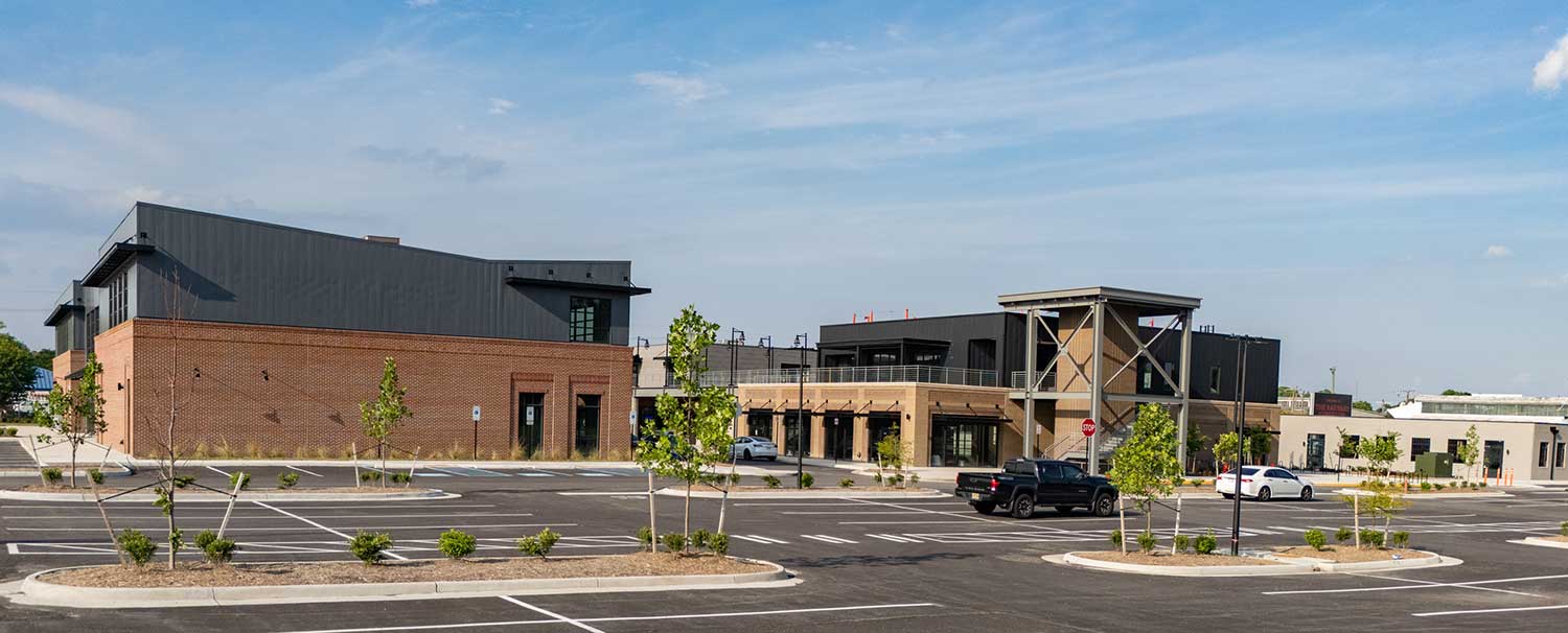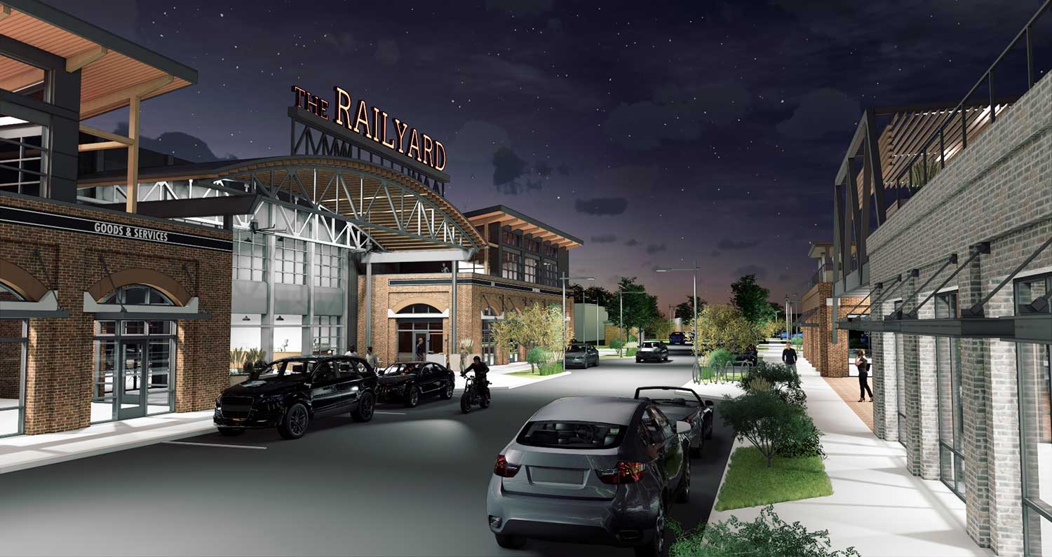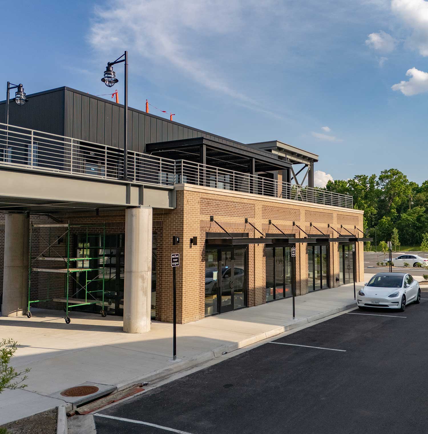 Meredith has long owned four of the five historic buildings on the site, which were constructed between 1920 and 1940. Two previously functioned as mini-storage facilities, while another—the former Hogshire Industries building—had remained vacant since 2010. Now, all these structures have been repurposed alongside five newly constructed buildings between W. 24th and W. 26th Streets. The development includes a diverse mix of retail, office space, casual and fine dining, a brewpub, and fitness and wellness spaces, all centered around an inviting outdoor courtyard. The courtyard features a stage for live events, space for a farmers market, and a historic train engine, serving as the backdrop for “The Railyard at Lambert’s Point” sign at the north end of the project.