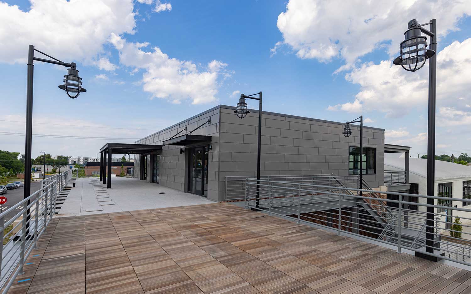 Each historic building retains its distinctive character. One structure features wooden columns reminiscent of trees, supporting a roof with restored skylights. Another boasts a barrel-vaulted ceiling, while the Hogshire building showcases its original steel beams, columns, and wood joists. Restored windows, historic signage, and awnings preserve the site’s industrial charm, while rooftop decks enhance outdoor dining and business spaces below.