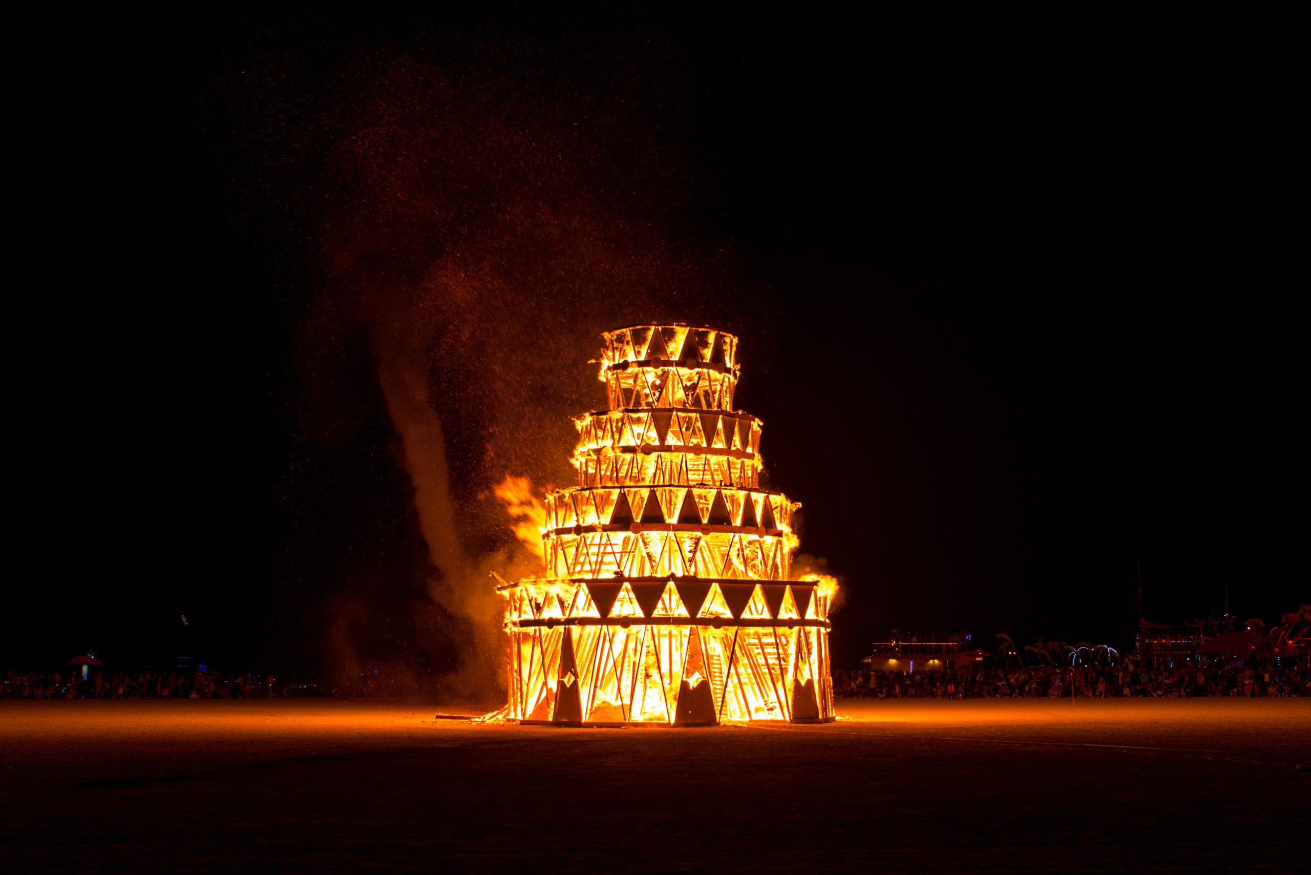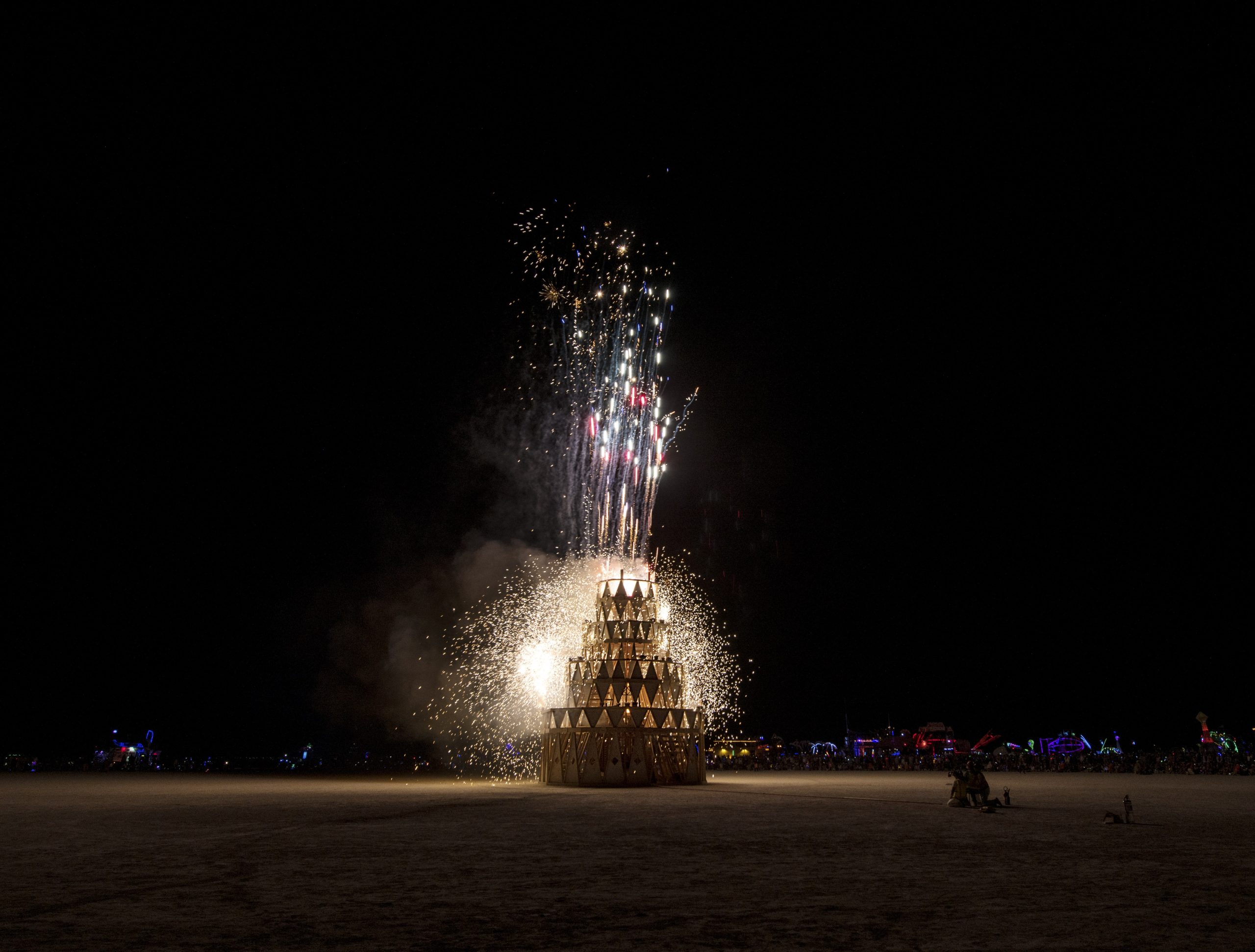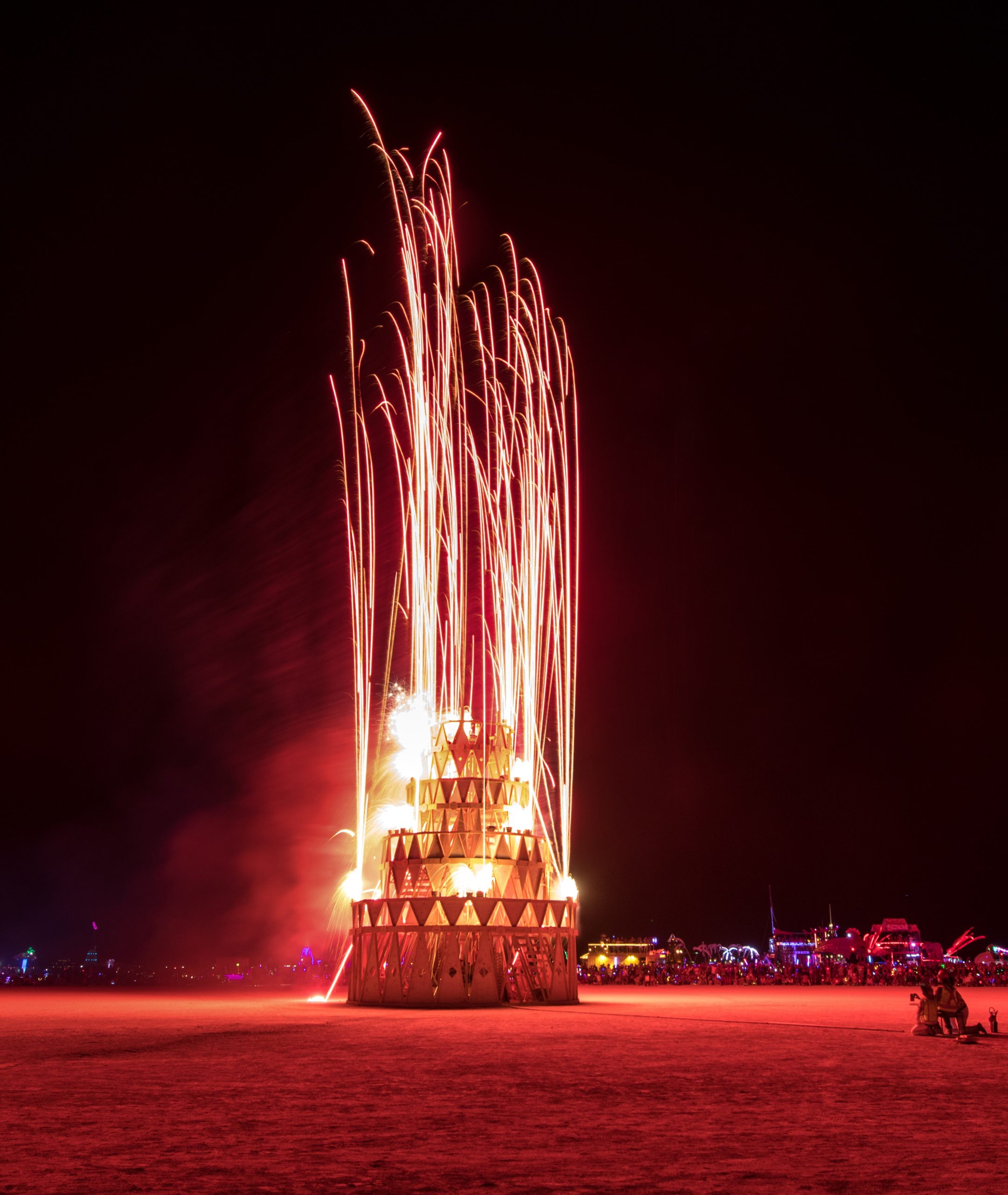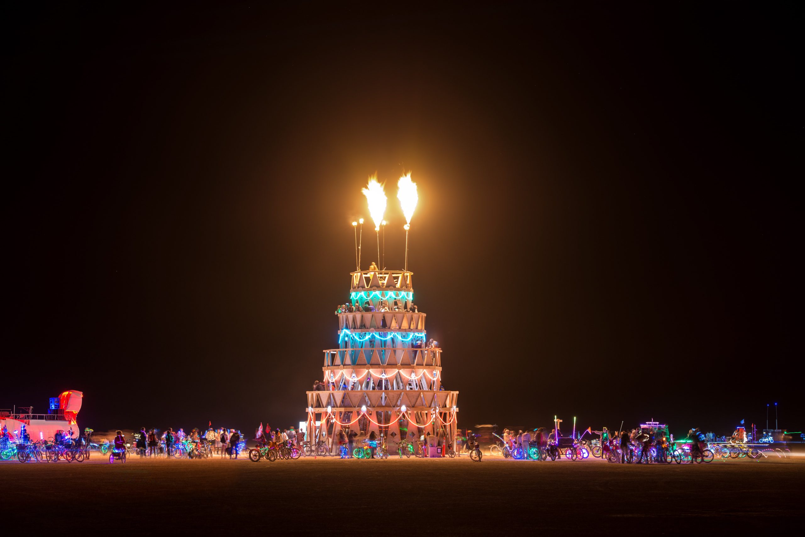 “Happy Birthday! (Mega Cake)” was born out of the idea to make an art piece that would be an instantly recognizable form at a massive scale and visible from long distances to draw a maximum number of visitors who, once there, would discover that they could enter, climb, explore, and interact with the piece, potentially leading to transformative experiences. The concept of a multi-tiered birthday cake worked perfectly to satisfy the vision: its form is recognizable from any vantage point, its stacked shape naturally allowed for exterior decks in the round for visitors to access, it offered many surfaces for decoration, and it created an opportunity for the incorporation of fire art (birthday cakes have candles, of course!). With 80,000 attendees, the piece would also serve a civic role as a place to celebrate each other’s birthdays, or those of loved ones not present.