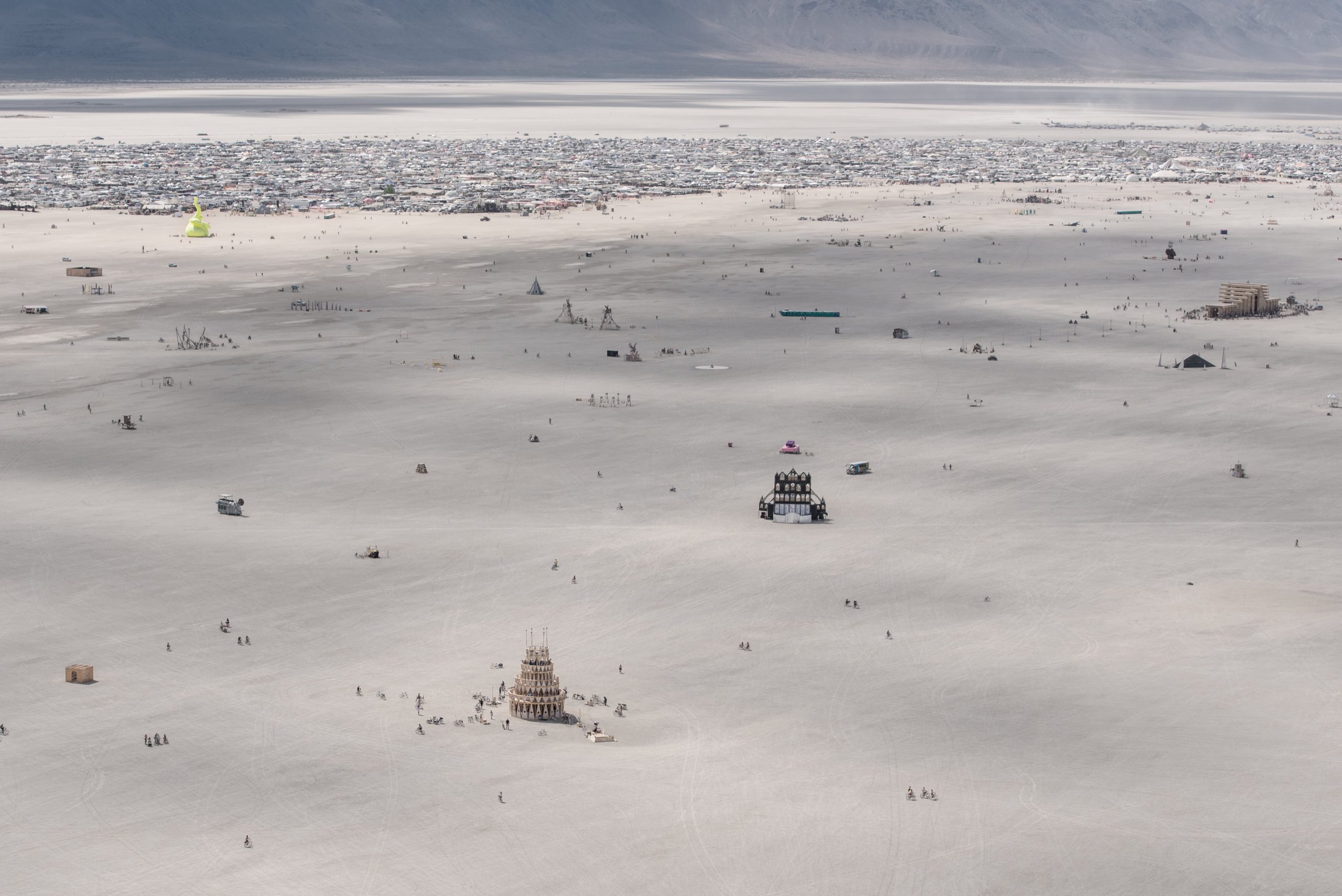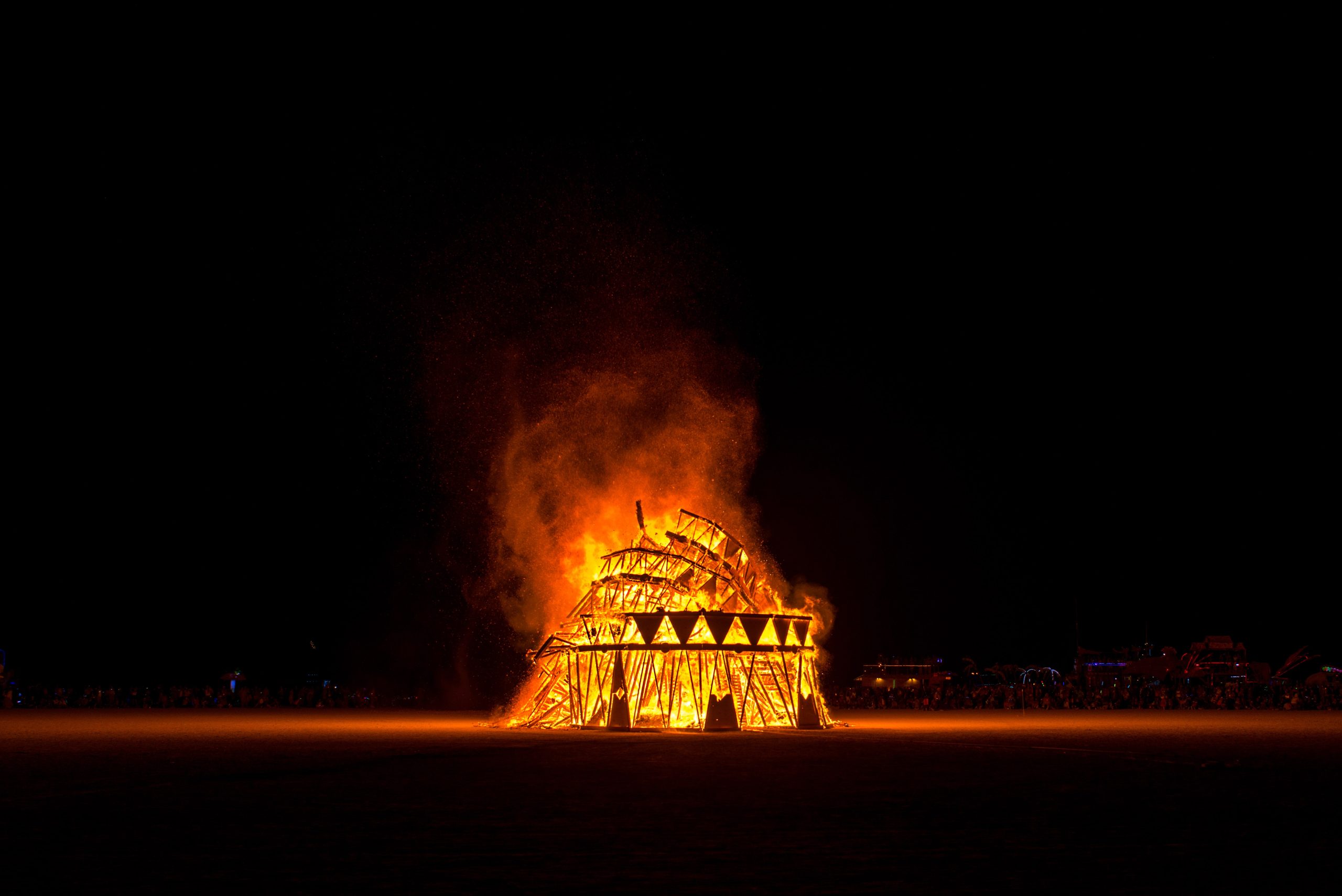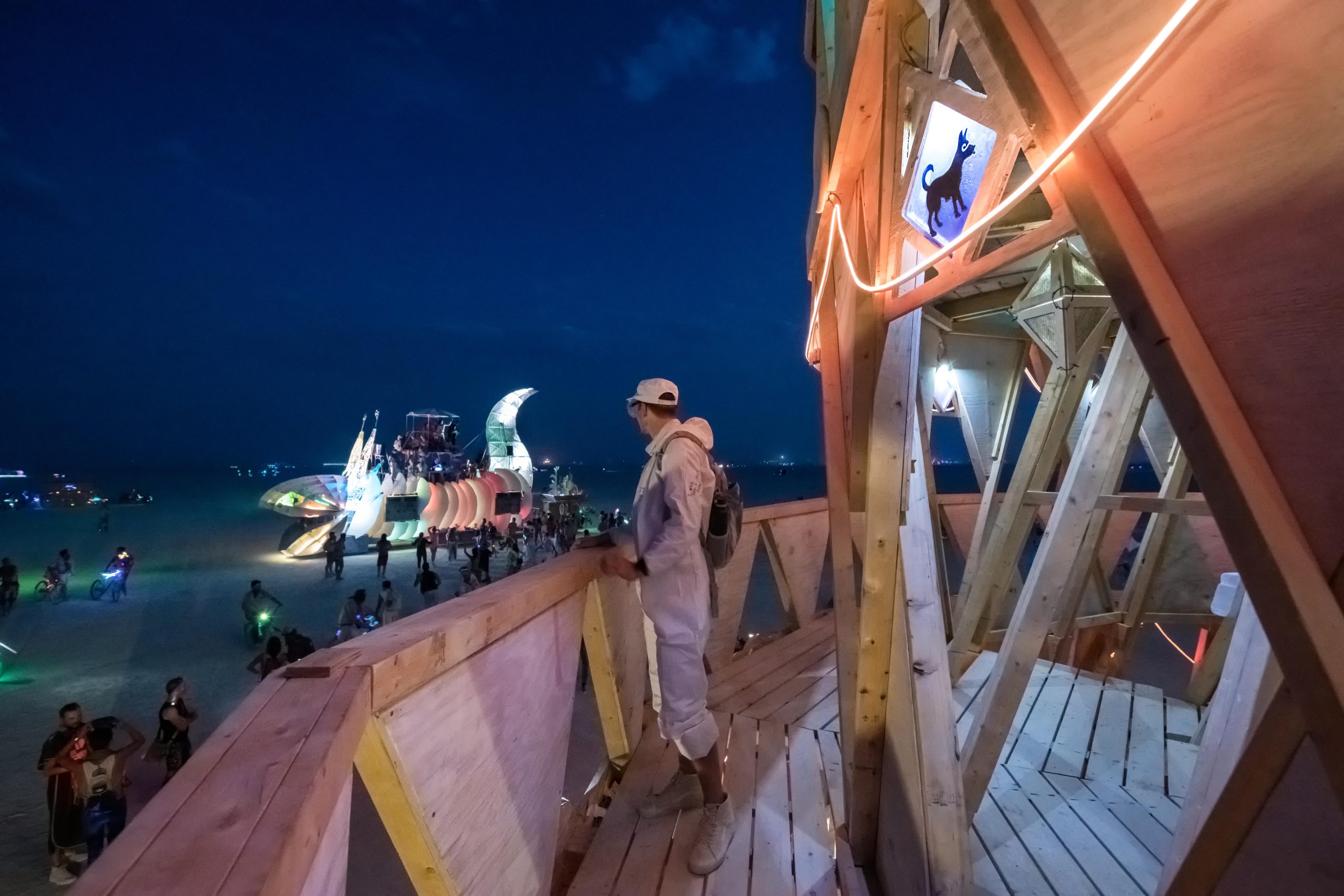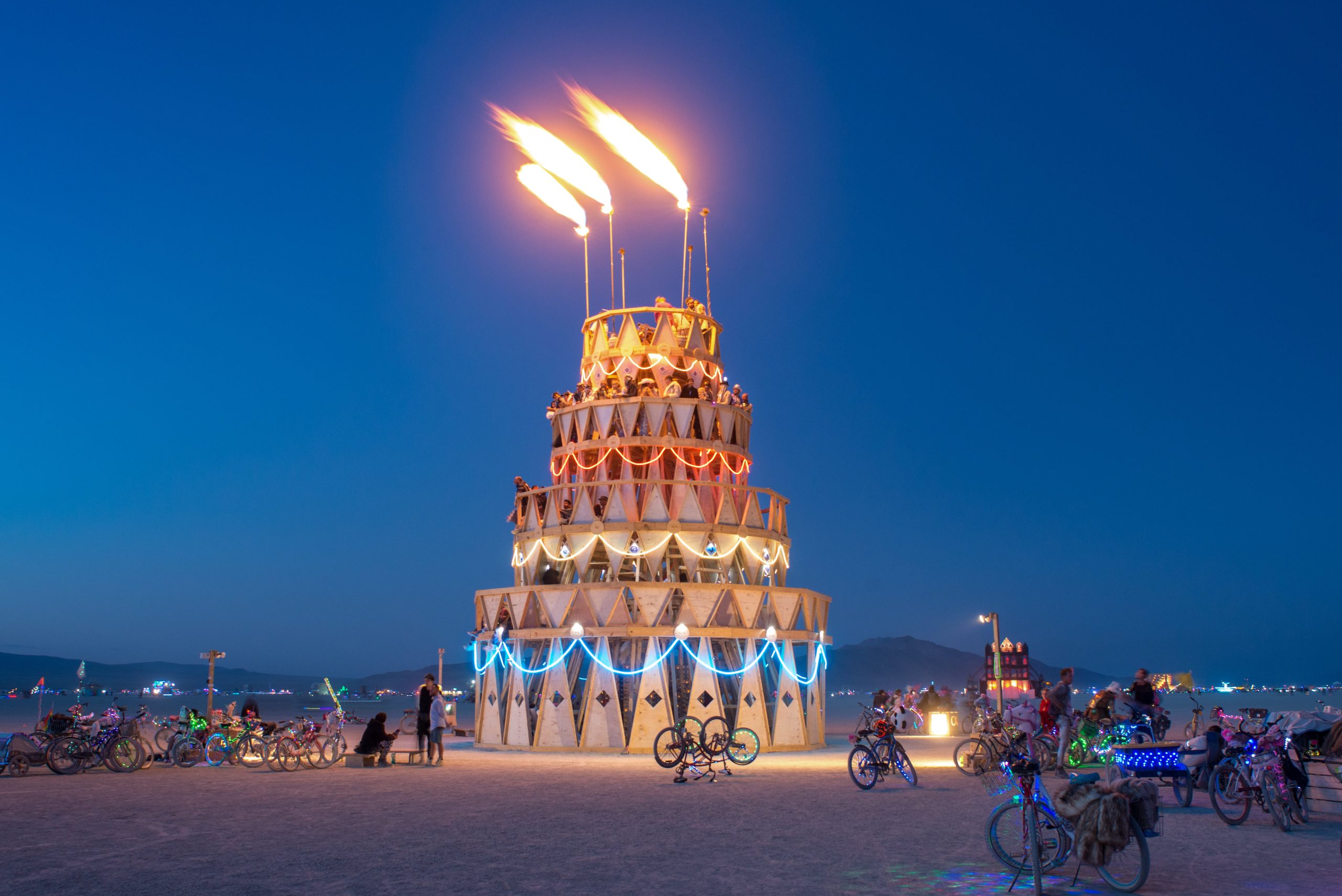 “Happy Birthday! (Mega Cake)” was born out of the idea to make an art piece that would be an instantly recognizable form at a massive scale and visible from long distances to draw a maximum number of visitors who, once there, would discover that they could enter, climb, explore, and interact with the piece, potentially leading to transformative experiences. The concept of a multi-tiered birthday cake worked perfectly to satisfy the vision: its form is recognizable from any vantage point, its stacked shape naturally allowed for exterior decks in the round for visitors to access, it offered many surfaces for decoration, and it created an opportunity for the incorporation of fire art (birthday cakes have candles, of course!). With 80,000 attendees, the piece would also serve a civic role as a place to celebrate each other’s birthdays, or those of loved ones not present.