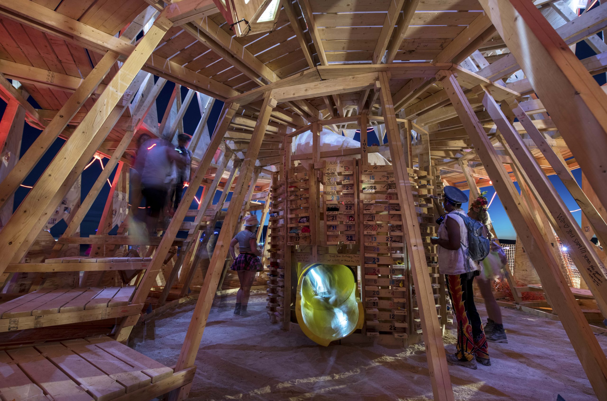 The Mega Cake was constructed with untreated southern pine lumber, ¾” plywood, non-toxic tempera paint, and LED lighting. Decorative and interactive features included custom fused glass art pieces by team member Jen Detlefsen, dichroic film and plexiglass art pieces by team member Tabatha Anger, custom CNC-cut plywood & LED pendant lights, a spiral slide, and a 12-sided “Gifting Calendar” with a shelf for every birthday during the year for visitors to leave and receive presents. A spiral stair connected each of the Cake’s four tiers to the ground, and a cone-shaped chamber in the center of the piece was used for performances and weddings. Six propane-fueled “poofer” candles sat atop the piece, with electronic controls to activate flame bursts. Power was provided by gasoline-fueled generators.