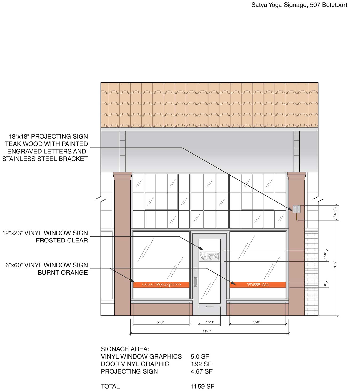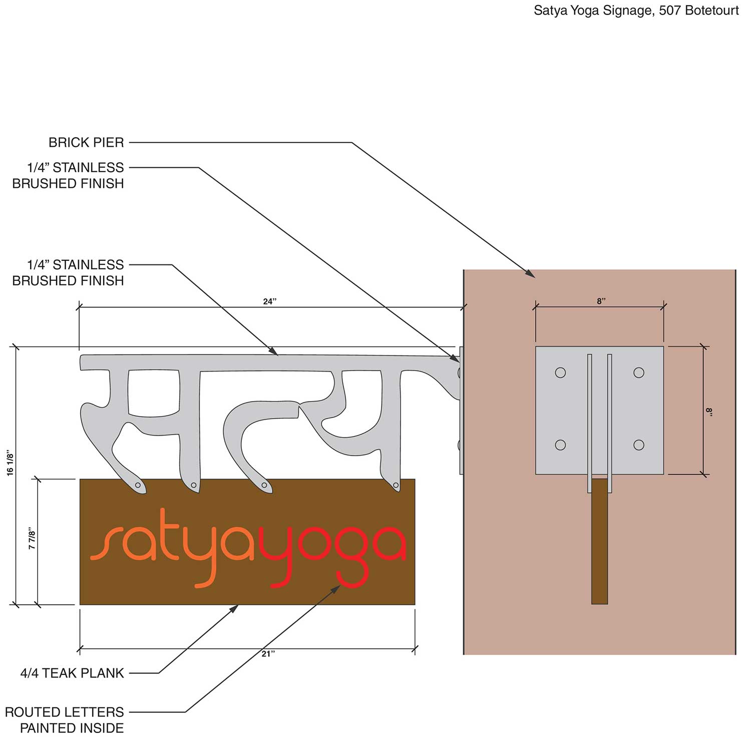WPA’s sign for Satya Yoga features a stainless steel and teak wood blend that fits nicely with the historic Freemason neighborhood in downtown Norfolk. The laser-cut stainless bracket spells out “Satya” in Sanskrit and is designed to be reminiscent of the Victorian brackets found on nearby buildings. The teak wood will age naturally to a dignified gray.