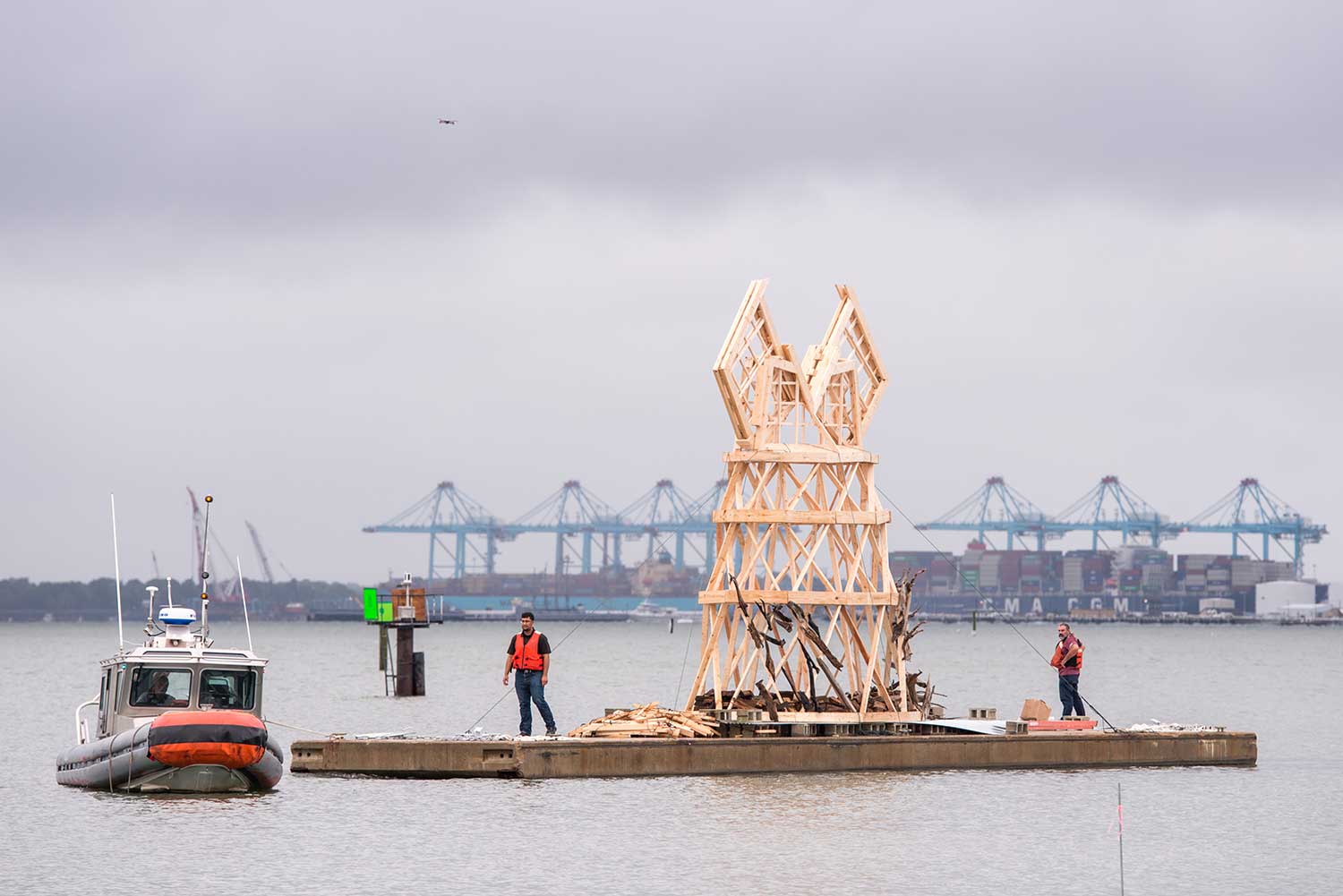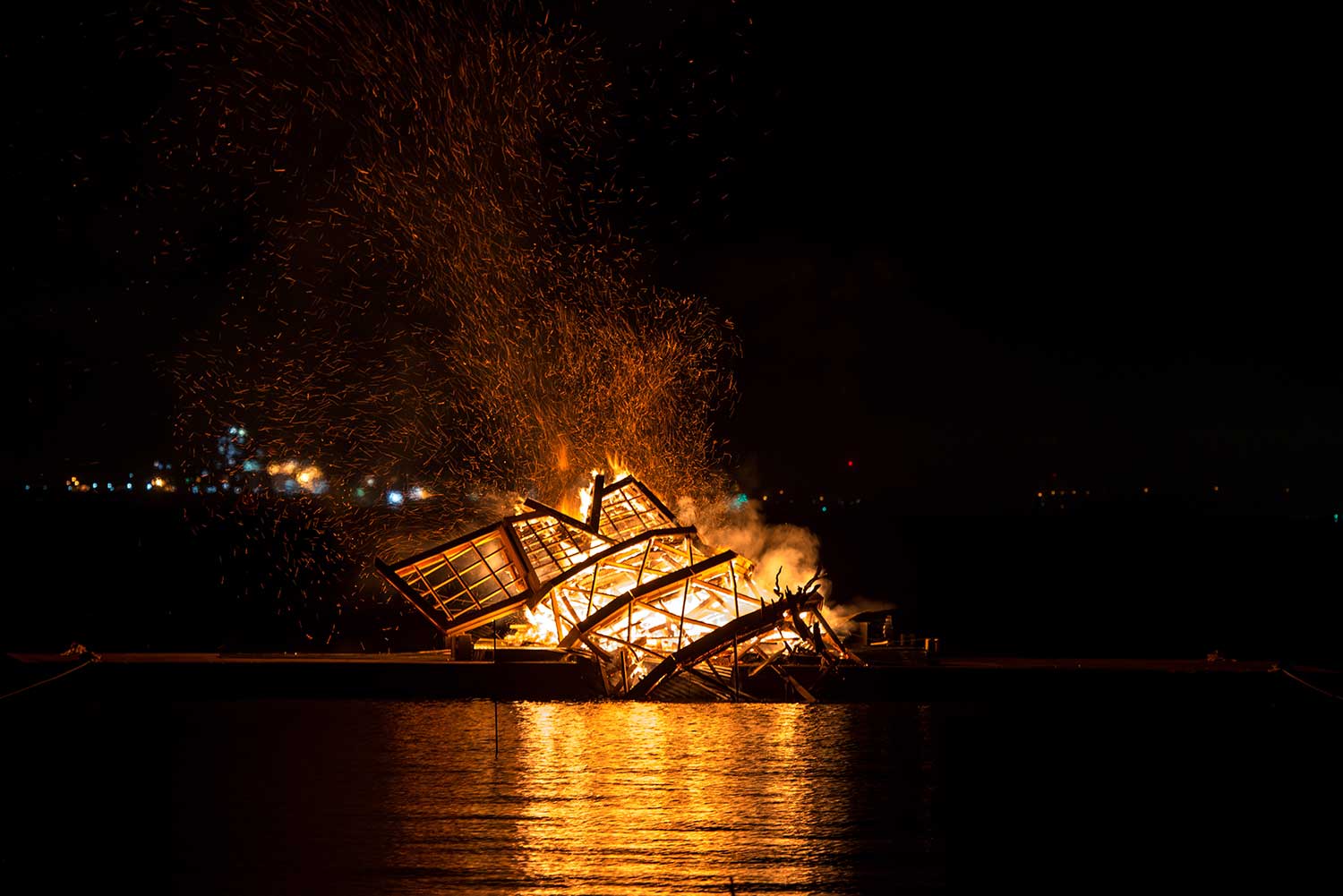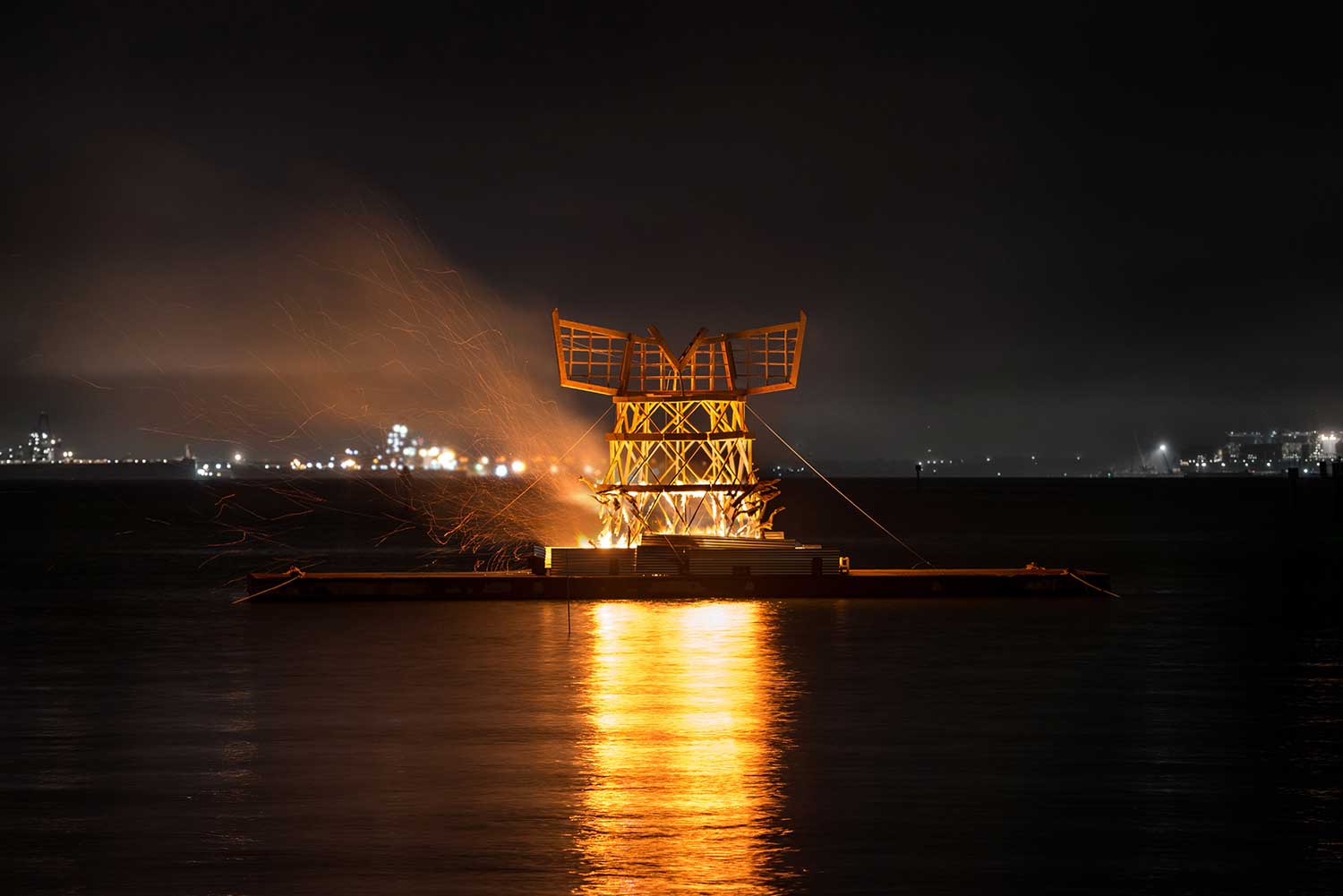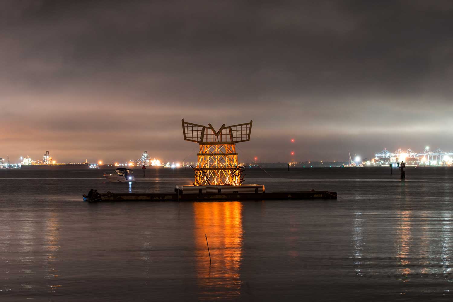 The Hermitage Museum closed their incredible five-month-long Art of Burning Man exhibition in October 2017. WPA’s Beth and Thom got involved with the show early on — volunteering to help with art installation and then organizing a bike ride from Smartmouth Brewing Company to the museum along the Elizabeth River Trail later in the summer. In late August, just as they were preparing to depart for dusty Black Rock City, an early fantasy became reality and the concept of a barge burn for the closing party was given the green light. A super FUN crew of local makers, artists, and burners quickly rallied to produce Thom’s design for a large wooden sculpture of a diving mermaid’s tail on a 60’ long floating concrete dock, which was then sent down the Elizabeth River toward the Museum. It was set alight the next night as a fitting tribute to the amazing artists and the community spirit fostered by the show. Special thanks to Cristina Fletcher, the City of Norfolk, 757 Makerspace, Lynch Mykins, Norfolk Tug Company, and so many others for their contributions in making it happen. Photos by Yuzhu Zheng.