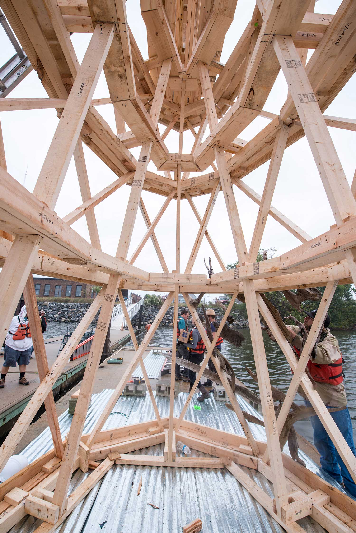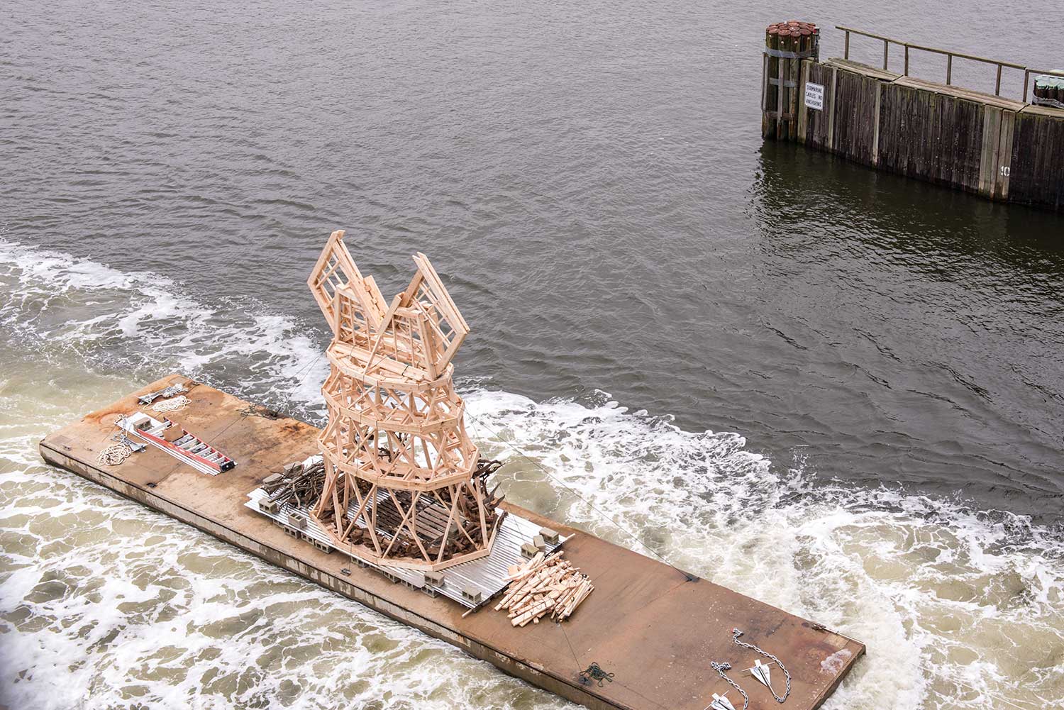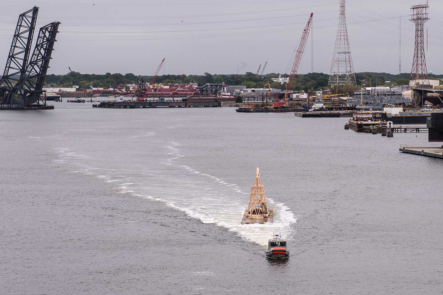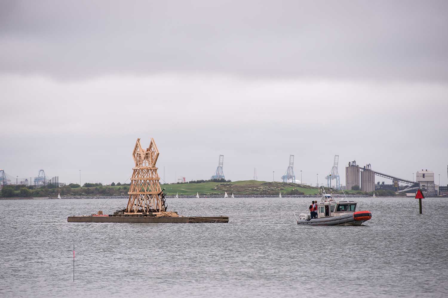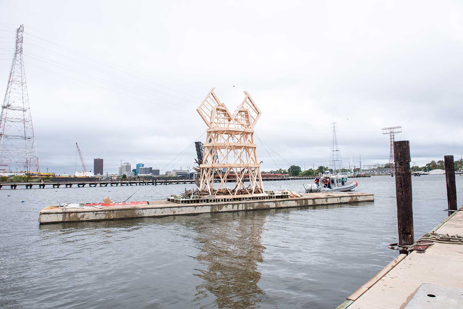 The Hermitage Museum closed their incredible five-month-long Art of Burning Man exhibition in October 2017. WPA’s Beth and Thom got involved with the show early on — volunteering to help with art installation and then organizing a bike ride from Smartmouth Brewing Company to the museum along the Elizabeth River Trail later in the summer. In late August, just as they were preparing to depart for dusty Black Rock City, an early fantasy became reality and the concept of a barge burn for the closing party was given the green light. A super FUN crew of local makers, artists, and burners quickly rallied to produce Thom’s design for a large wooden sculpture of a diving mermaid’s tail on a 60’ long floating concrete dock, which was then sent down the Elizabeth River toward the Museum. It was set alight the next night as a fitting tribute to the amazing artists and the community spirit fostered by the show. Special thanks to Cristina Fletcher, the City of Norfolk, 757 Makerspace, Lynch Mykins, Norfolk Tug Company, and so many others for their contributions in making it happen. Photos by Yuzhu Zheng.