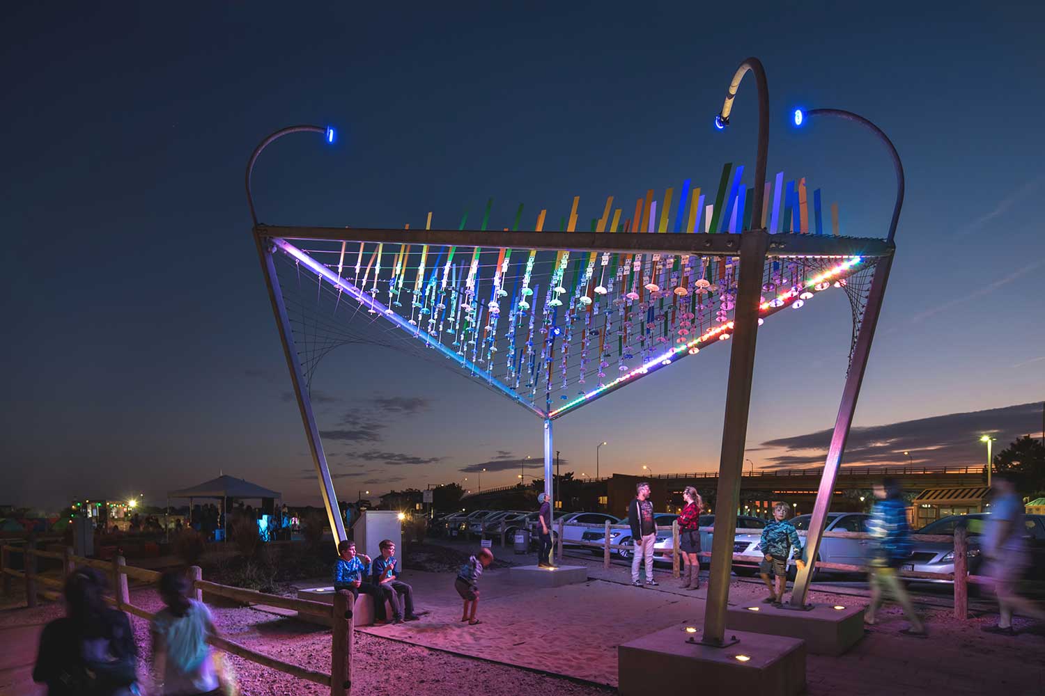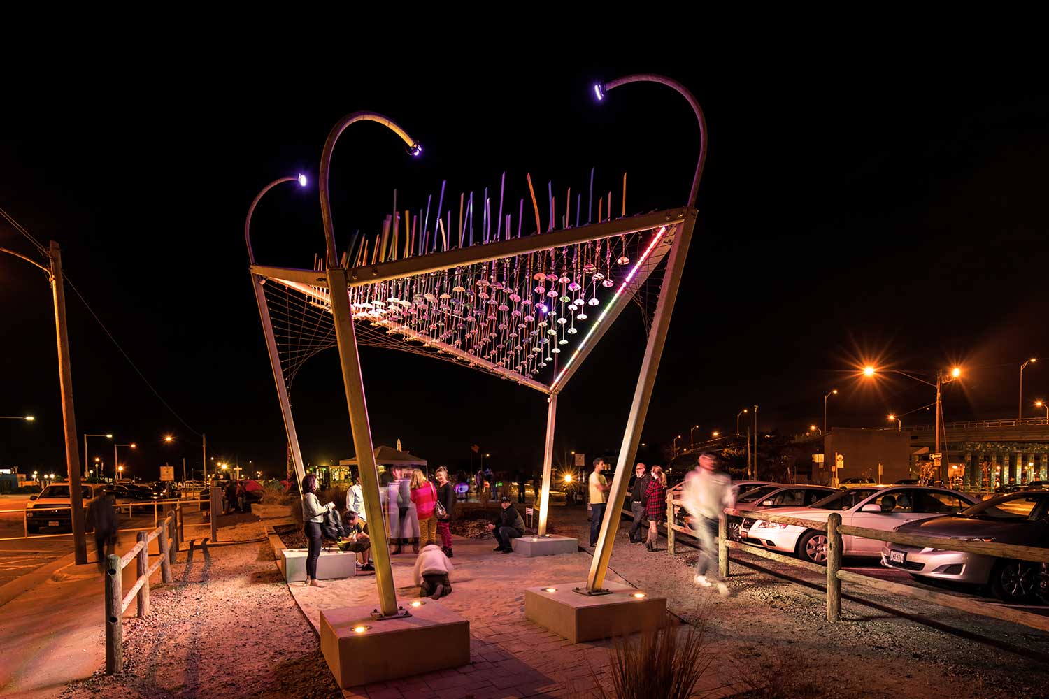 Designers drew inspiration from the vivid Walt Whitman poem of the same name, “World Below the Brine” to simulates the ever-changing landscape above and below the water’s surface. The interactive sculpture transforms itself with wind, sun and body movements. A tall framework anchored by concrete benches supports a grid of 200 wind paddles with sand-cast glass counterweights that undulate with the ocean breeze. Daytime visitors can walk below the piece and be covered in fluid diffused light and shadow. At night, the sculpture is illuminated with LED lighting that responds to visitors’ movements, creating the illusion of a floating anemone.