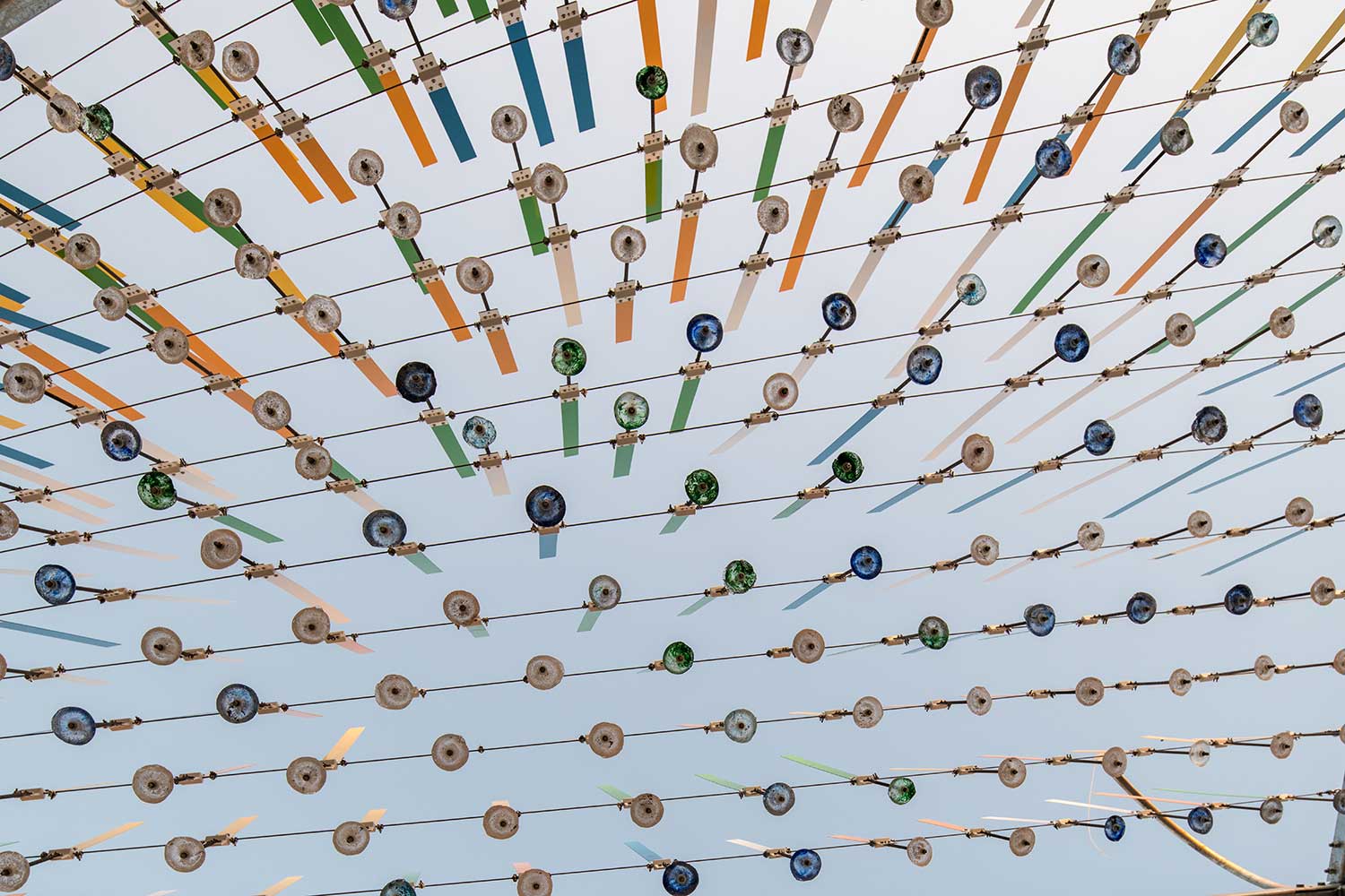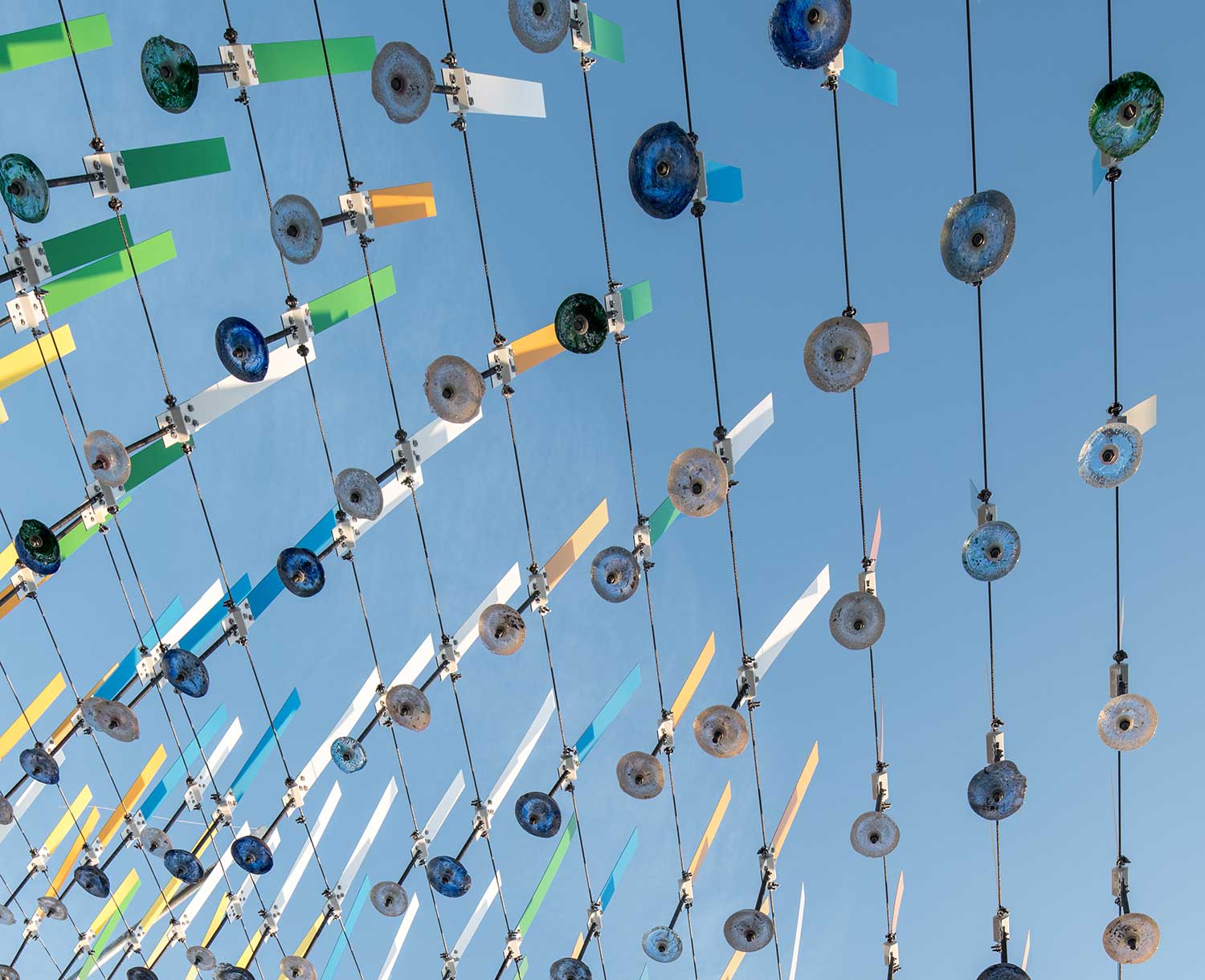 Cast glass counterweights were fabricated by a team at the Chrysler Museum of Art’s Perry Glass Studio. Art students from Princess Anne High School joined the project team at the 757 Makerspace Dream Factory to assemble the 200 wind paddles in preparation for the artwork’s debut.
