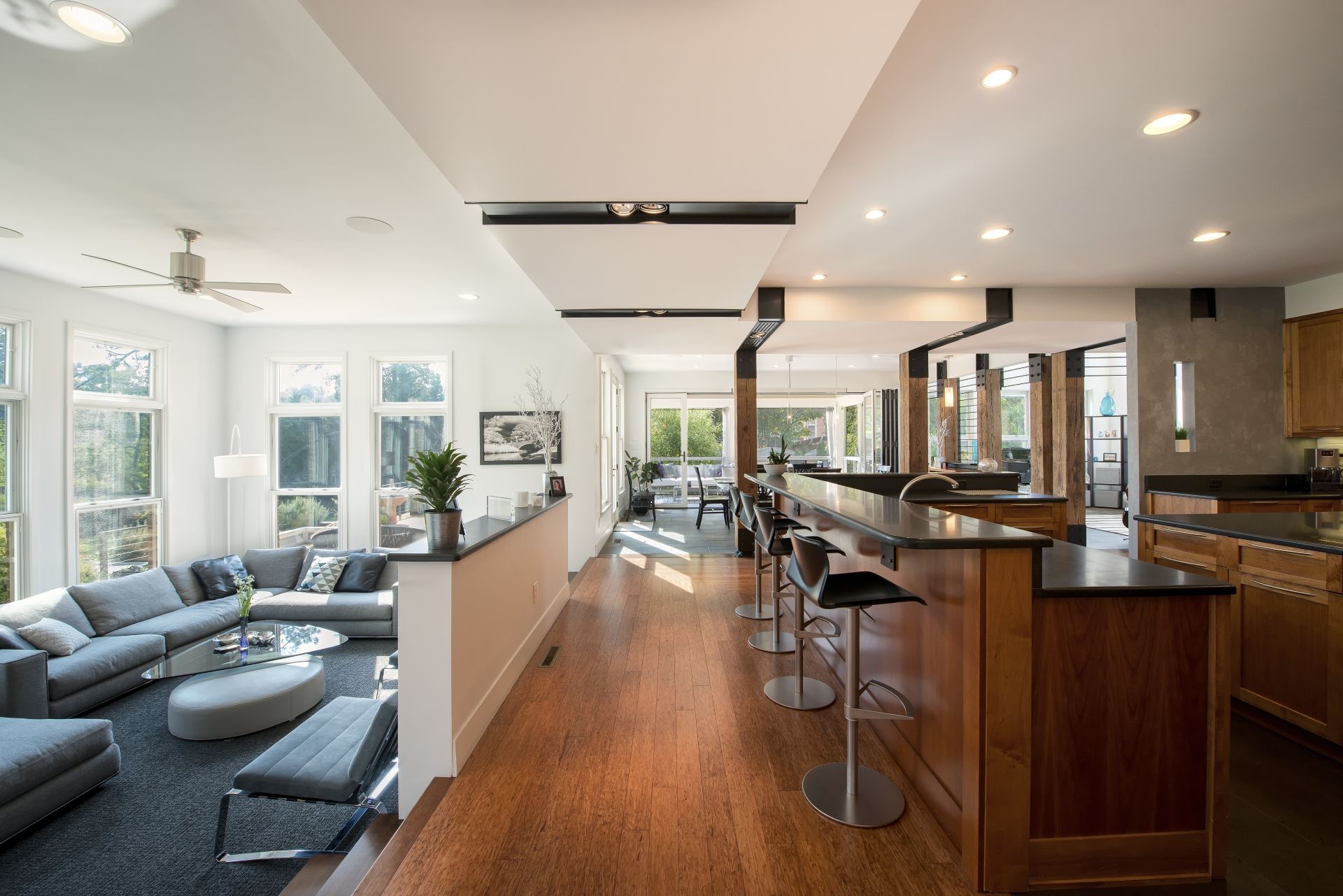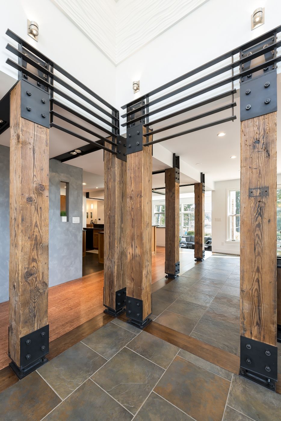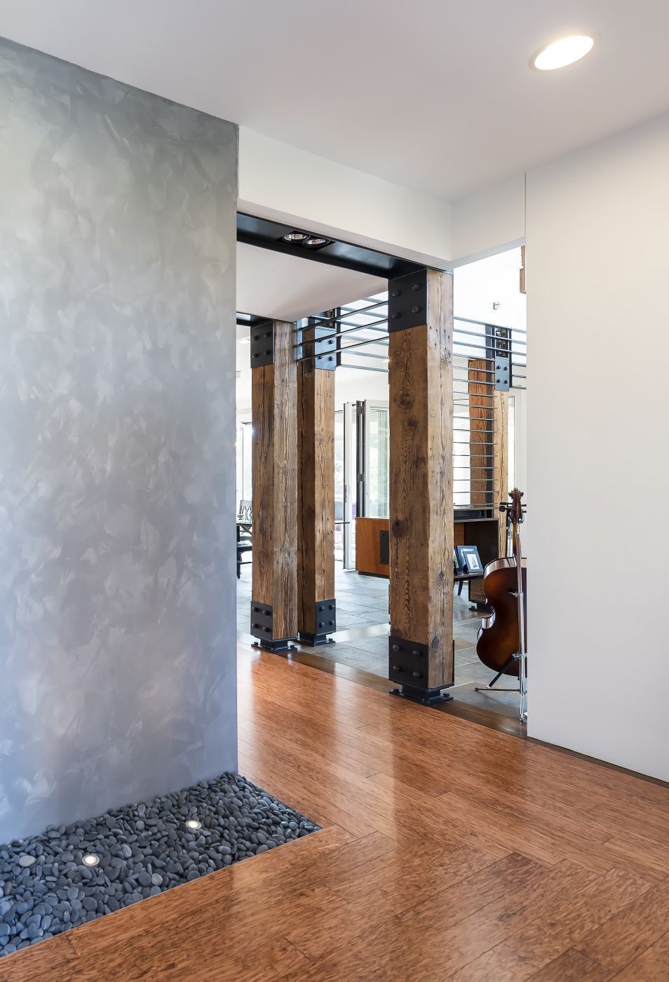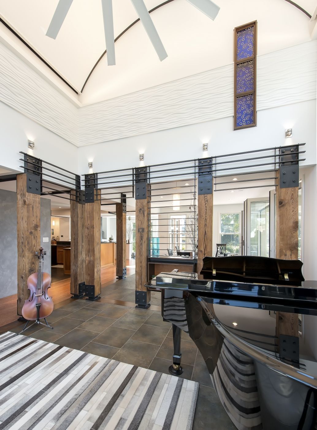 A ubiquitous spec home on the edge of a Chesapeake neighborhood has been transformed into a harmonious composition with connection to outside views. Formerly partitioned spaces were opened up to create light and flow, introducing a hierarchy of scale. The use of genuine reclaimed materials, such as timber columns from the old Norfolk Boat House, create new interest. With a fine level of detailing, including custom fabrication of screen walls, hardware, even furniture, the home becomes a composition of parts. The design includes niches for art display, and a barrel-vaulted ceiling in the music room.