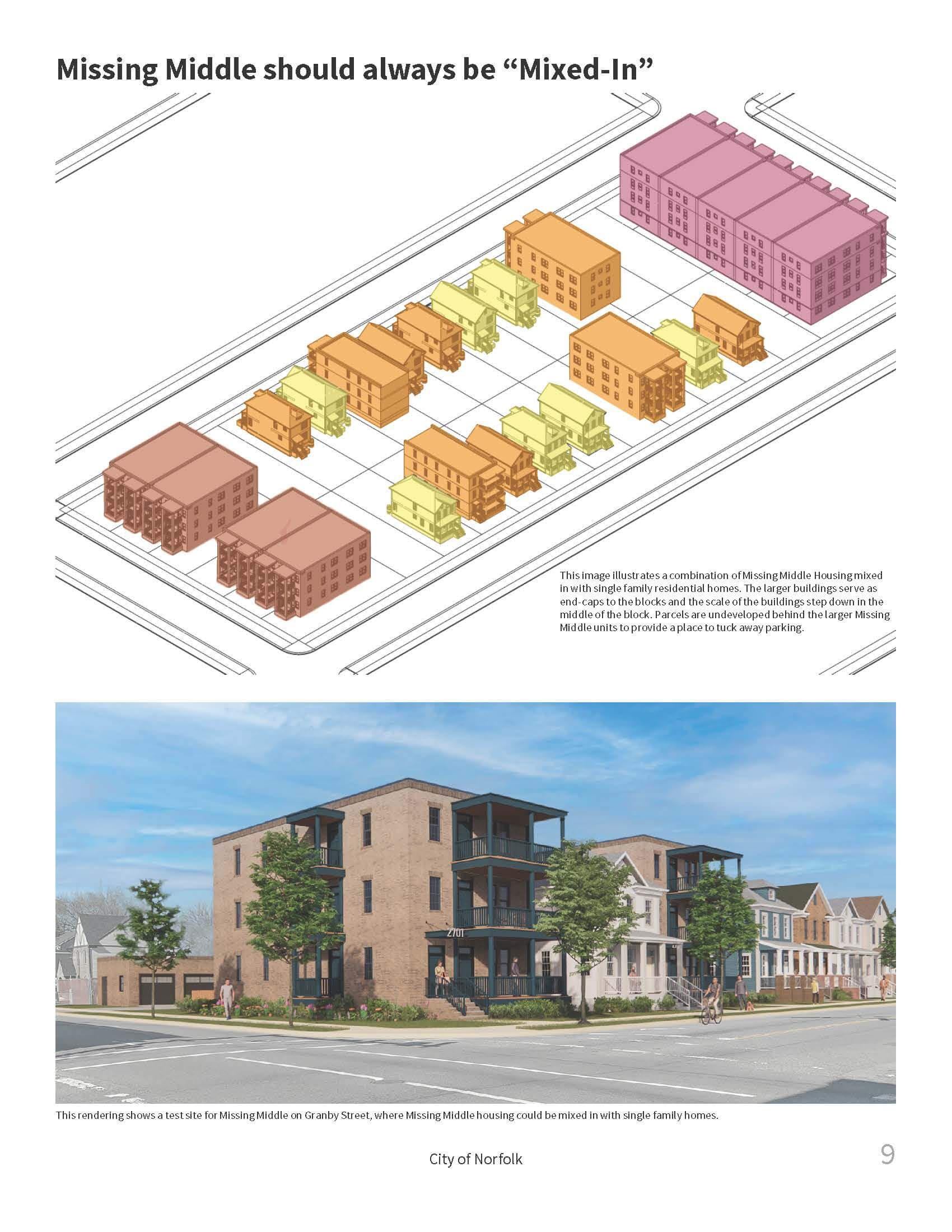 Norfolk’s plan aligns with a national movement to develop Missing Middle Housing, a term first coined in 2012 by Daniel Parolek of Opticos Design in Berkeley, California. The goal is to meet demand for walkable neighborhoods, offer housing at various price points, and respond to shifting demographics. Traditional zoning often requires large lots for single-family homes or consolidates lots for mid-rise apartment buildings—two forms that are incompatible in scale and fail to meet today’s housing needs. Missing Middle Housing bridges this gap, allowing for diverse ownership models and, most importantly, choice.